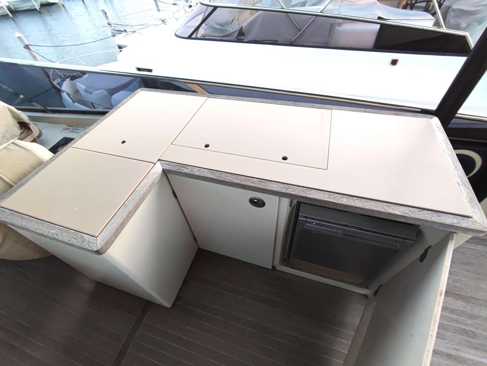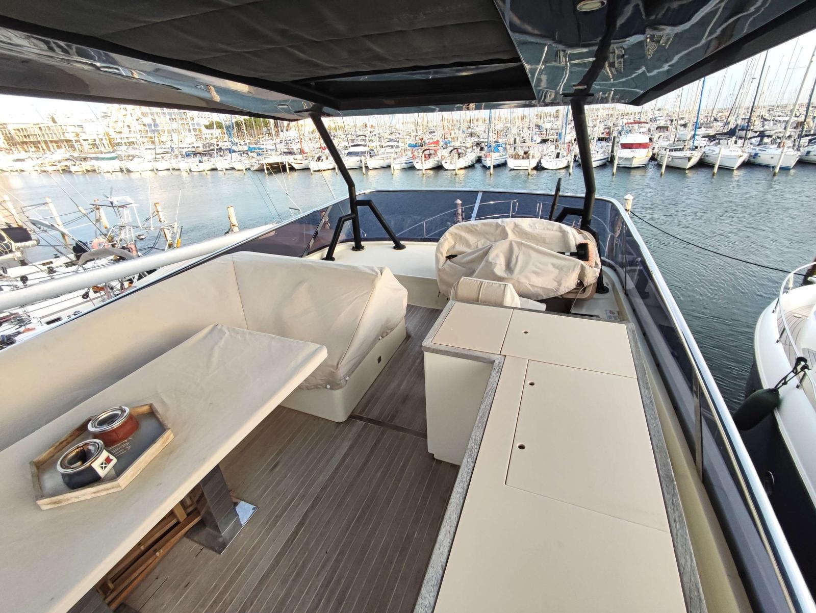 Extérieurement, grande plage arrière hydraulique, un fly énorme et une superbe plage avant avec transat électriques !