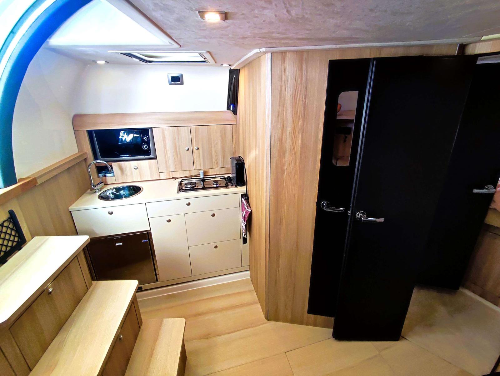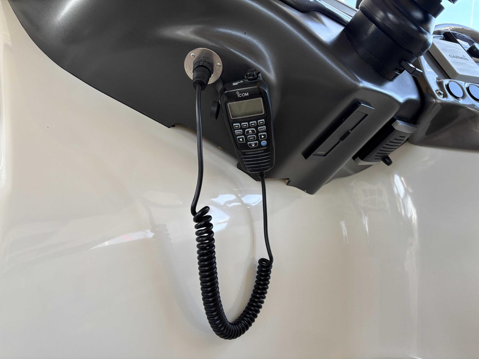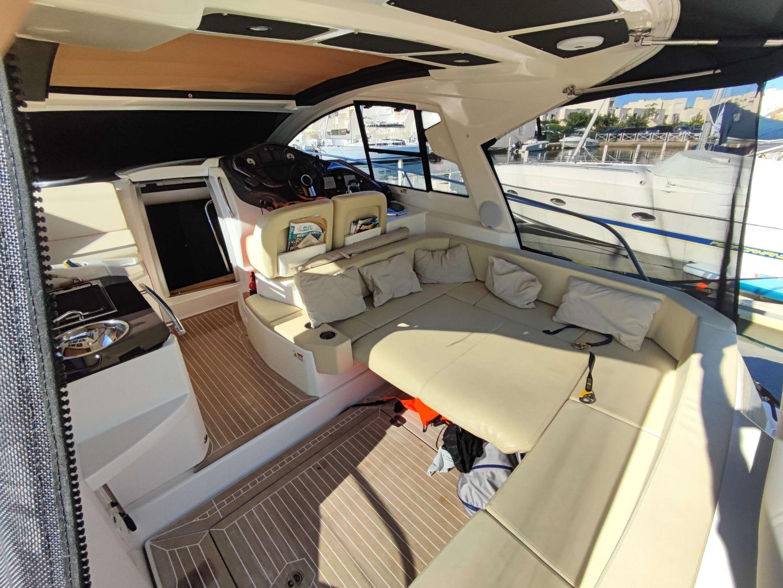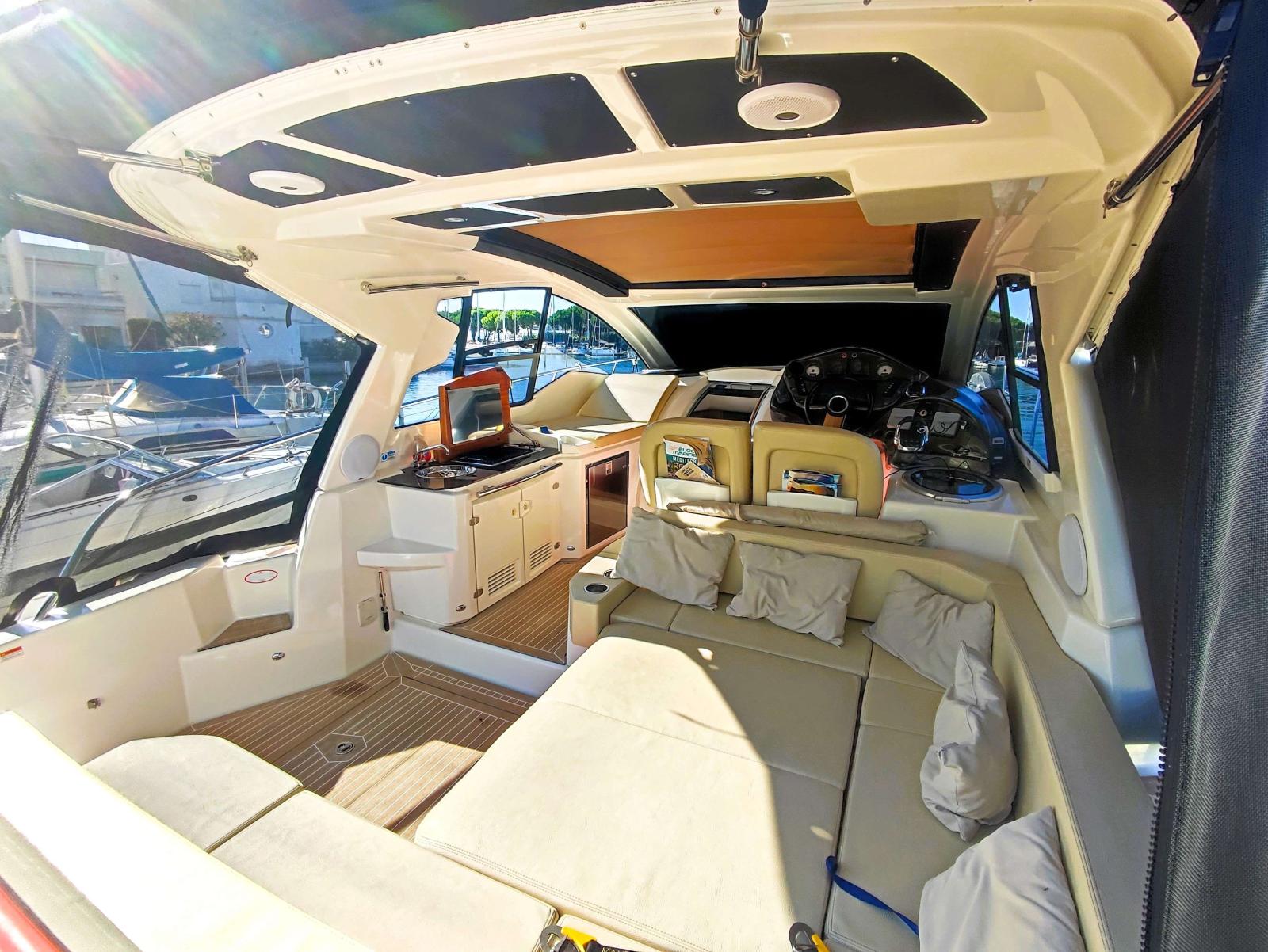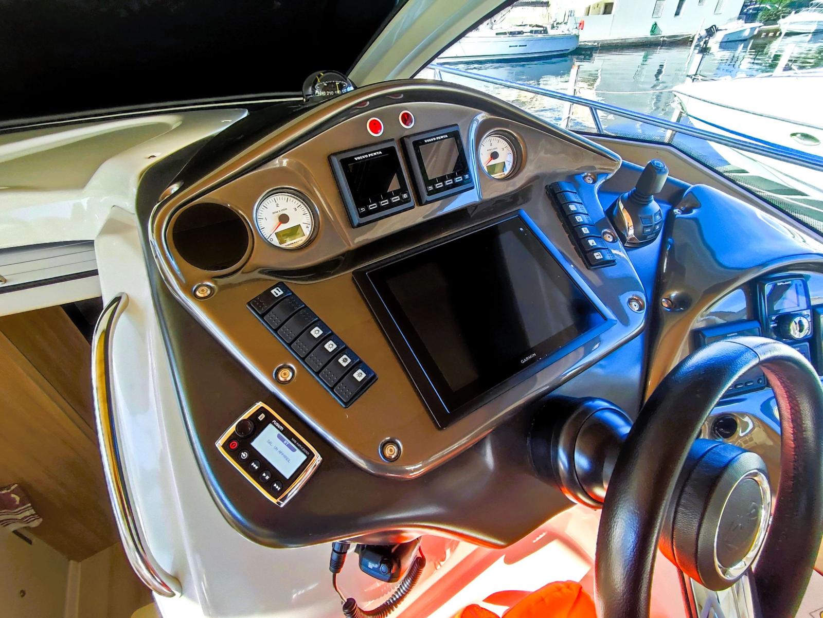 Sur bâbord se trouve la cuisine extérieure, puis sur tribord un poste de pilotage extrêmement bien équipé avec du matériel de dernière génération.