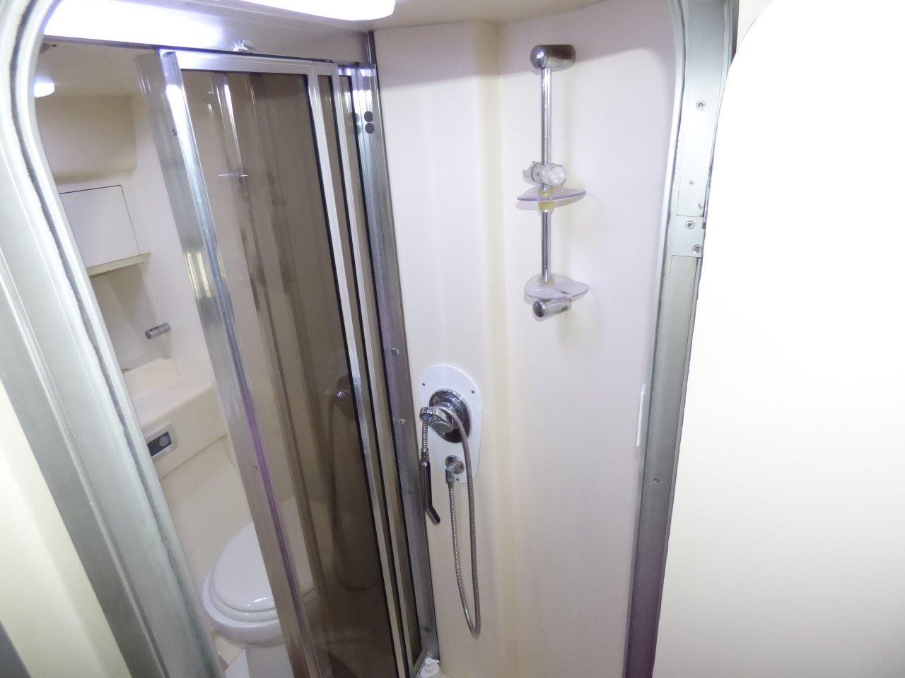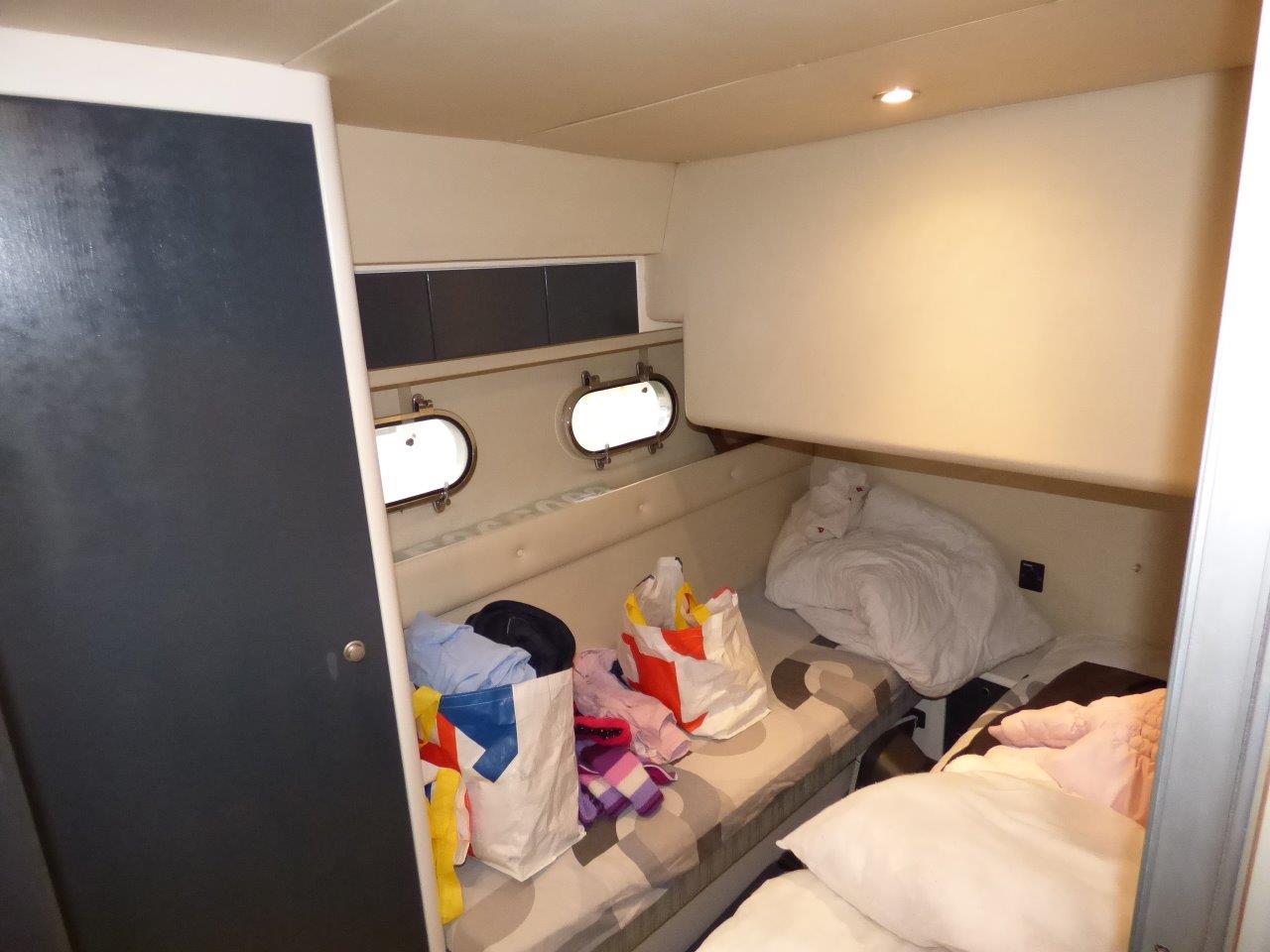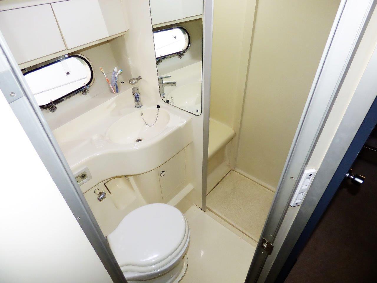 Cabine propriétaire avec grand lit central et salle d'eau, wc / douche séparée.