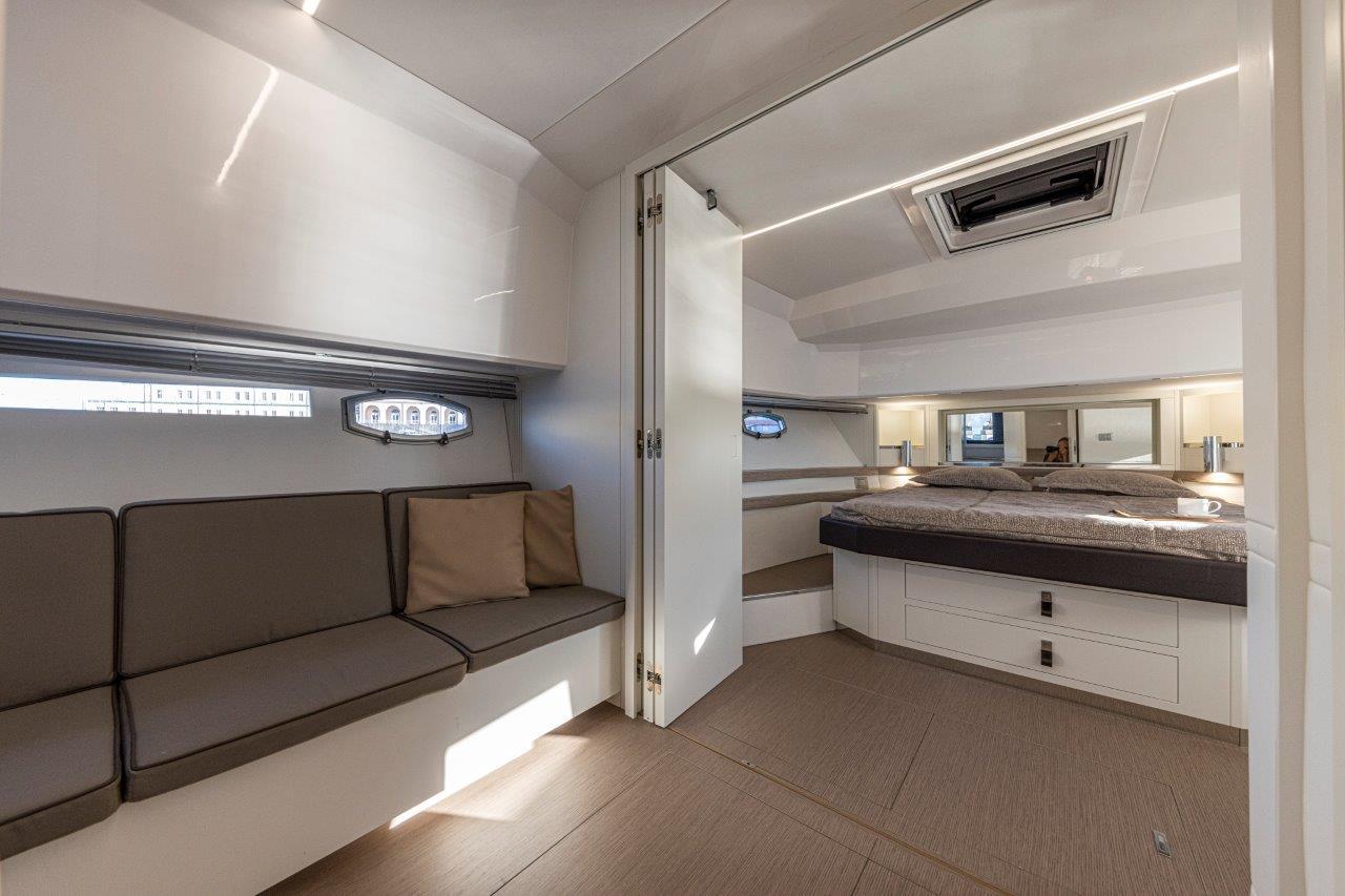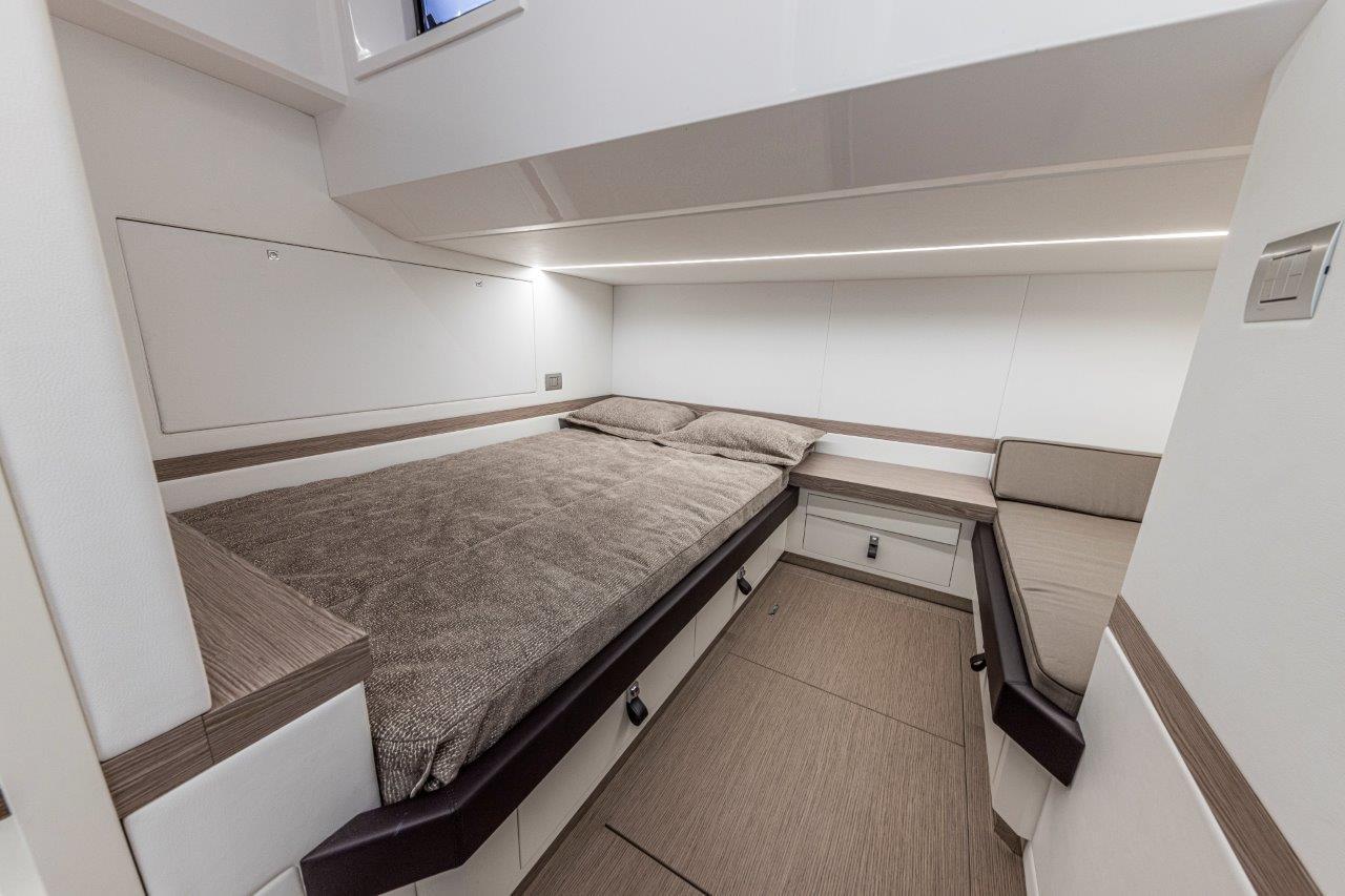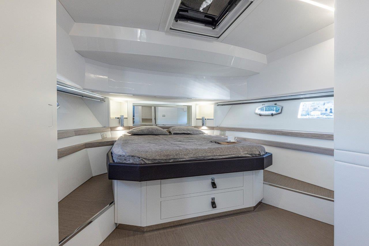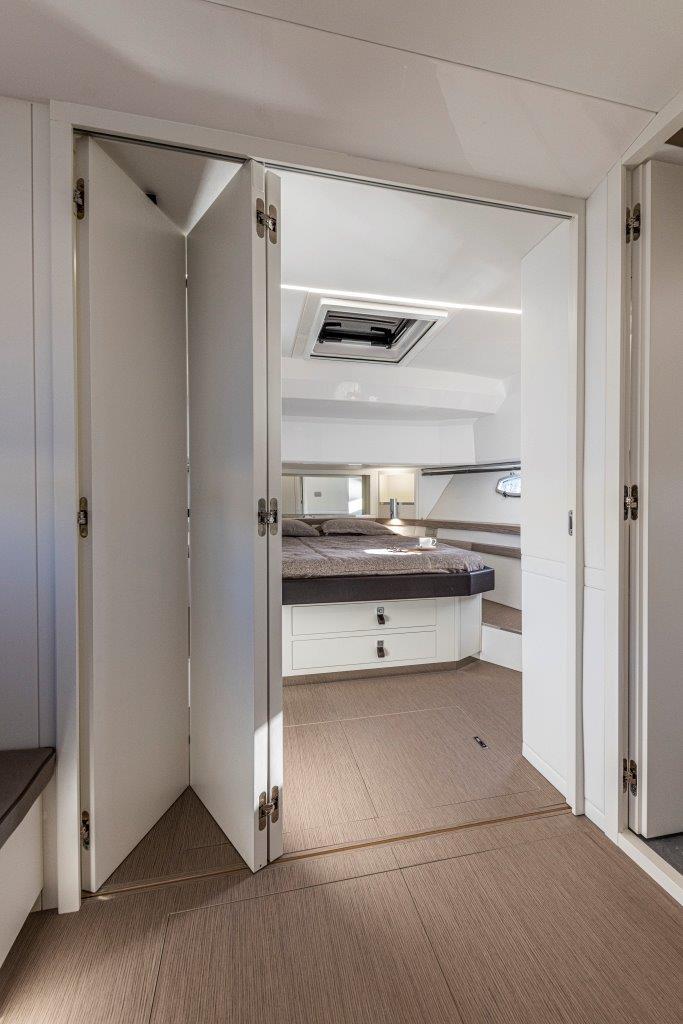 Au centre, une cuisine spacieuse open air sépare le cockpit de la zone de conduite. Technologique, fonctionnelle et pratique, elle est surplombée par un bimini , sportif et léger, qui est monté sur deux pieds (à l’inverse des quatre pieds présents sur les bateaux de la concurrence), offrant une bonne stabilité et une couverture généreuse. L’ajout d’un toit électrique au bimini et de deux tauds au style arabe à proue et à poupe permet de gérer avec facilité les exigences de bord en matière d’ombre et de soleil. Le passage à proue est ample, commode et sûr. Quelques pas suffisent pour arriver au divan double en proue, en face du bain de soleil sur le rouf. L’intérieur est caractérisé par un open space lumineux et soigné. Les cabines peuvent éventuellement être séparées par une paroi mobile pour créer une intimité essentielle et un confort exclusif lorsqu’il y a des invités à bord.