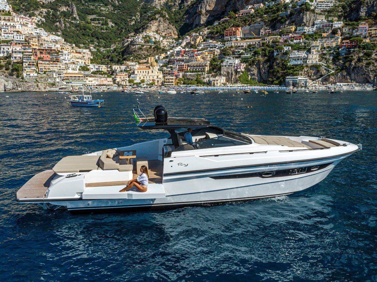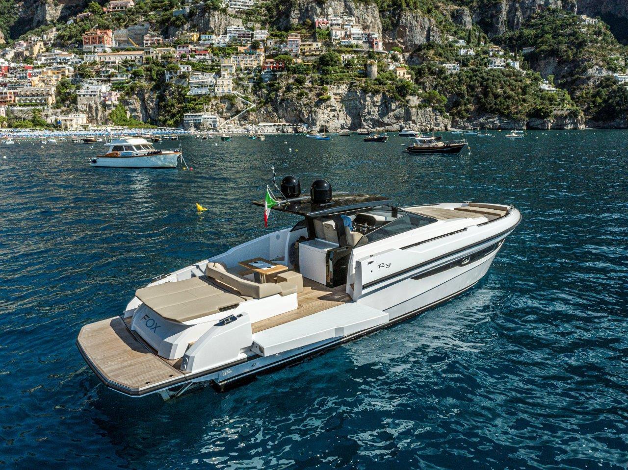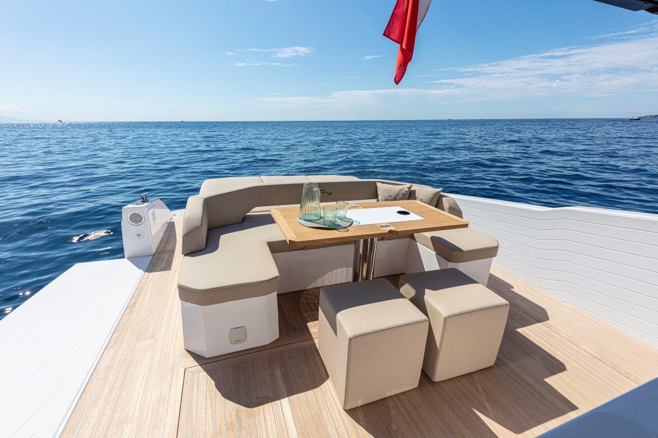 Au centre, une cuisine spacieuse open air sépare le cockpit de la zone de conduite. Technologique, fonctionnelle et pratique, elle est surplombée par un bimini , sportif et léger, qui est monté sur deux pieds (à l’inverse des quatre pieds présents sur les bateaux de la concurrence), offrant une bonne stabilité et une couverture généreuse. L’ajout d’un toit électrique au bimini et de deux tauds au style arabe à proue et à poupe permet de gérer avec facilité les exigences de bord en matière d’ombre et de soleil. Le passage à proue est ample, commode et sûr. Quelques pas suffisent pour arriver au divan double en proue, en face du bain de soleil sur le rouf. L’intérieur est caractérisé par un open space lumineux et soigné. Les cabines peuvent éventuellement être séparées par une paroi mobile pour créer une intimité essentielle et un confort exclusif lorsqu’il y a des invités à bord.