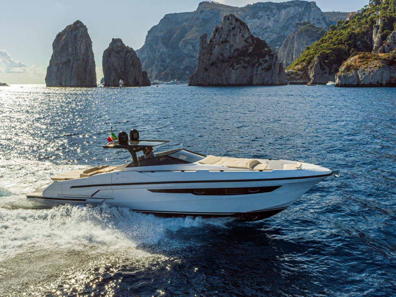 Le pare-brise enveloppant offre une visibilité parfaite. La proue élancée reflète une conception à forte personnalité. En poupe, le cockpit est vaste, avec un bain de soleil généreux pouvant contenir une annexe.
