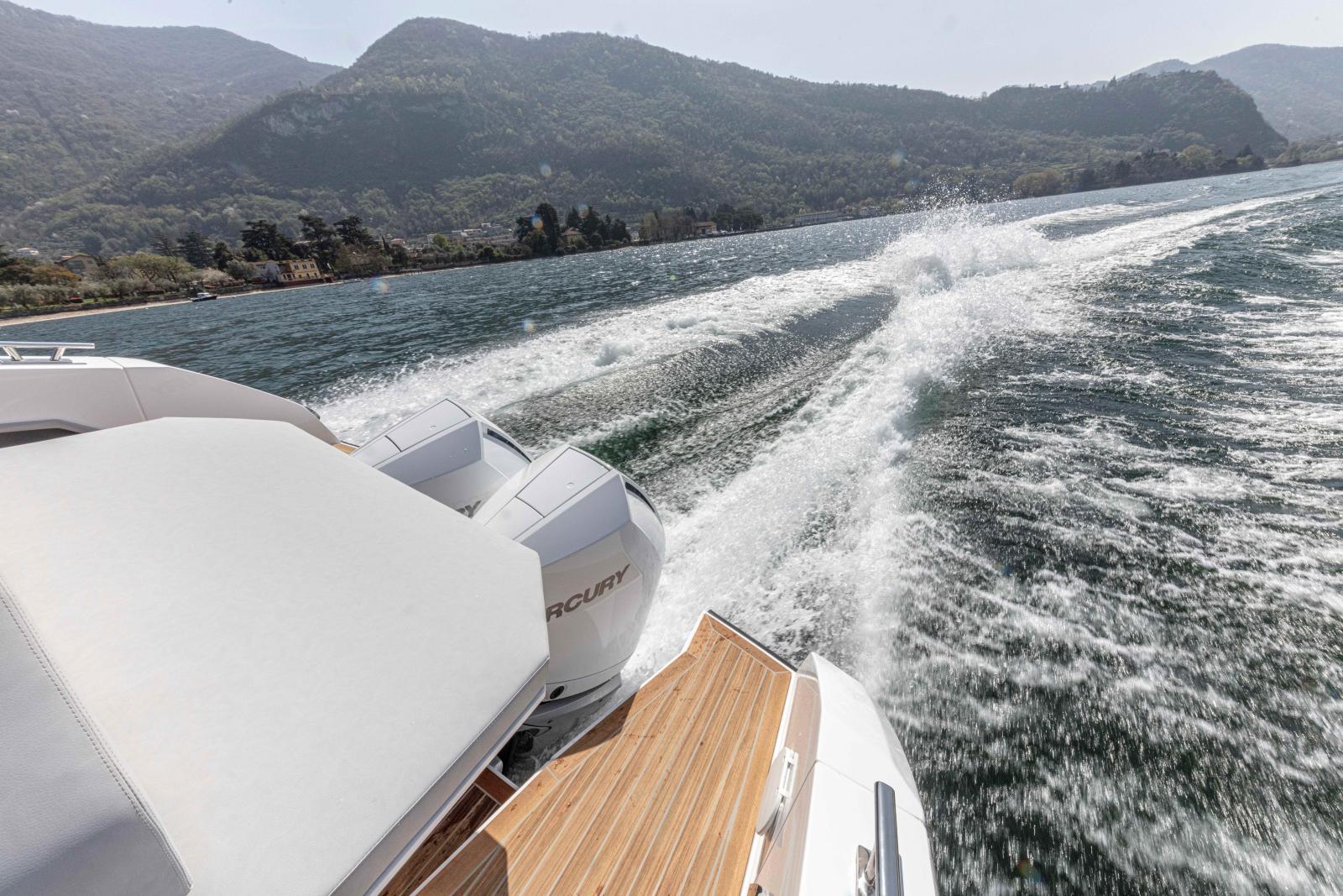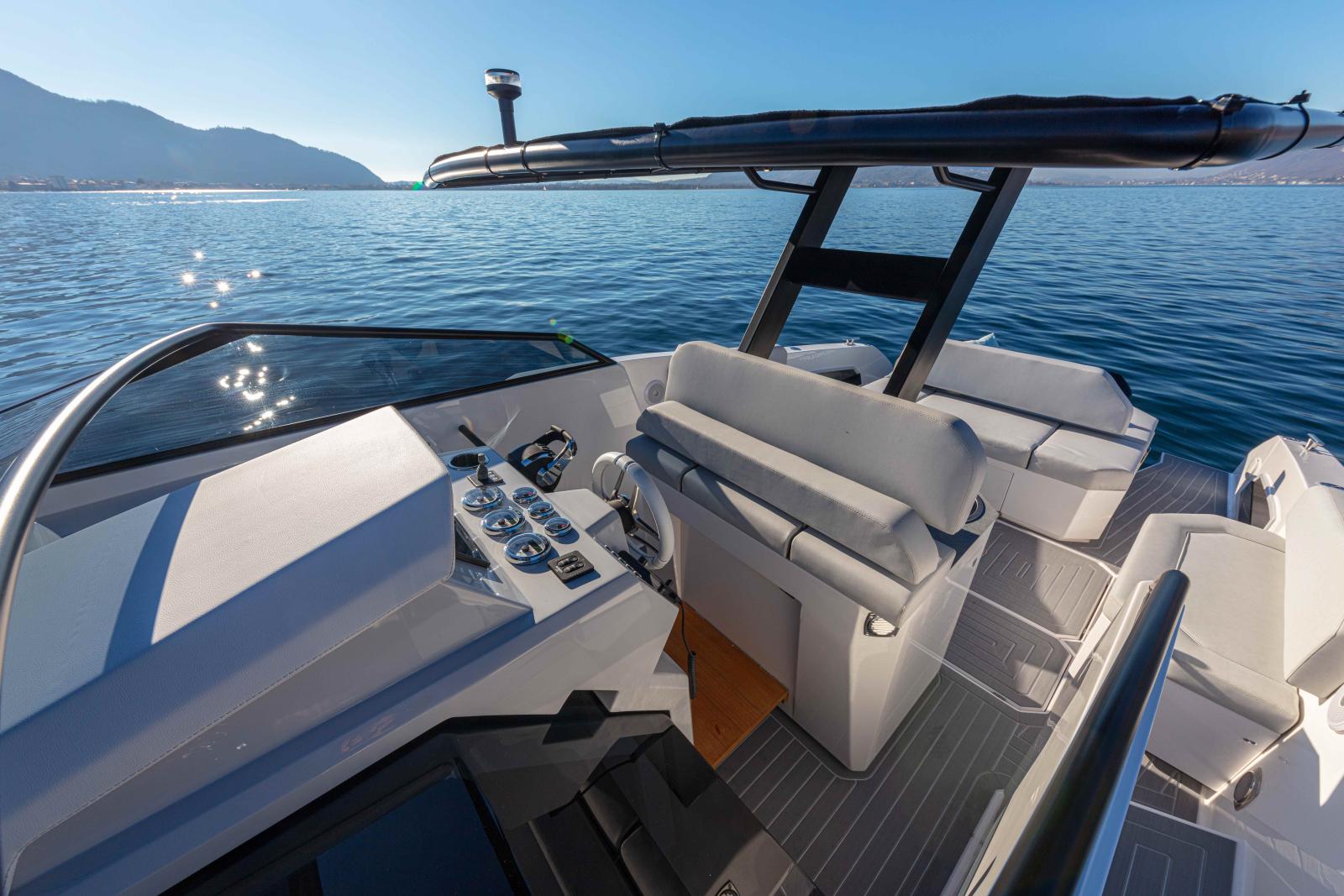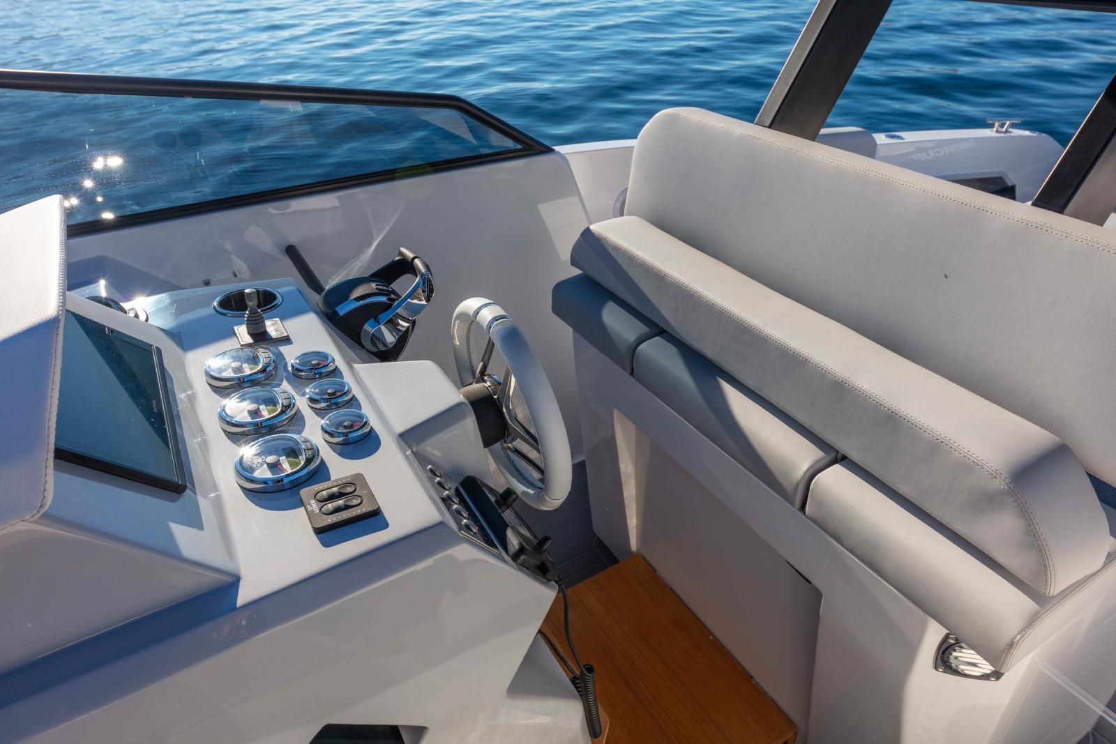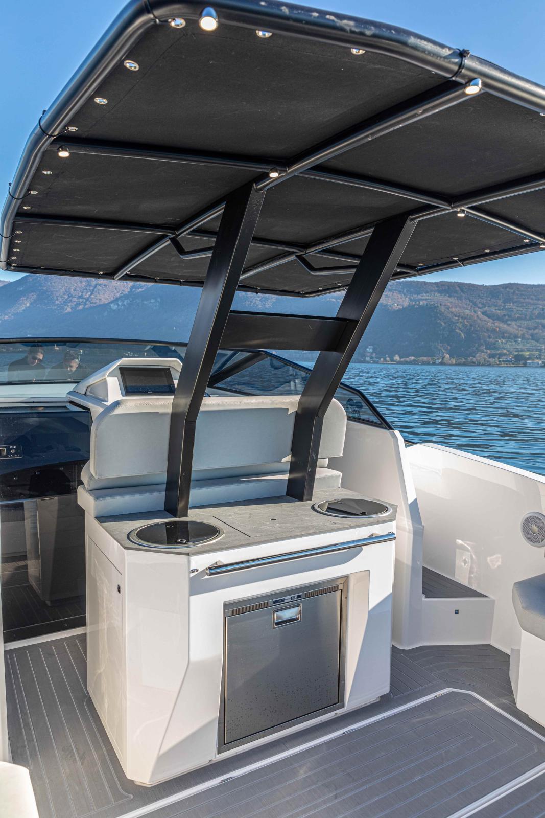 Bref, un dessin sculpté par le vent et vraiment très réussit. En s’approchant d’un peu plus près, le Rio apparaît sous sa véritable apparence, celle d’un day cruiser de type walk around. On circule ainsi facilement tout autour de la proue, un avantage lors des manoeuvres.