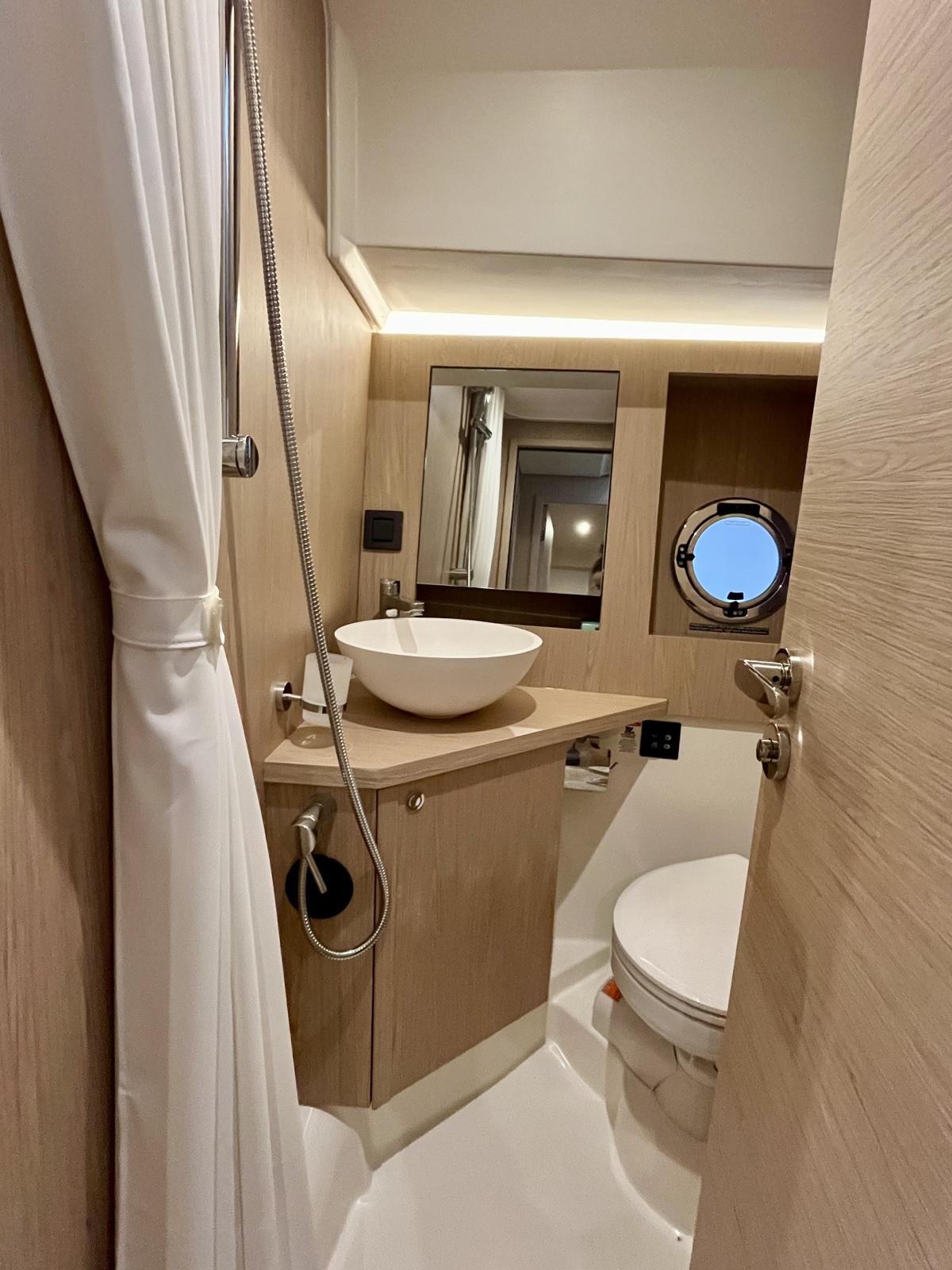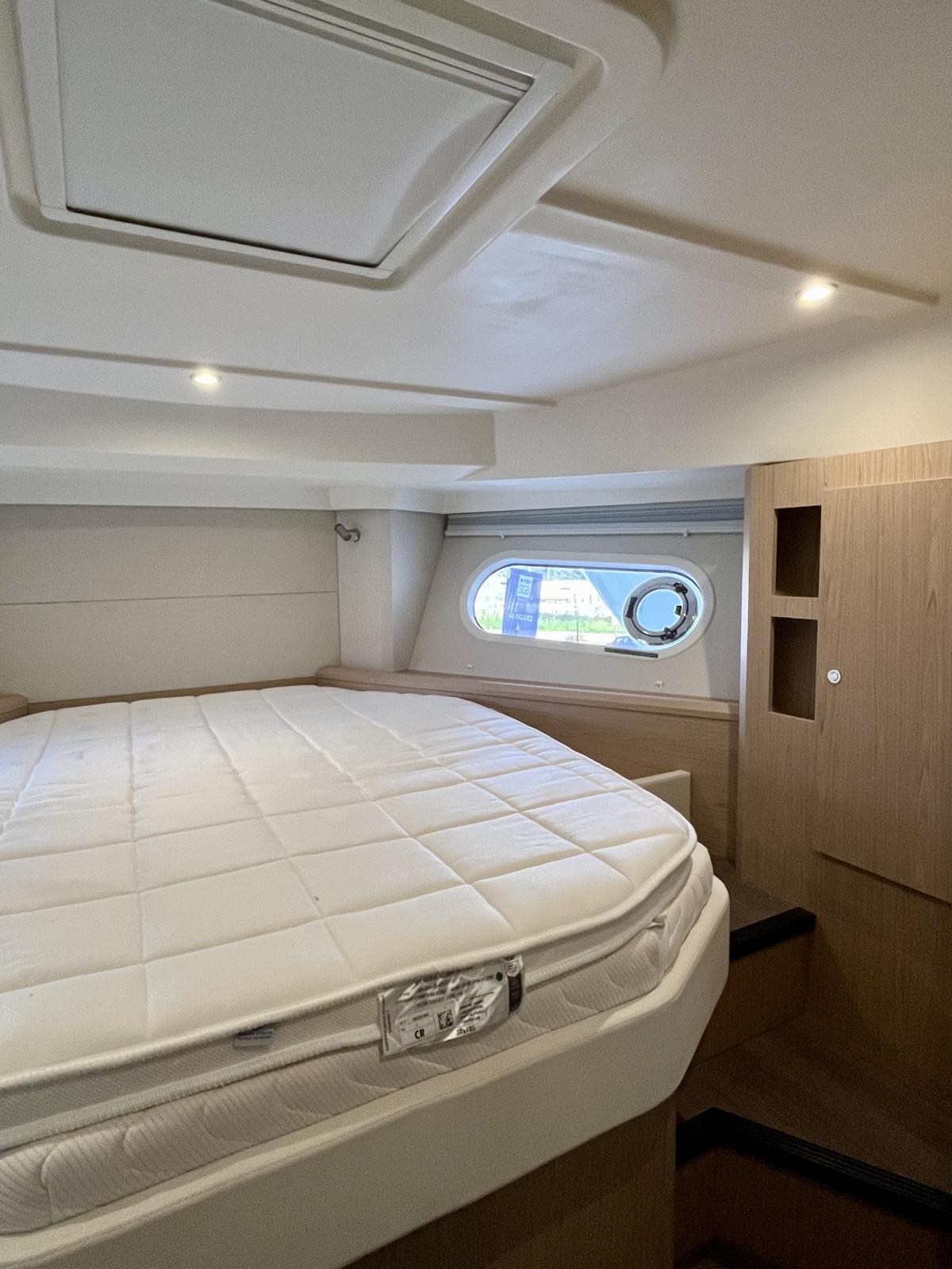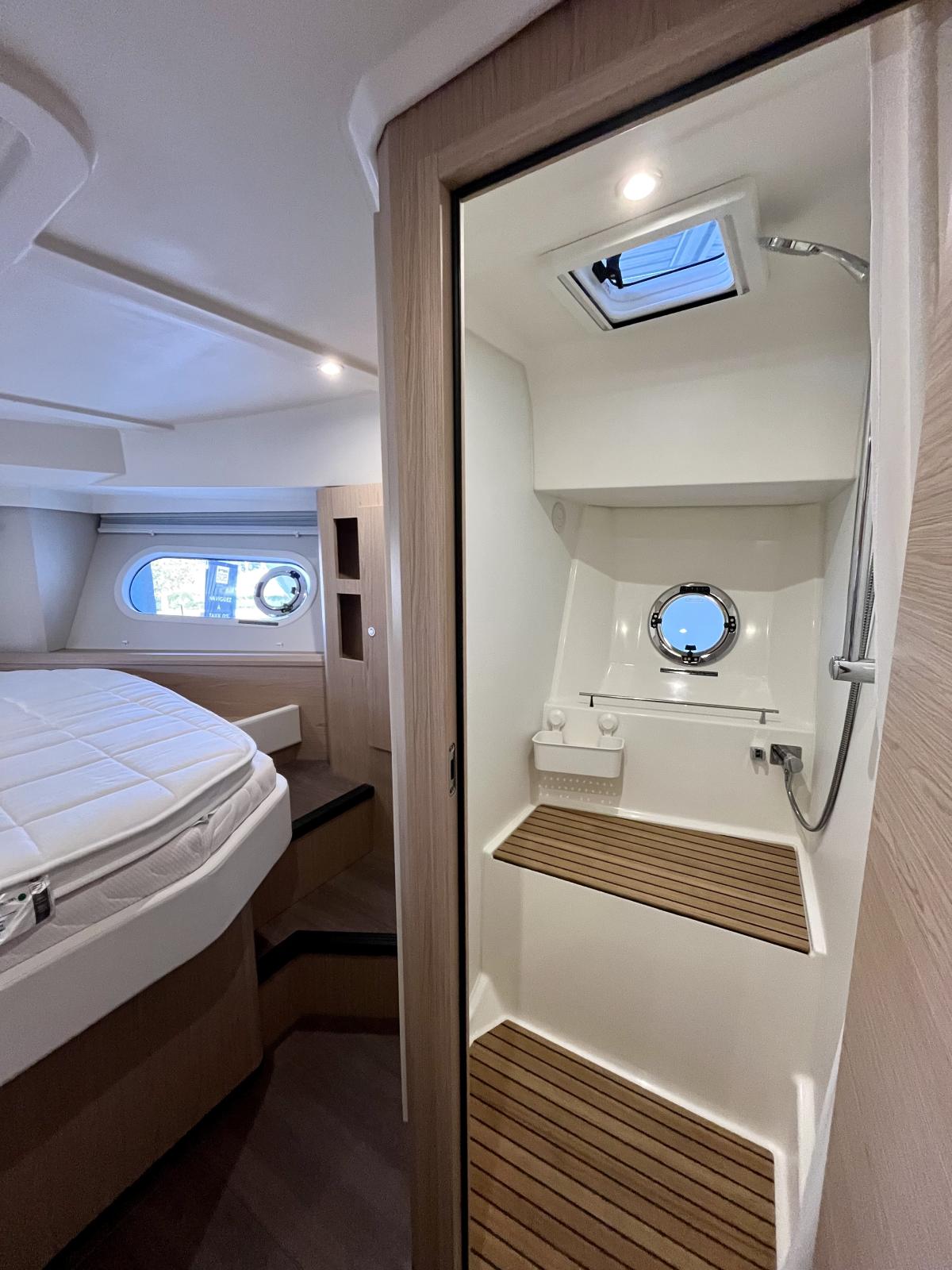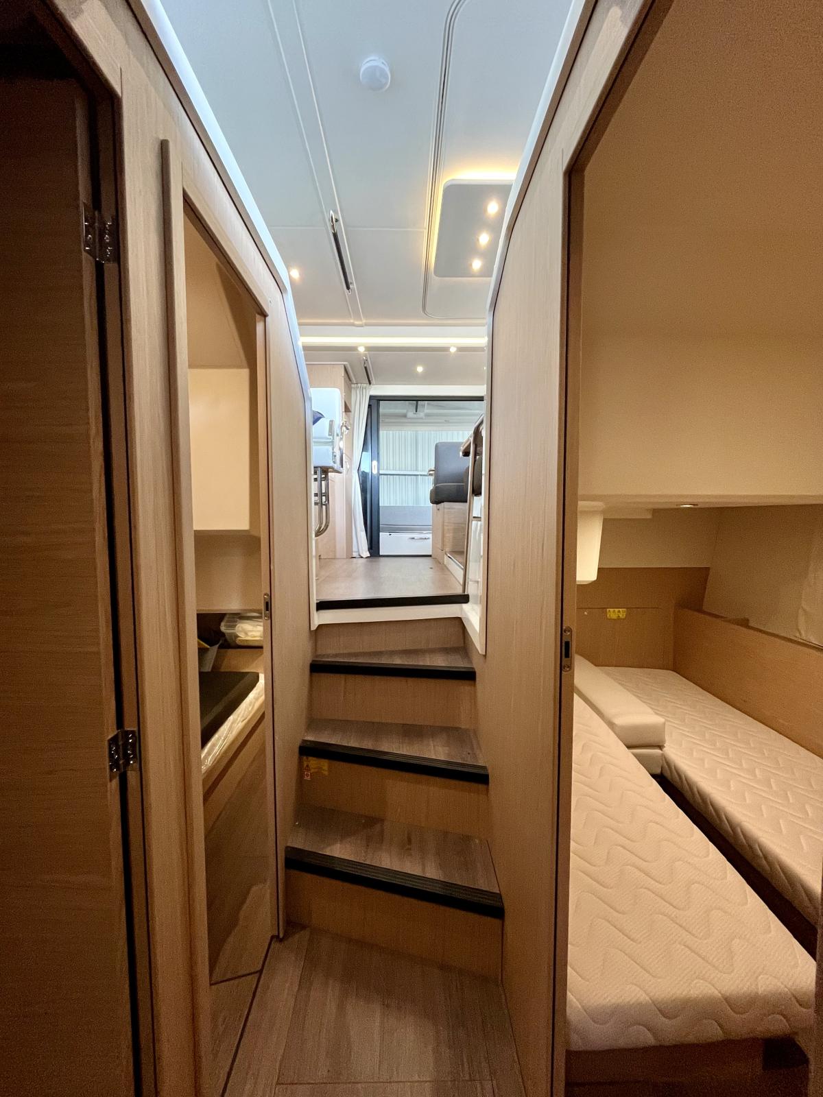 Le bateau est motorisé en Yanmar 8LV320 2X320, version 3 cabines et deux salles d'eau Alpi chêne dosse.