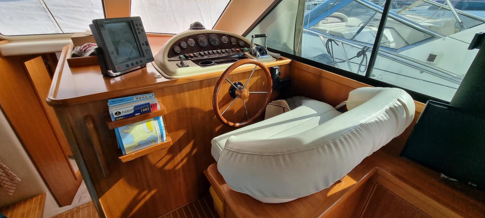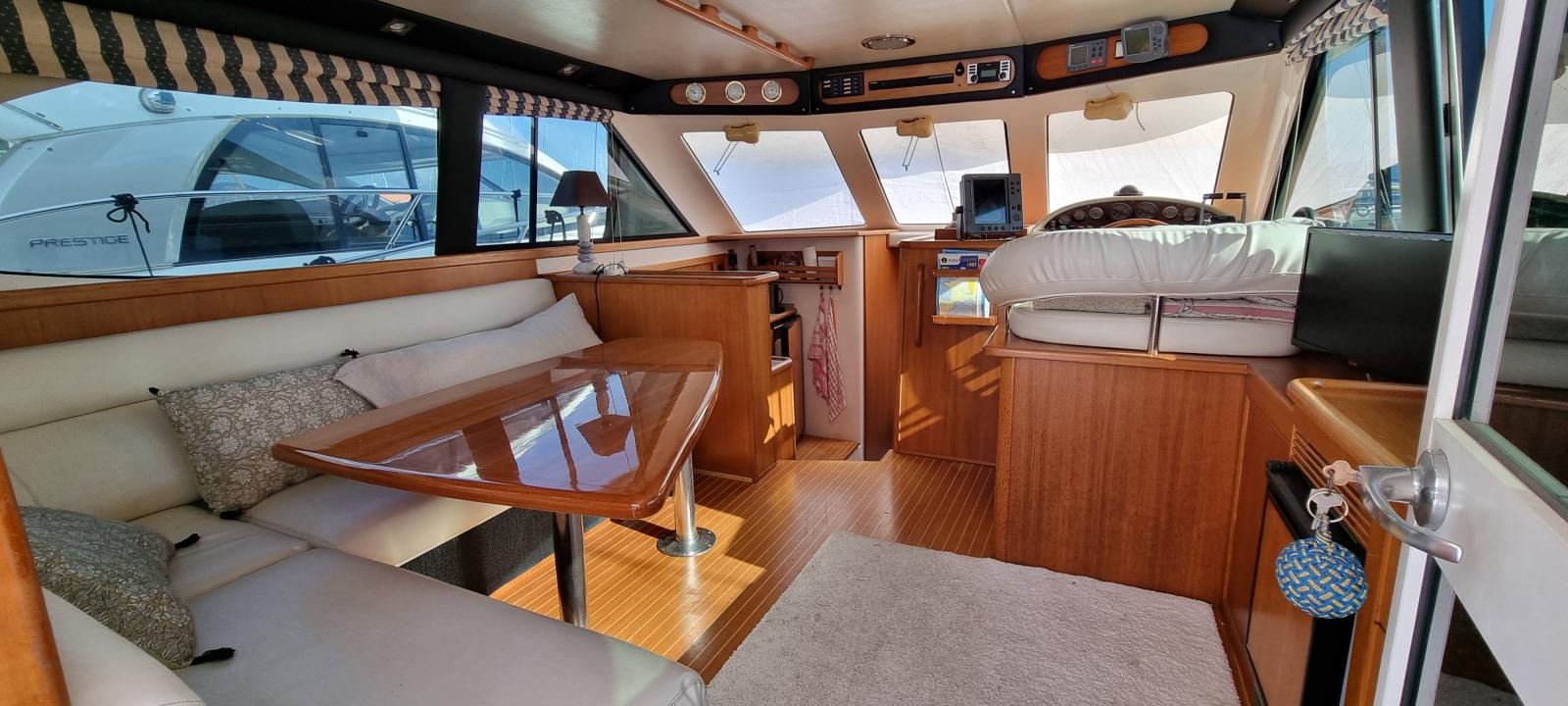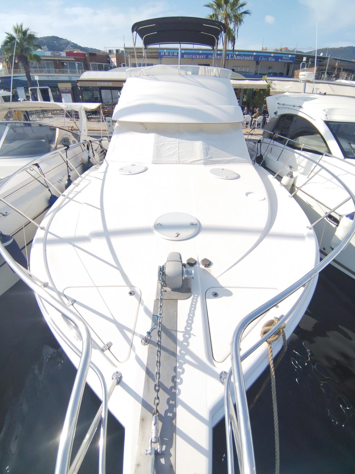 À l'intérieur, le yacht offre luxe et confort avec un salon bien aménagé, une cuisine entièrement équipée . Au-dessous du pont, il dispose de deux cabines qui peuvent accueillir confortablement jusqu'à cinq invités, ainsi qu'une salle de bain moderne. L'agencement est conçu pour maximiser l'espace et offrir un environnement détendu, que vous soyez en mer ou à quai.