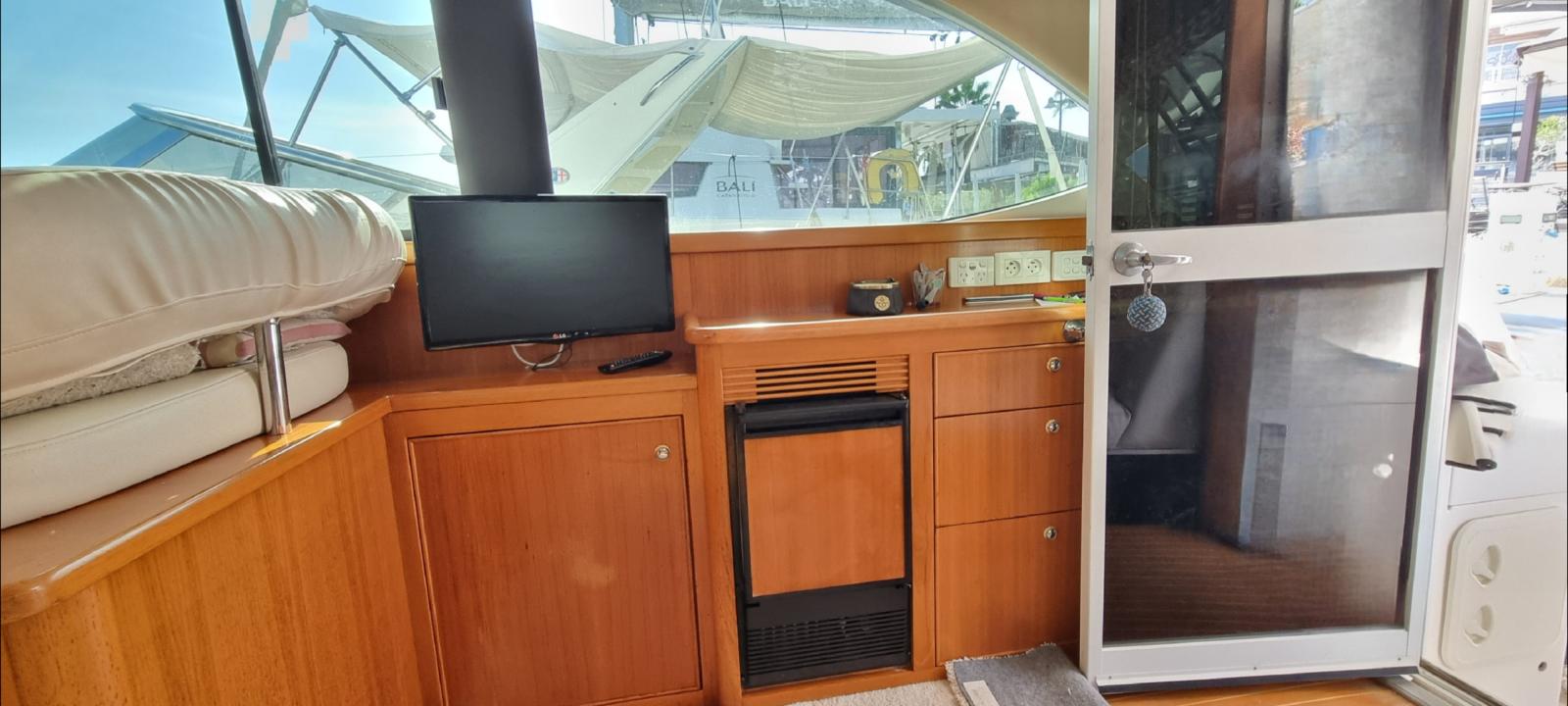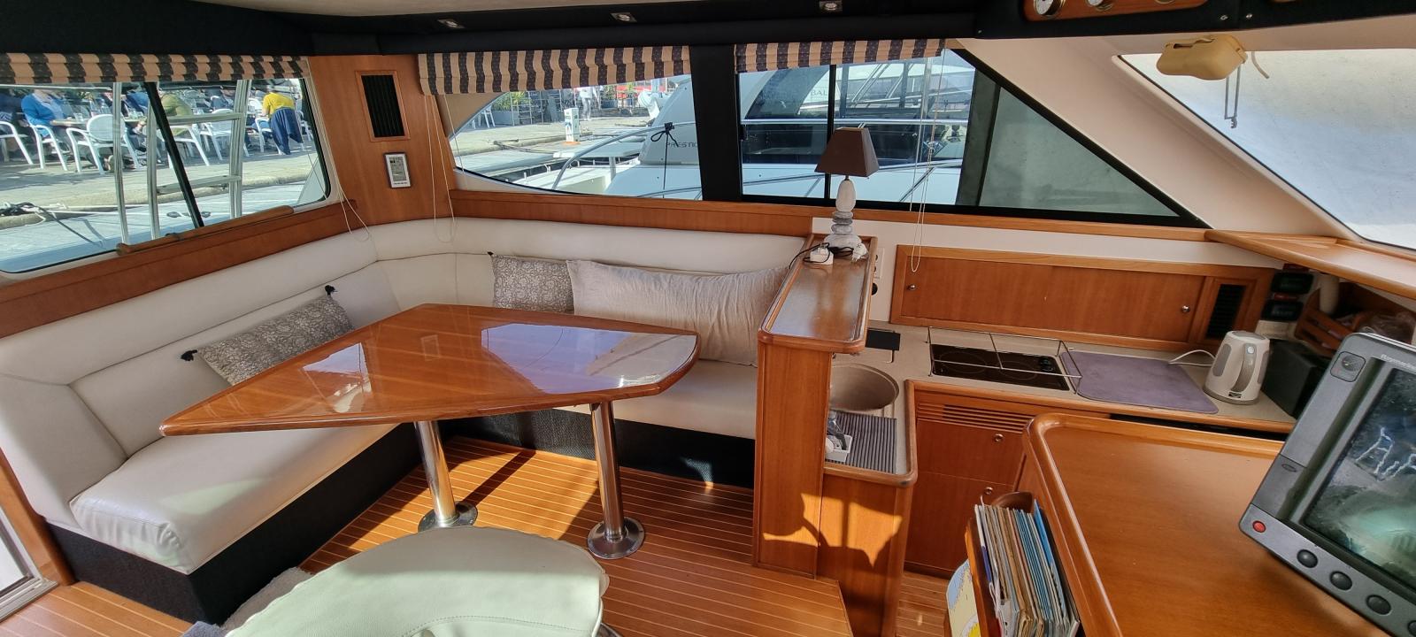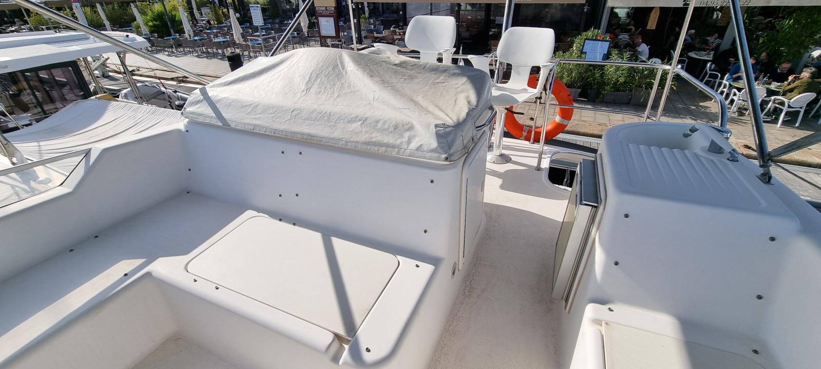 À l'intérieur, le yacht offre luxe et confort avec un salon bien aménagé, une cuisine entièrement équipée . Au-dessous du pont, il dispose de deux cabines qui peuvent accueillir confortablement jusqu'à cinq invités, ainsi qu'une salle de bain moderne. L'agencement est conçu pour maximiser l'espace et offrir un environnement détendu, que vous soyez en mer ou à quai.