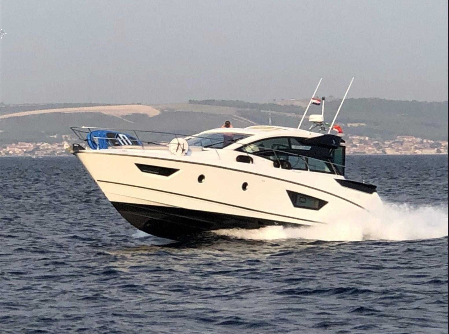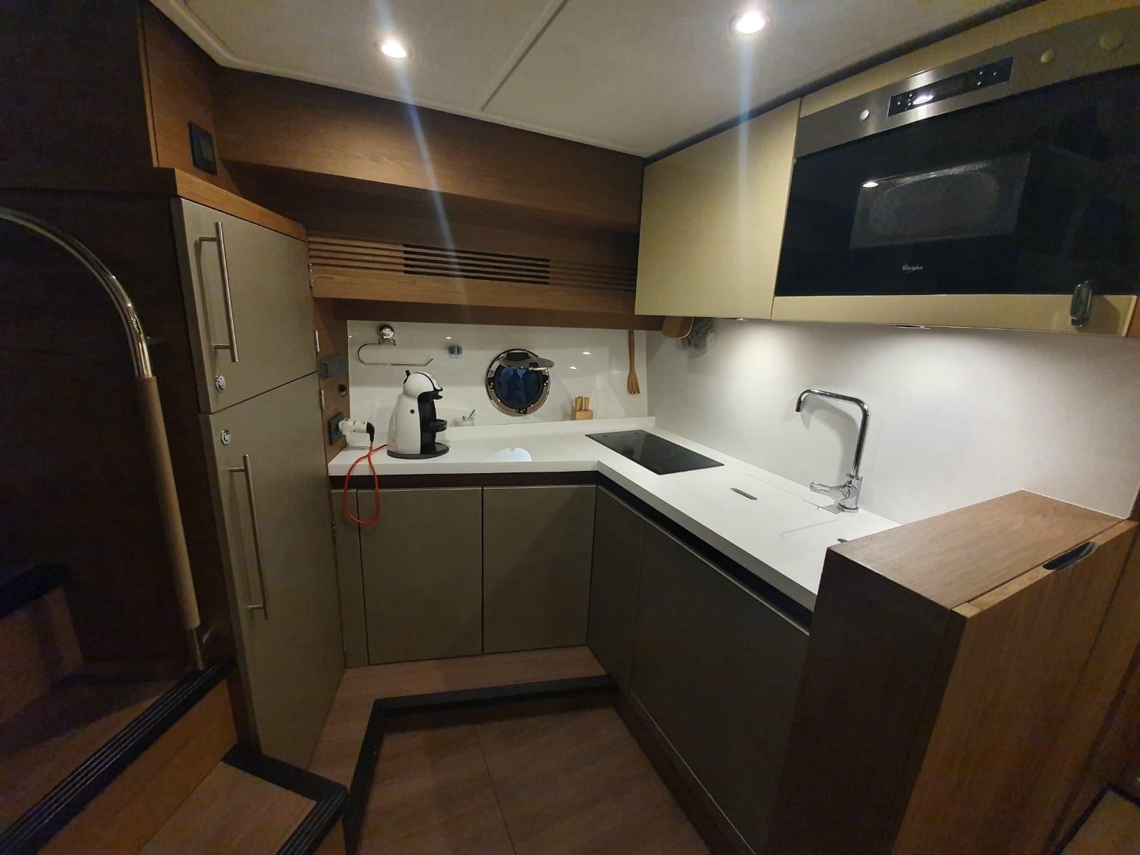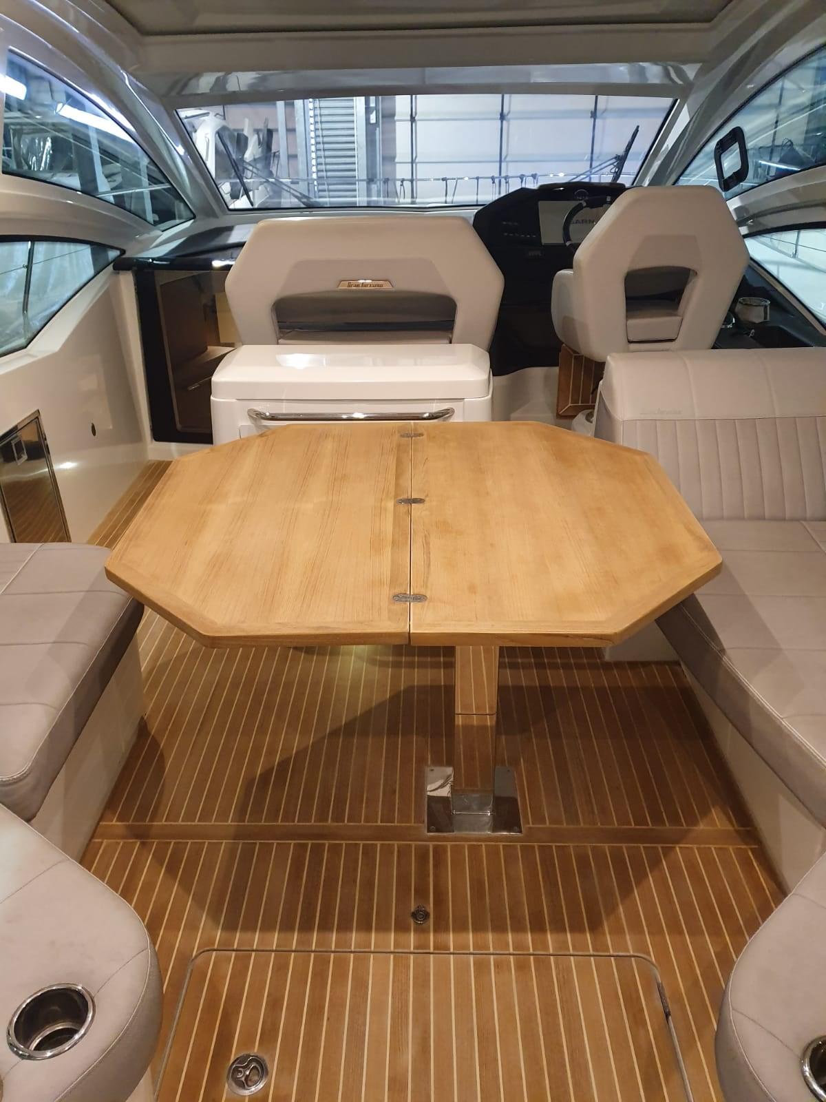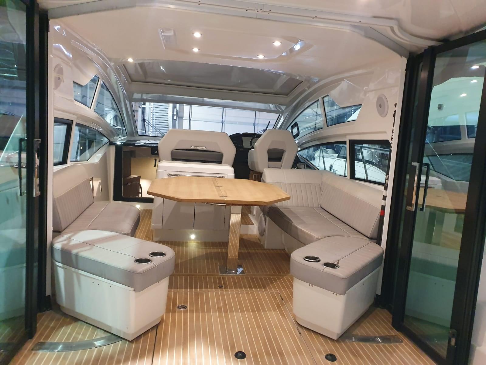 Alarme de pompe de cale, Eau sous pression, Batteries (115), Douche de cockpit, Flaps électriques, Hard top, Lavabo dans le cockpit, Éclairage de courtoisie, Spots sous-marins, Passerelle, Plateforme arrière, Porte latérale, Cockpit en teck, Prise de quai, Connexion eau sous pression à quai, Guindeau électrique, Echelle de bain, table de cockpit, Table pliante de salon, Corne.