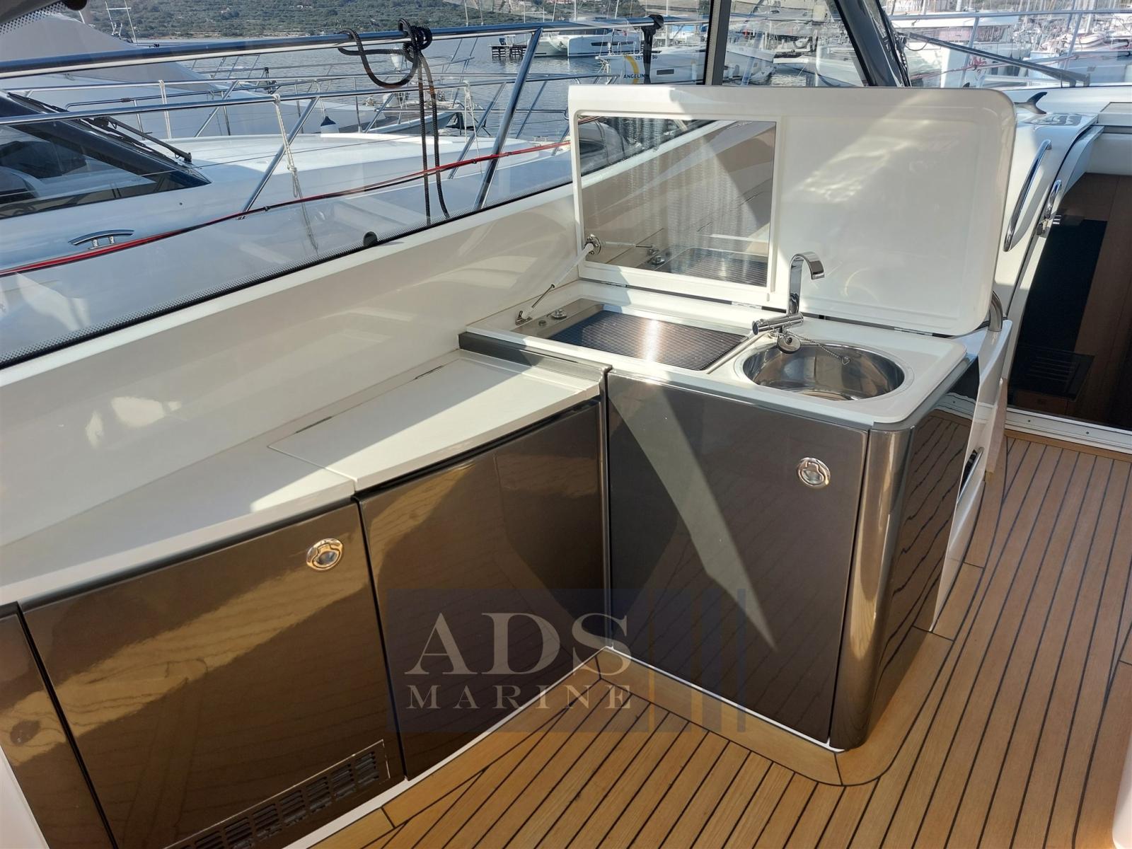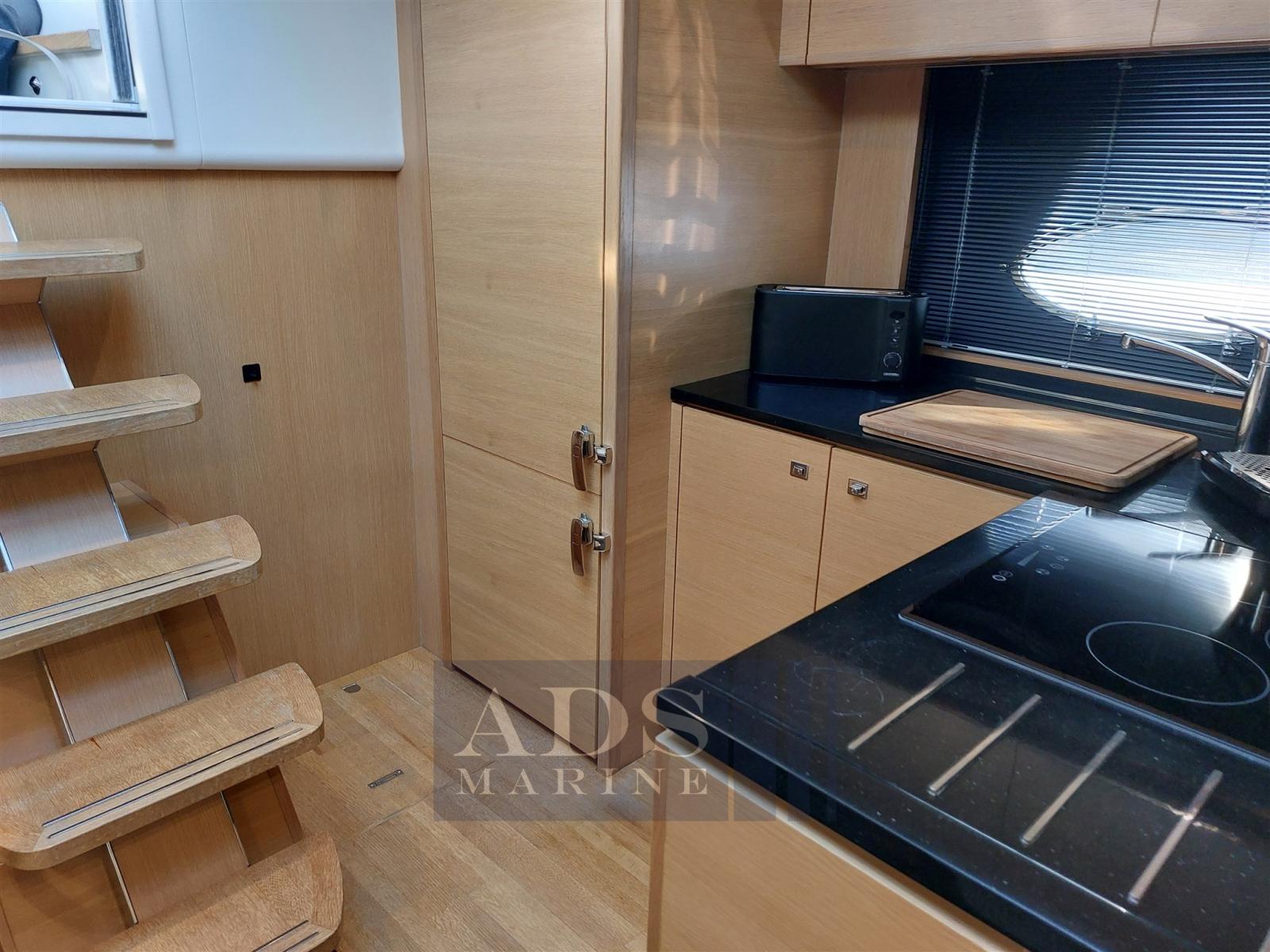 Cuisine : évier, grand réfrigérateur Waeco, plaque de cuisson en céramique avec 3 plaques, micro-ondes Panasonic, lave-vaisselle Fisher & Paykel, hotte