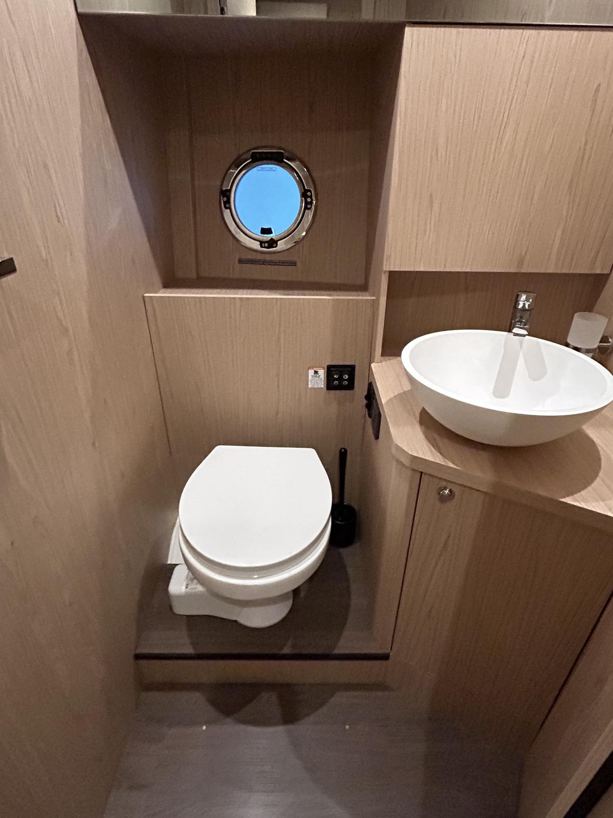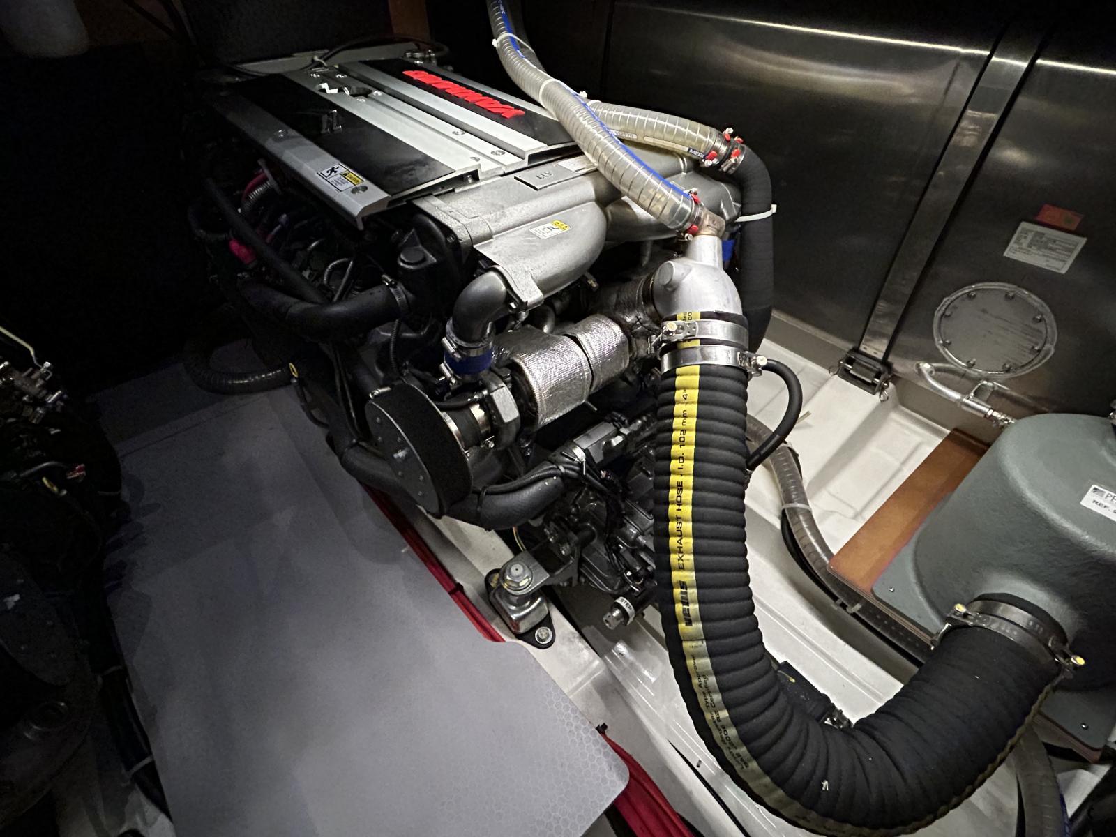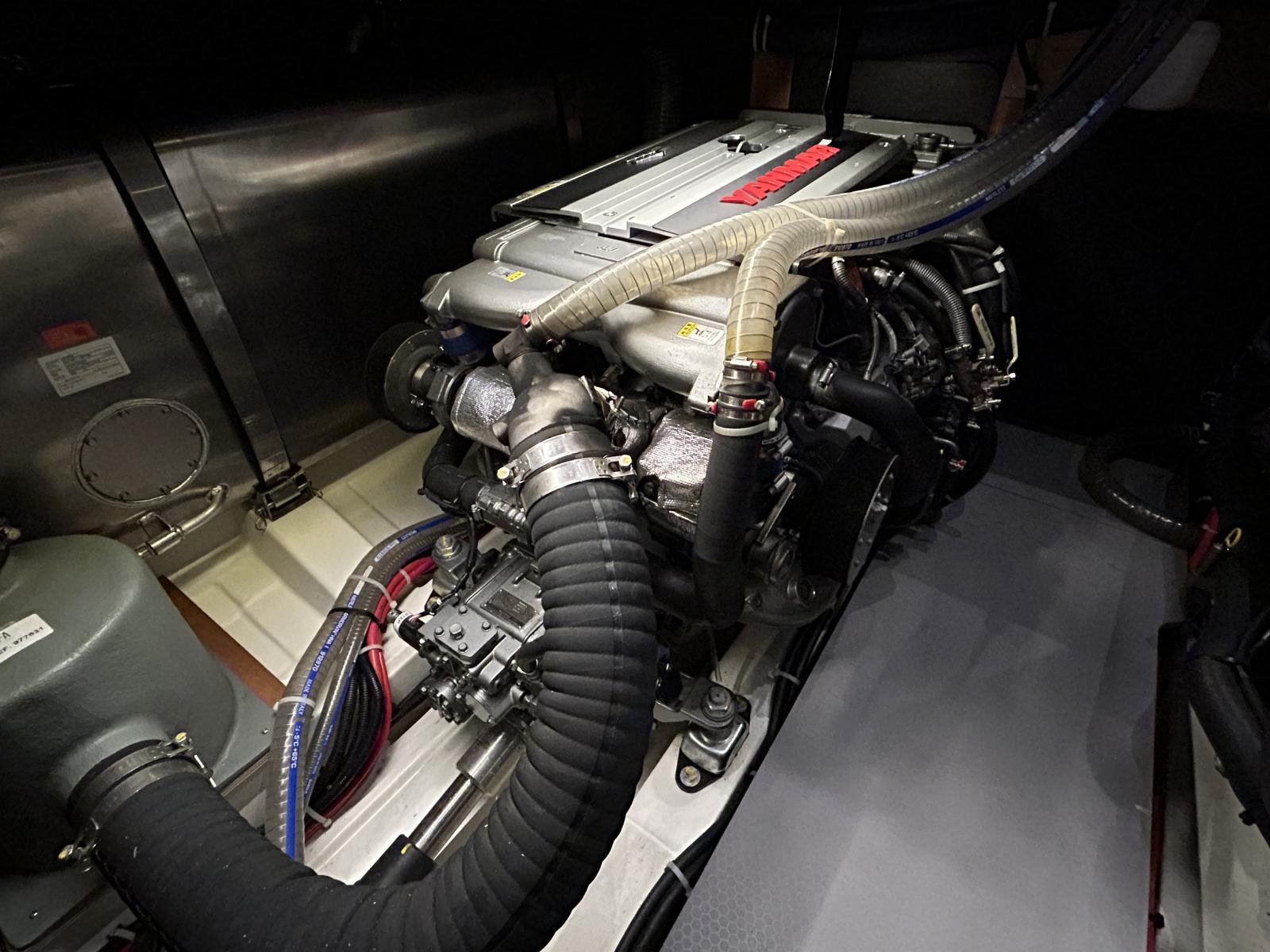 Le bateau est motorisé en Yanmar 8LV320 2X320, version 3 cabines et deux salles d'eau Alpi chêne dosse.