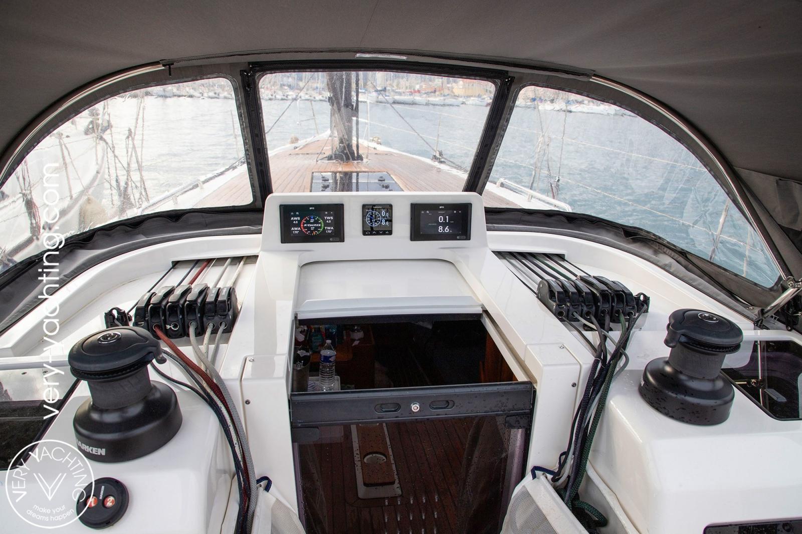 Ancre (Delta 20kg), 4 Batteries (3 x110A/12V (service), 1 70Ah Moteur), Passavant en teck, Chargeur de batterie (Victron 12/220V), Douche de cockpit, Double barre à roue (Carbonautica), Propulseur d'étrave (Maxpower rétractable), Éclairage de courtoisie, Moteur d'annexe (Torquedo électrique), Cockpit en teck, Guindeau électrique, Gréement Rod, table de cockpit (Teck), Annexe (Plastimo Fun 270), 5 Winch (3 ST HARKEN 46, 2 ST HARKEN 50), Winch électrique (1 ST HARKEN 46).
