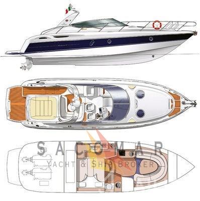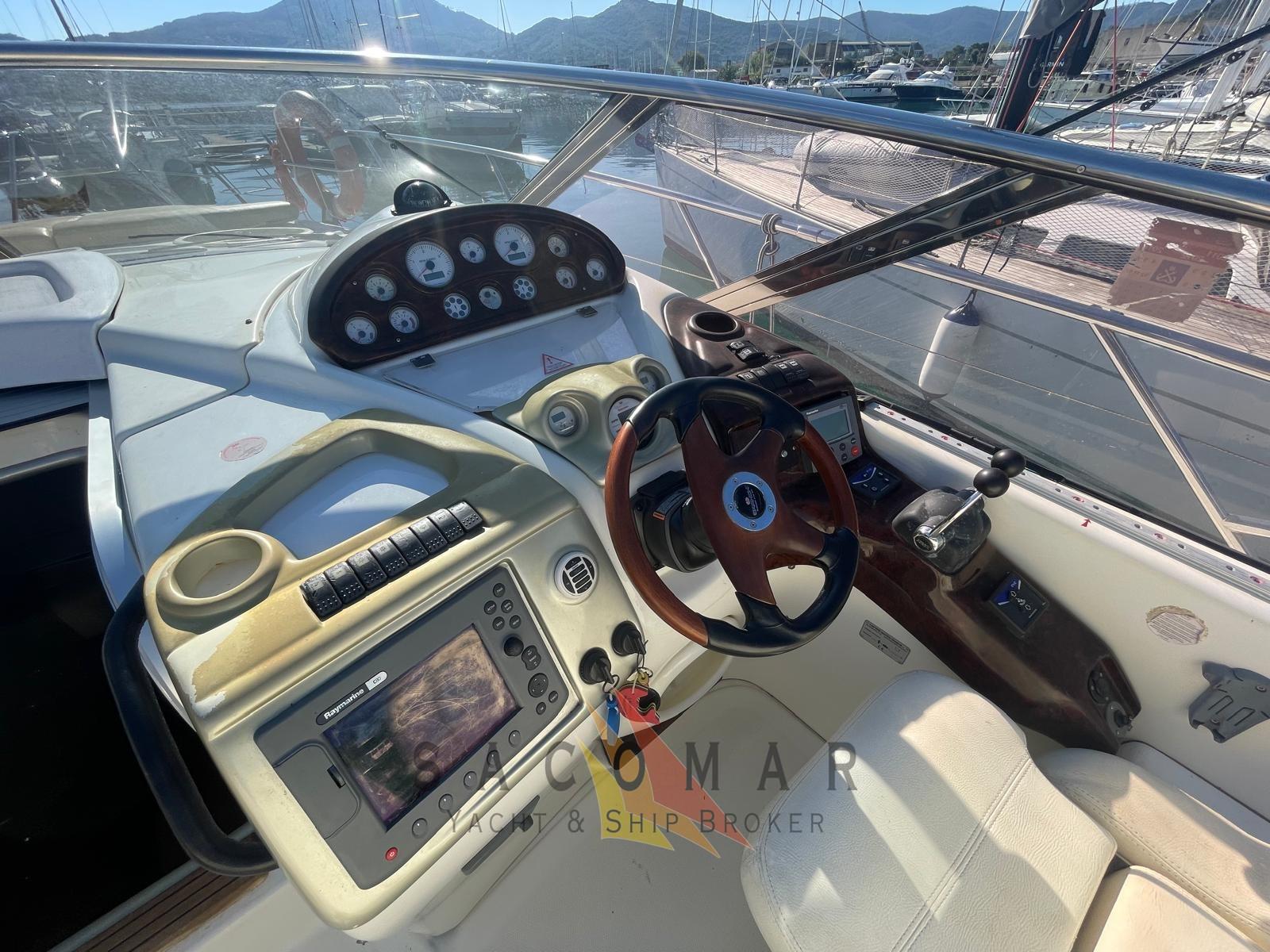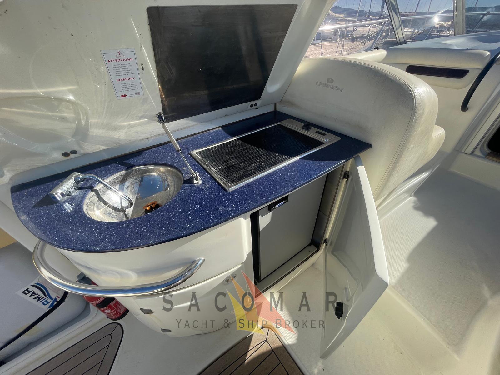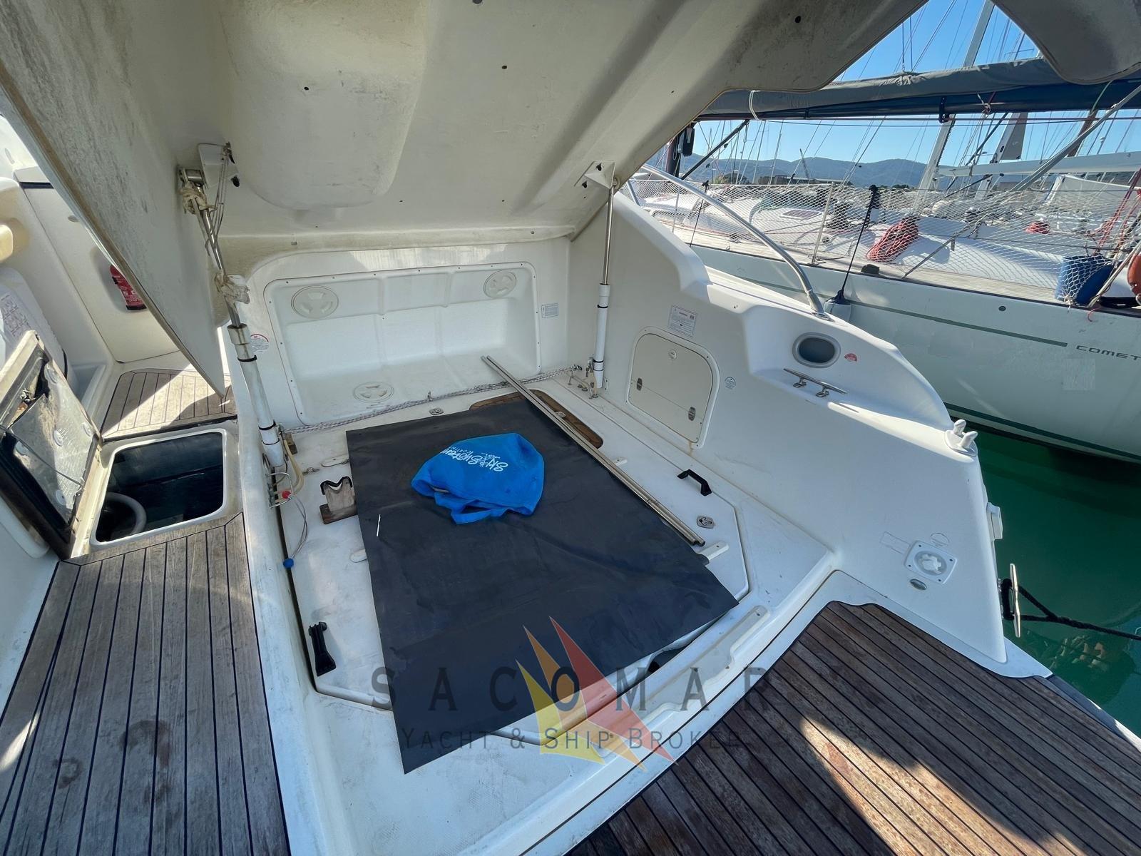 Eau sous pression, Douche de cockpit (calda e fredda), Propulseur d'étrave (QL), Phare de poursuite, Flaps électriques, Garage à annexe, Lavabo dans le cockpit, Passerelle (Besenzoni), Plateforme arrière (teak), 2 Pompe de cale électrique (Johnson), Cockpit en teck, Prise de quai, Guindeau électrique (Lofrans con telecomando), Echelle de bain, table de cockpit, Corne.