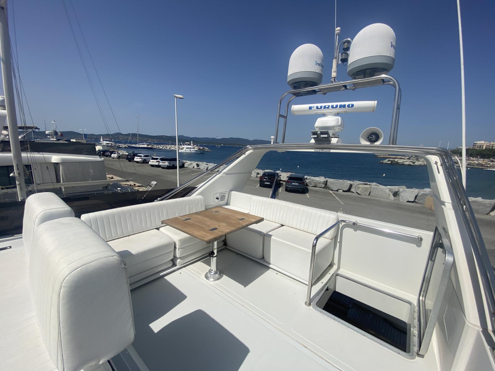 Flybridge spacieux avec table et bain de soleil.
