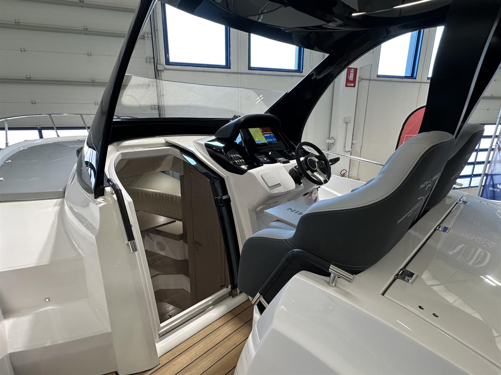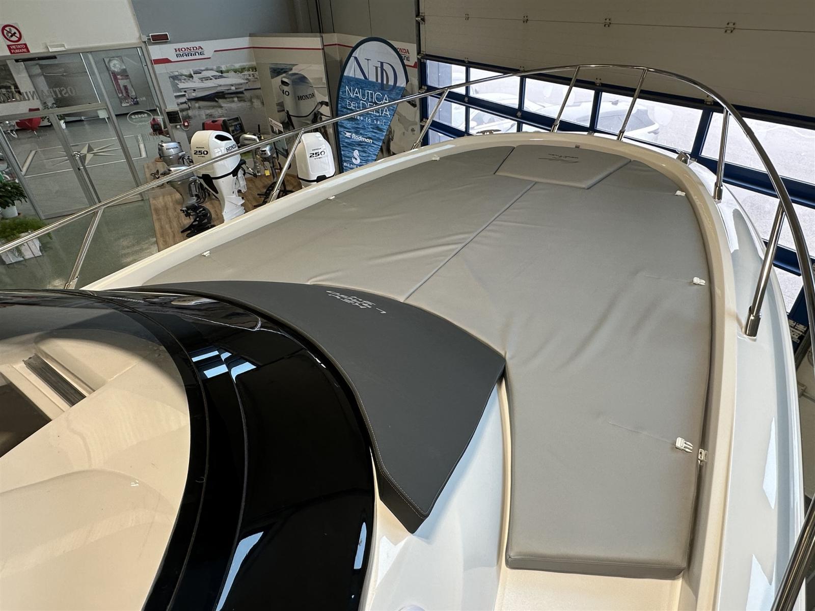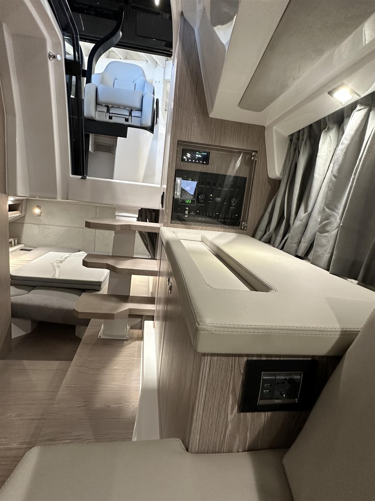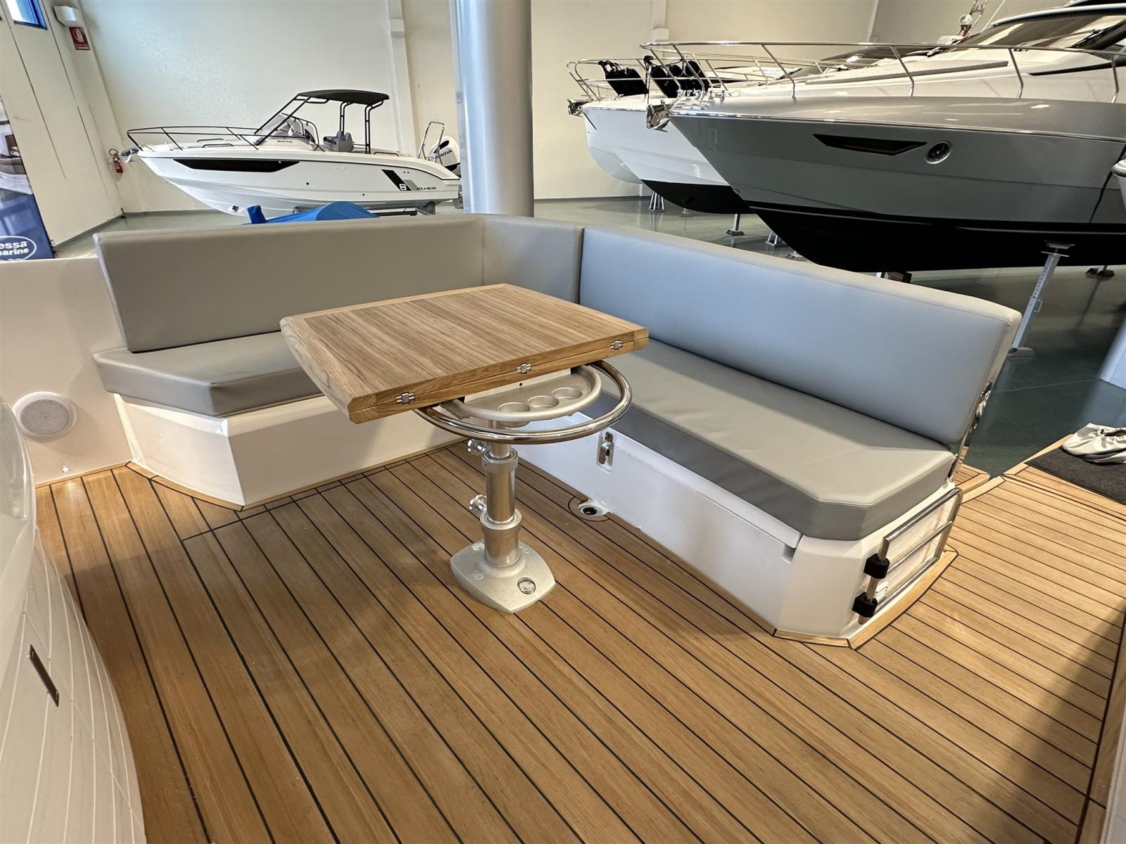 Cockpit en teck, planchers intérieurs en bois, Ttop avec auvent électrique arrière, réfrigérateur dans le cockpit, cuisinière à gaz, plates-formes arrière supplémentaires, réfrigérateur dans la dinette, Vhf, kit d’amarrage, transport, lancement