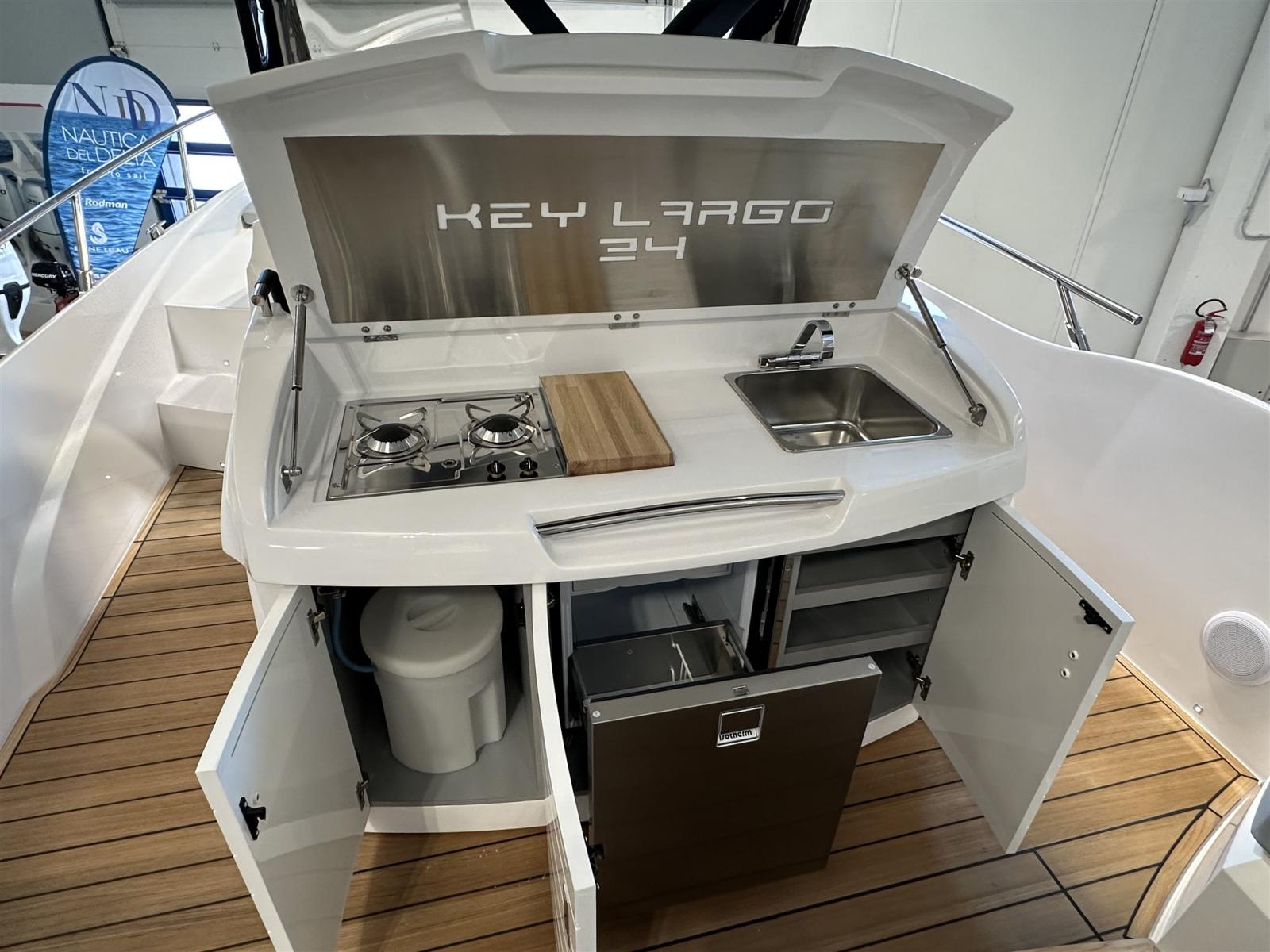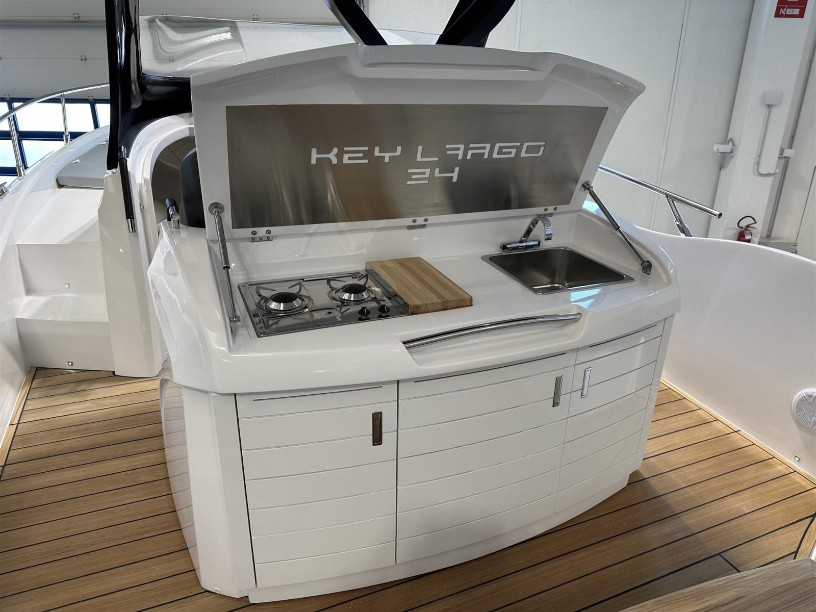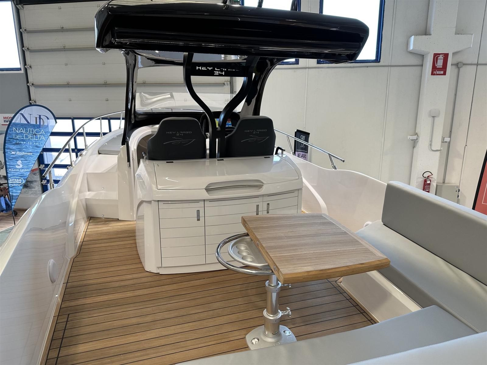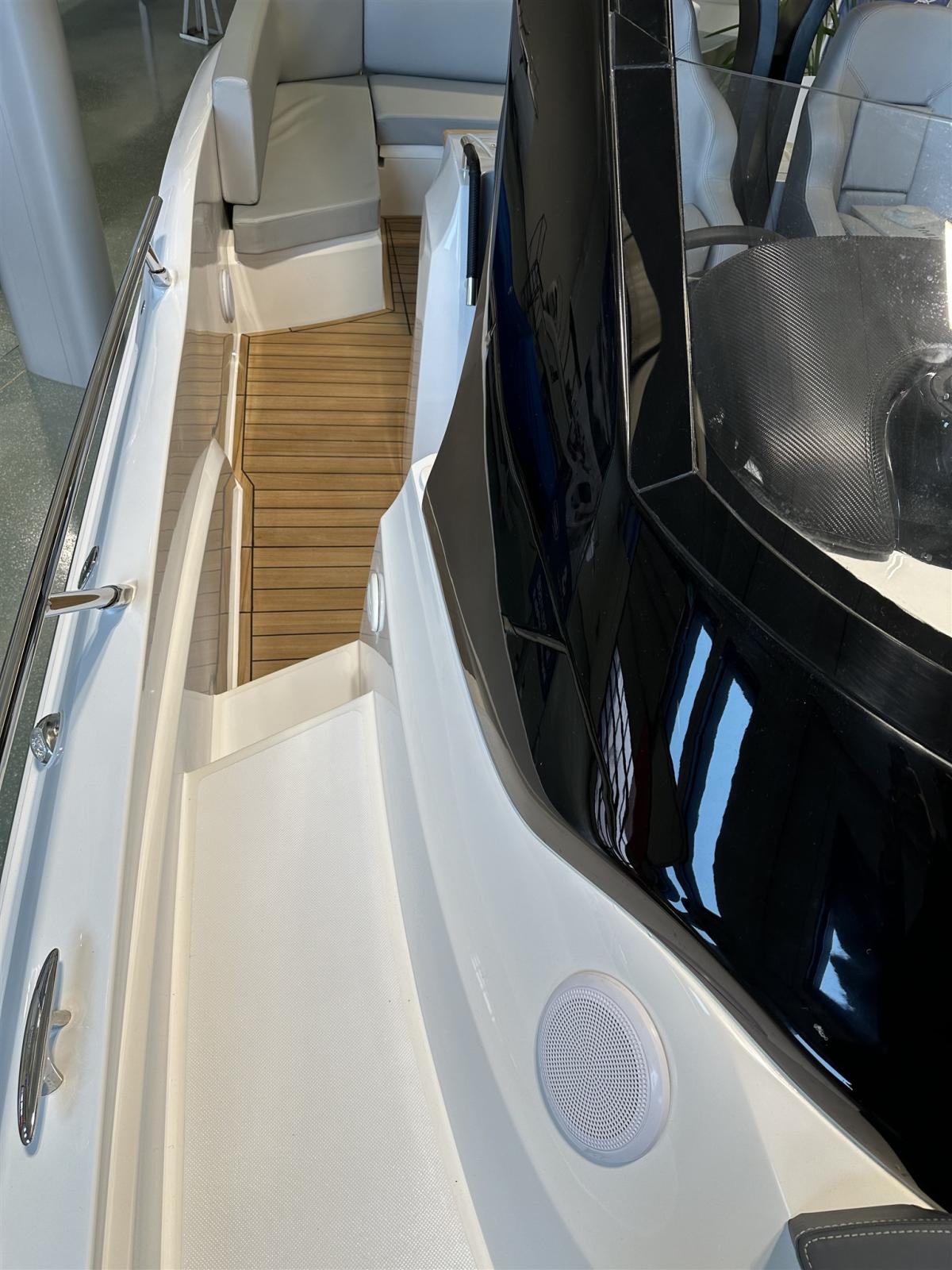 Eau sous pression, Douche de cockpit, Flaps électriques (Zipwake), Indicateurs de flaps, Lavabo dans le cockpit, Éclairage de courtoisie, Plateforme arrière, Pompe de cale automatique, Pompe de cale manuelle, Porte latérale, Cockpit en teck, Prise de quai, Guindeau électrique, Echelle de bain, table de cockpit, Corne, T-Top.