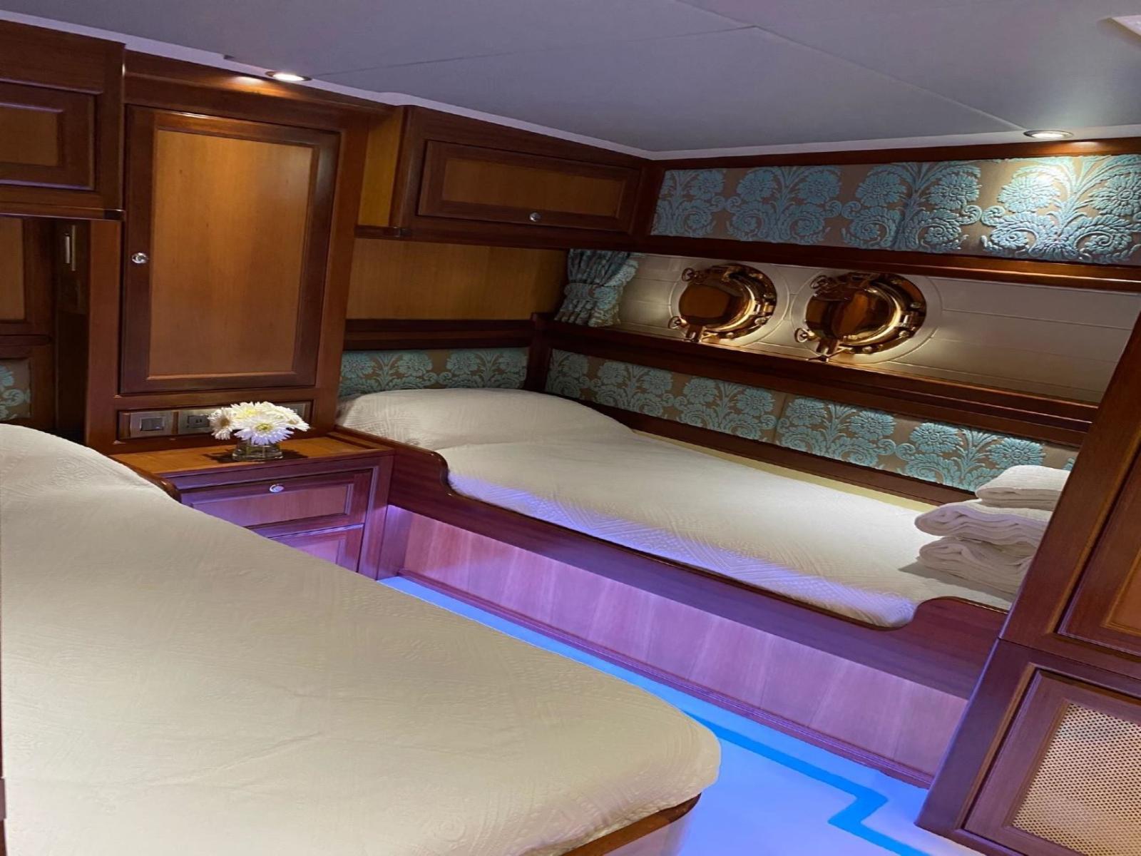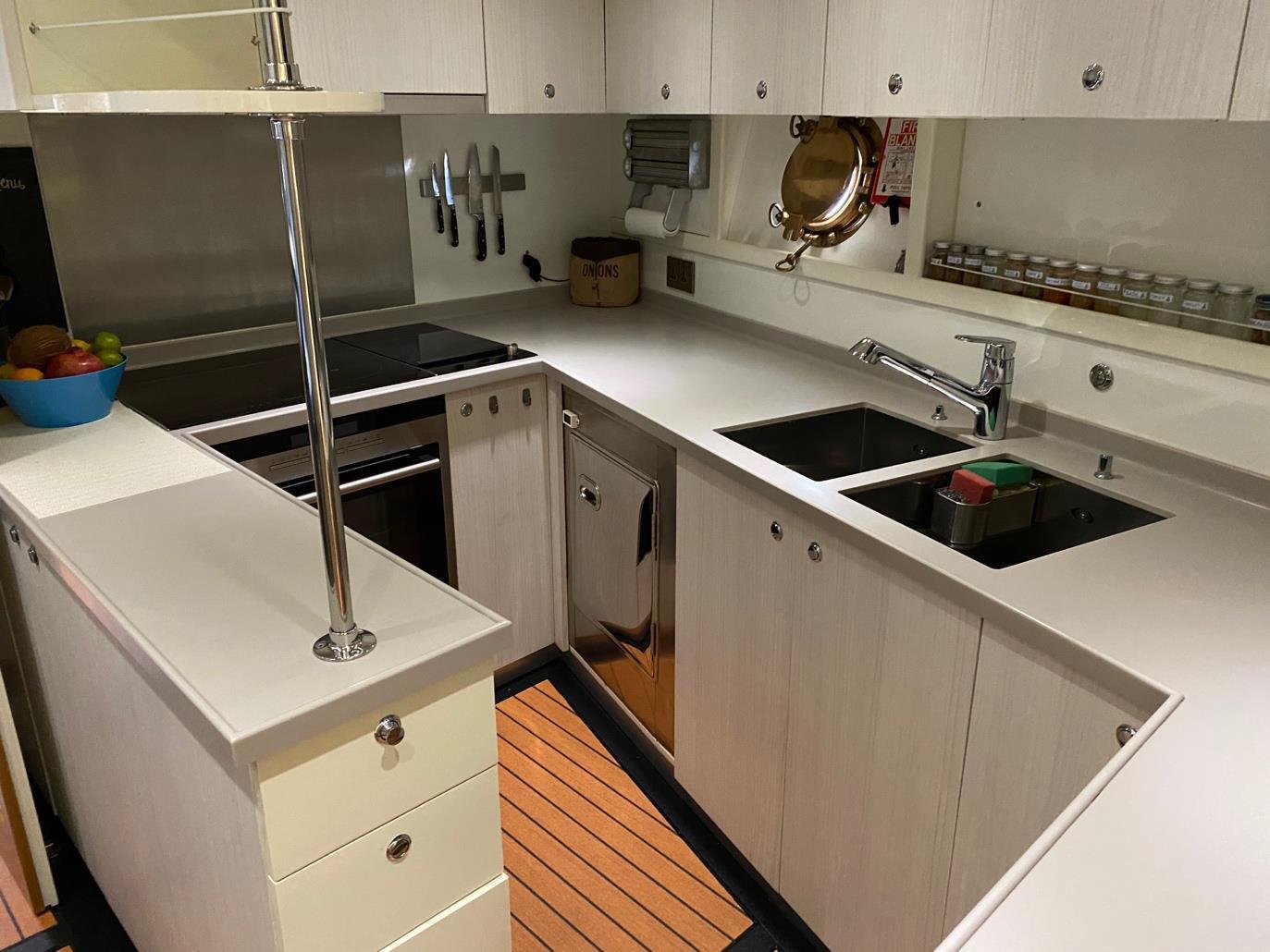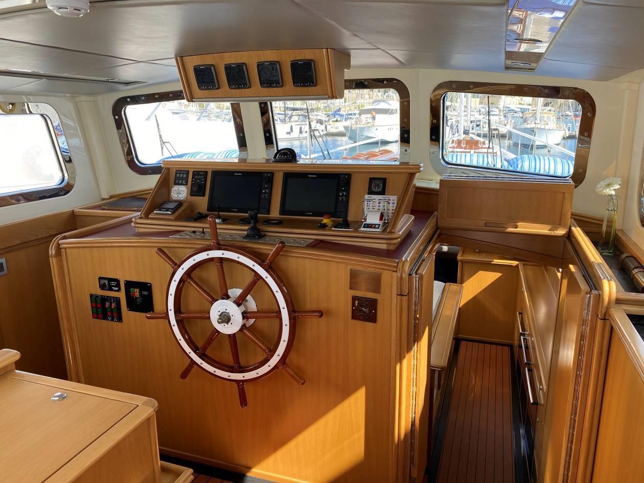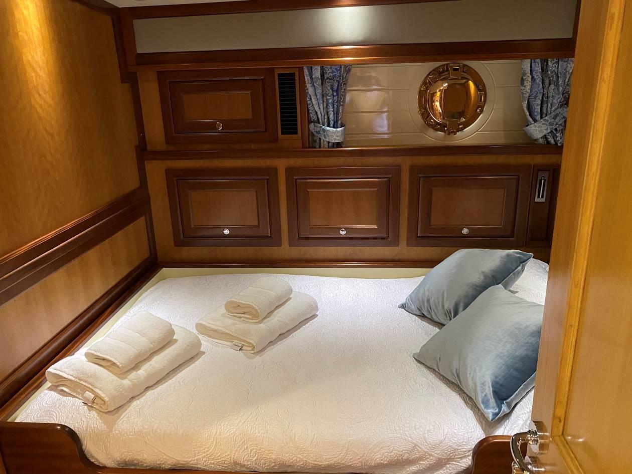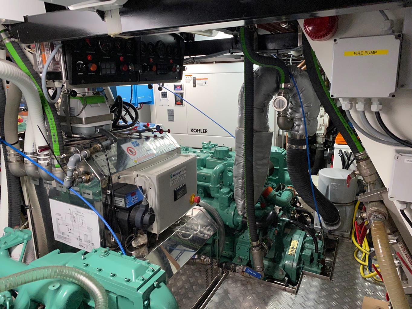 TELSTAR VI has twin Doosan 338kw engines, driving two shafts enables ample power to cruise at 12knots. Combined with the hydraulic bow thrust er she can be easily sailed by one person and by a crew of two into port and anchorages. Auxiliary equipment includes two Kohler generators equipped with PTO’s, water maker and sewage treatment plant for long term