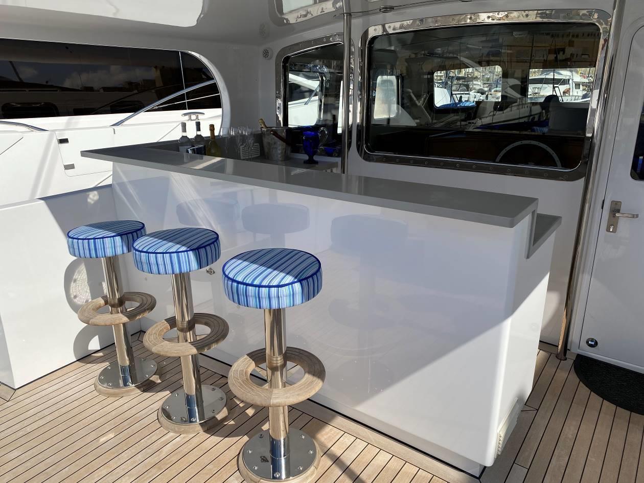 TELSTAR VI ketch rig boasts carbon fibre spars with hydraulically operated in mast furling and sail con-trol systems by Lewmar enabling full single-handed control of the sails from the wheelhouse or outside helm station. Her modern design and large battery bank enable her to sail in silence without generators for over 12 hours at a time using a separate 4 x 24V motor Lewmar power pack.