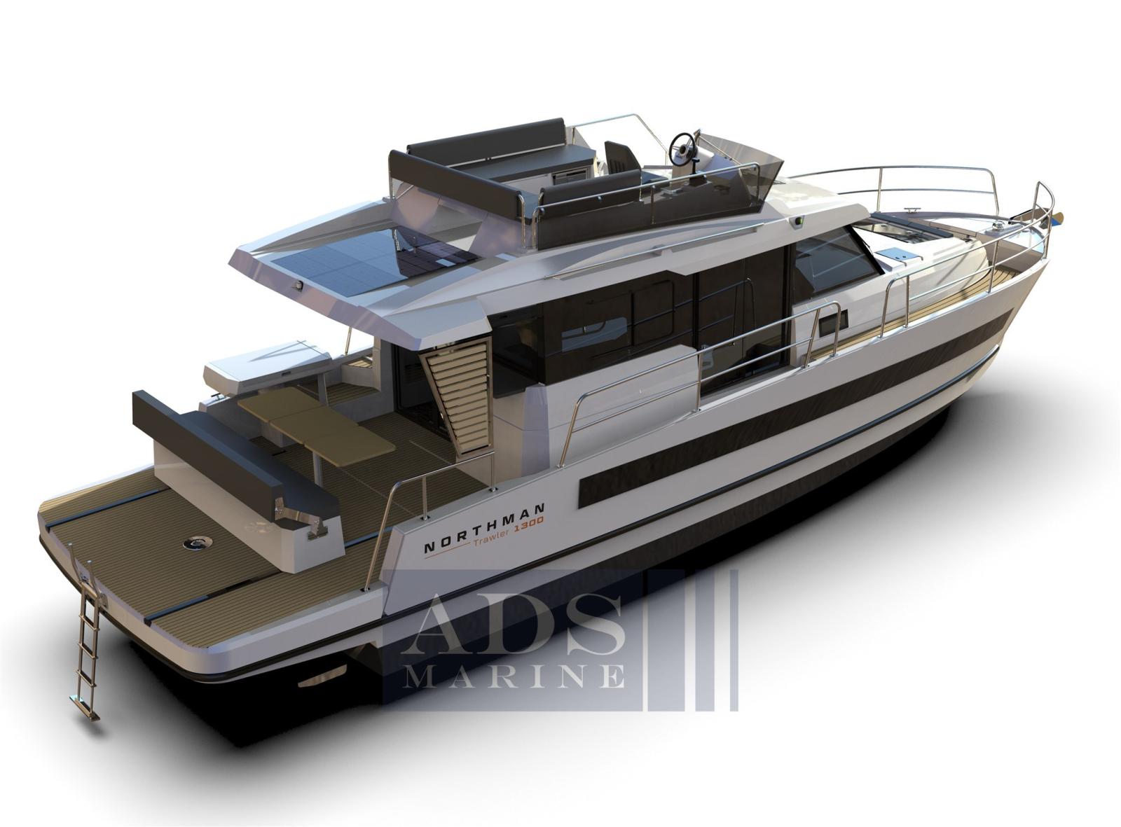Toit blanc intégré au-dessus du cockpit, du salon et de la timonerie avec des marches intégrées vers la terrasse ensoleillée. Matelas optionnels disponibles