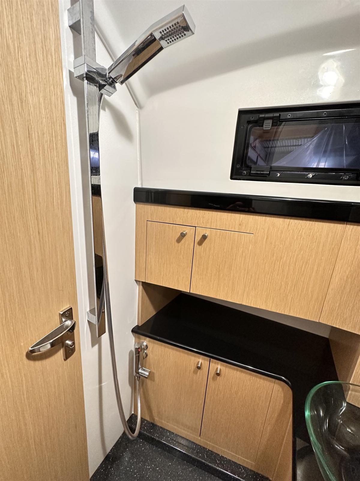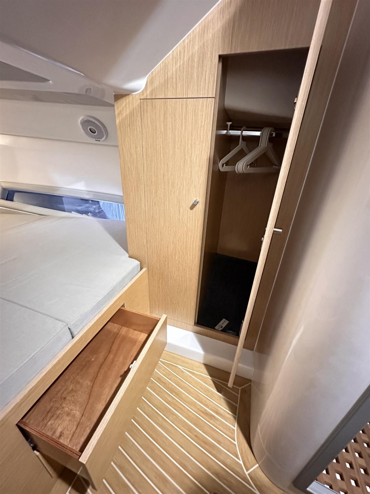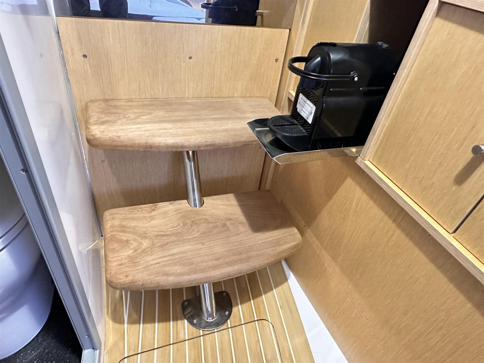 Alarme moteur, Eau sous pression, 4 Taquets pliants, Douche de cockpit, Extincteur(s) fixe(s), Éclairage de courtoisie, Spots sous-marins, Plateforme arrière, Pompe de cale manuelle, Cockpit en teck, Guindeau électrique, Echelle de bain, table de cockpit (amovibile).