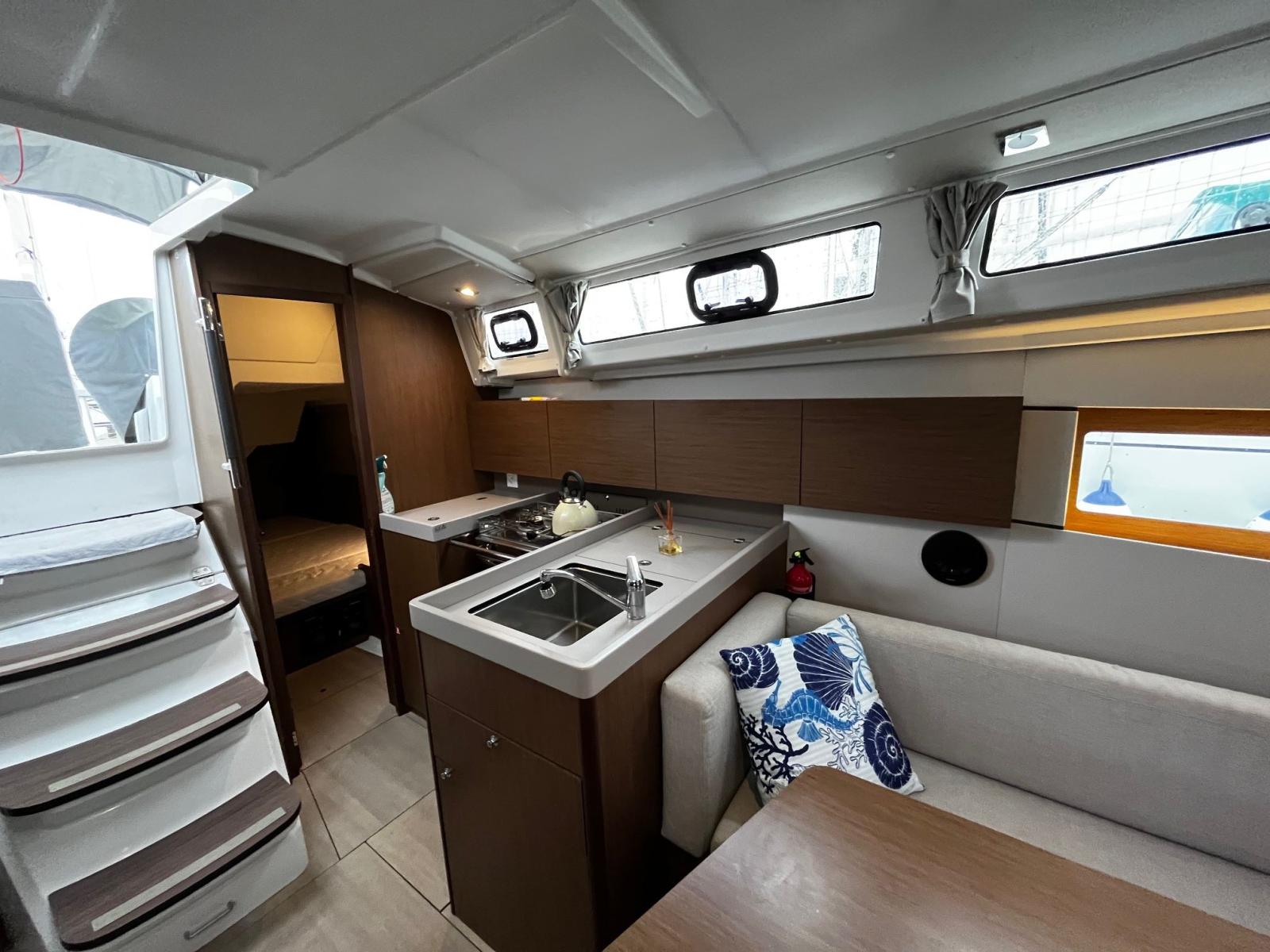 Version 2 cabines - Cuisine en L et salle de douche séparée arrière tribord, Finition Confort, Pack coastal et offshore BandG, Plus value Voiles Mylar DCX, Mât enrouleur, Code 0 sur emmagasineur, Fermeture arrière complète et capote de descente, réglage au cockpit des chariots de génois, Winch
