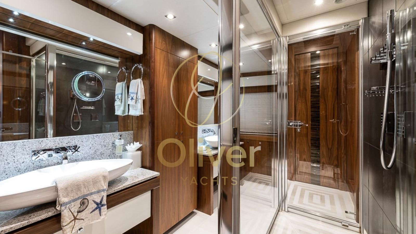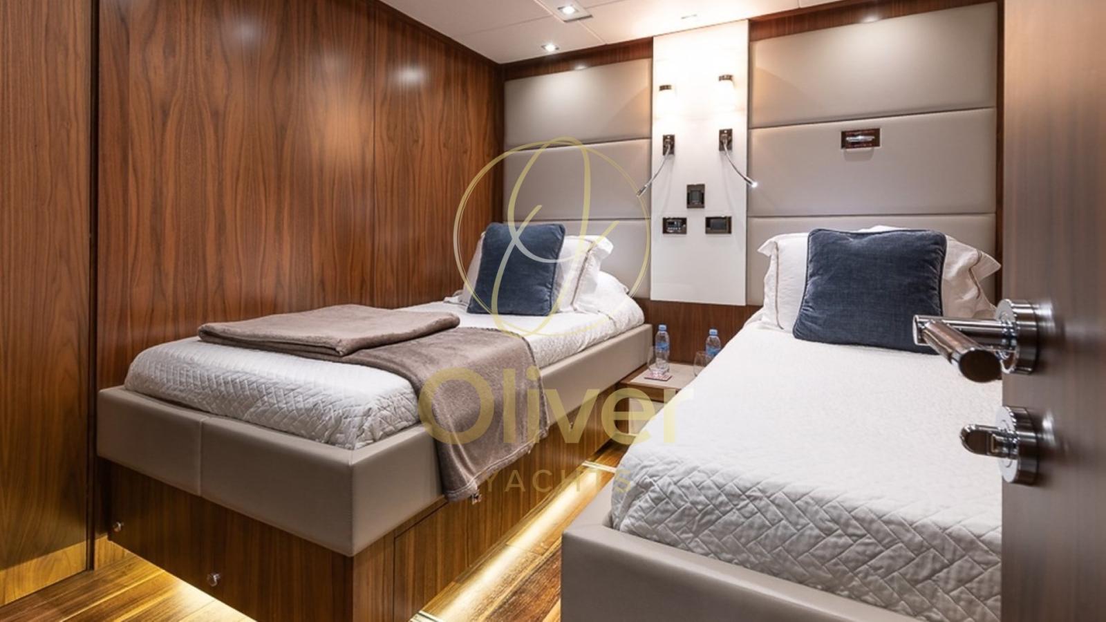 L’espace de couchage comprend cinq cabines, chacune conçue pour l’intimité et le confort. La cabine principale, spacieuse et luxueuse, est équipée d’un lit double, d’un minibar, d’un coffre-fort et d’une salle de bains privative avec un jacuzzi Phoenix Dee et un système de bain à remous / Airpool. Les quatre autres cabines d’invités comprennent deux doubles fixes et deux lits jumeaux qui se transforment en doubles, toutes équipées d’une salle de bains privative, d’une télévision et d’un système audio.