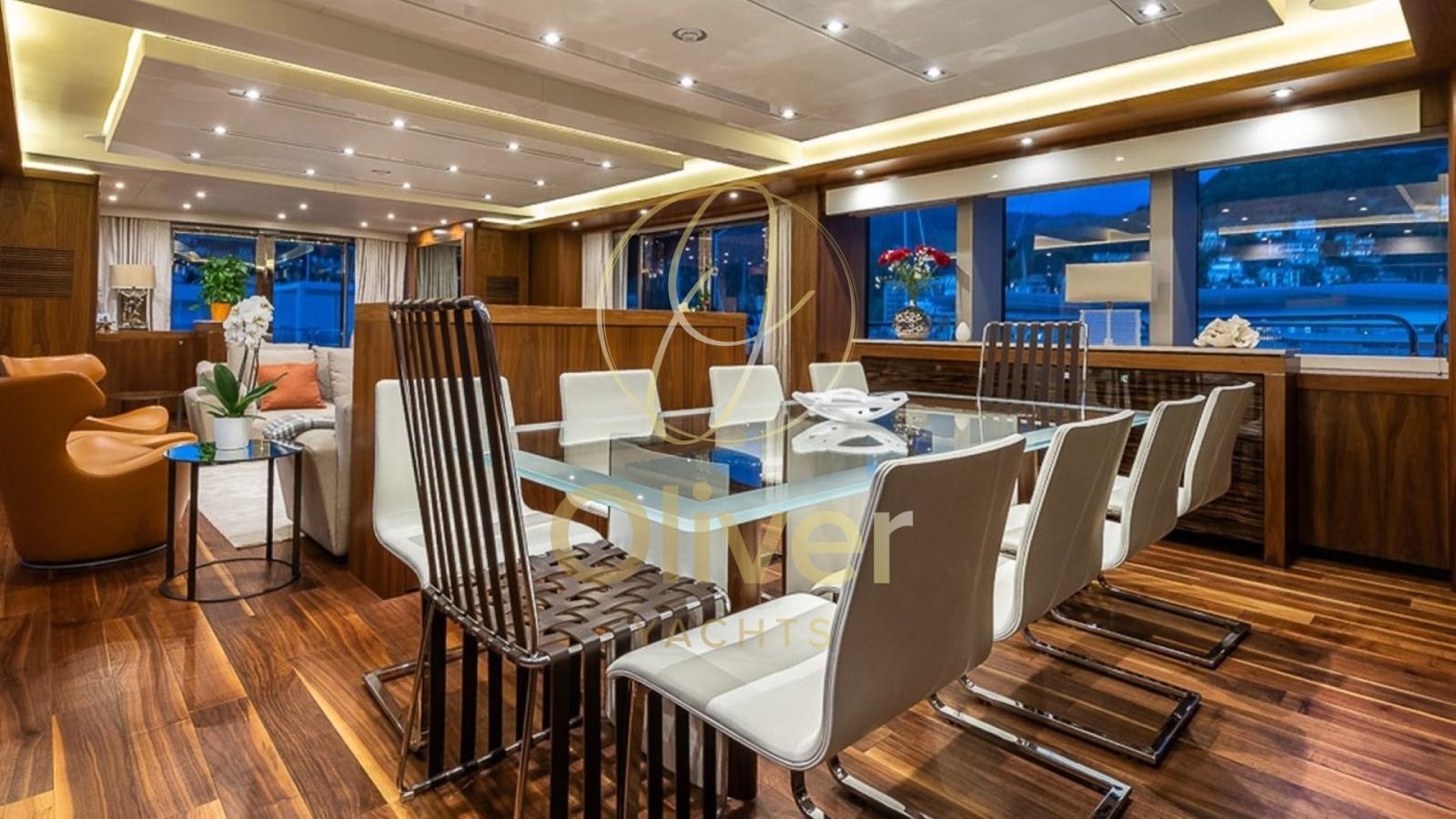 Les espaces extérieurs sont conçus pour un maximum de plaisir et de divertissement, avec un flybridge équipé d’un jacuzzi hexagonal, un bar sur mesure et des espaces de restauration et de détente, protégés par un toit rigide rétractable. Le cockpit arrière offre un espace convivial avec un bar complet, une table à manger et une douche en cascade. Le garage abrite une annexe Williams 505 Diesel Jet et des jouets nautiques, y compris des jet-skis SeaDoo et SeaBOB.