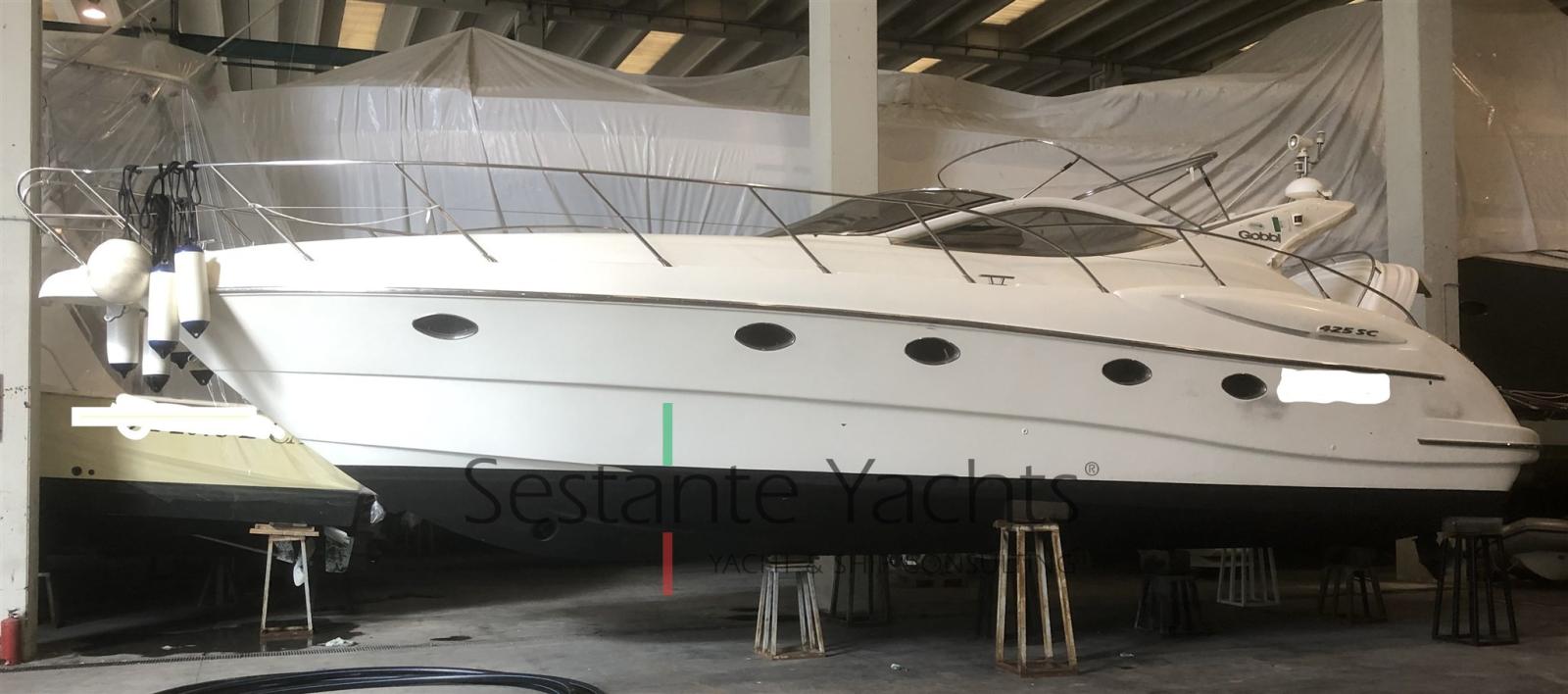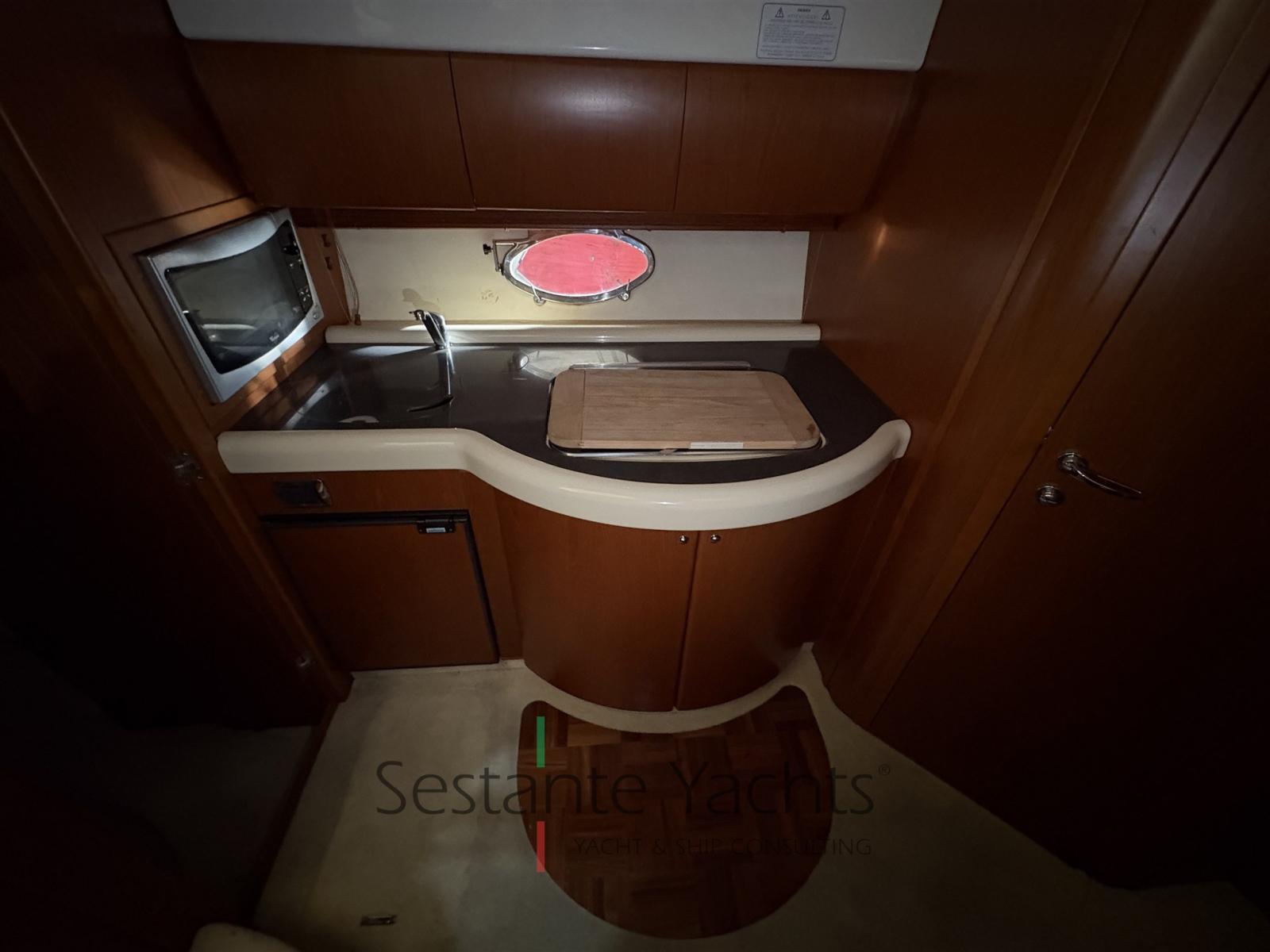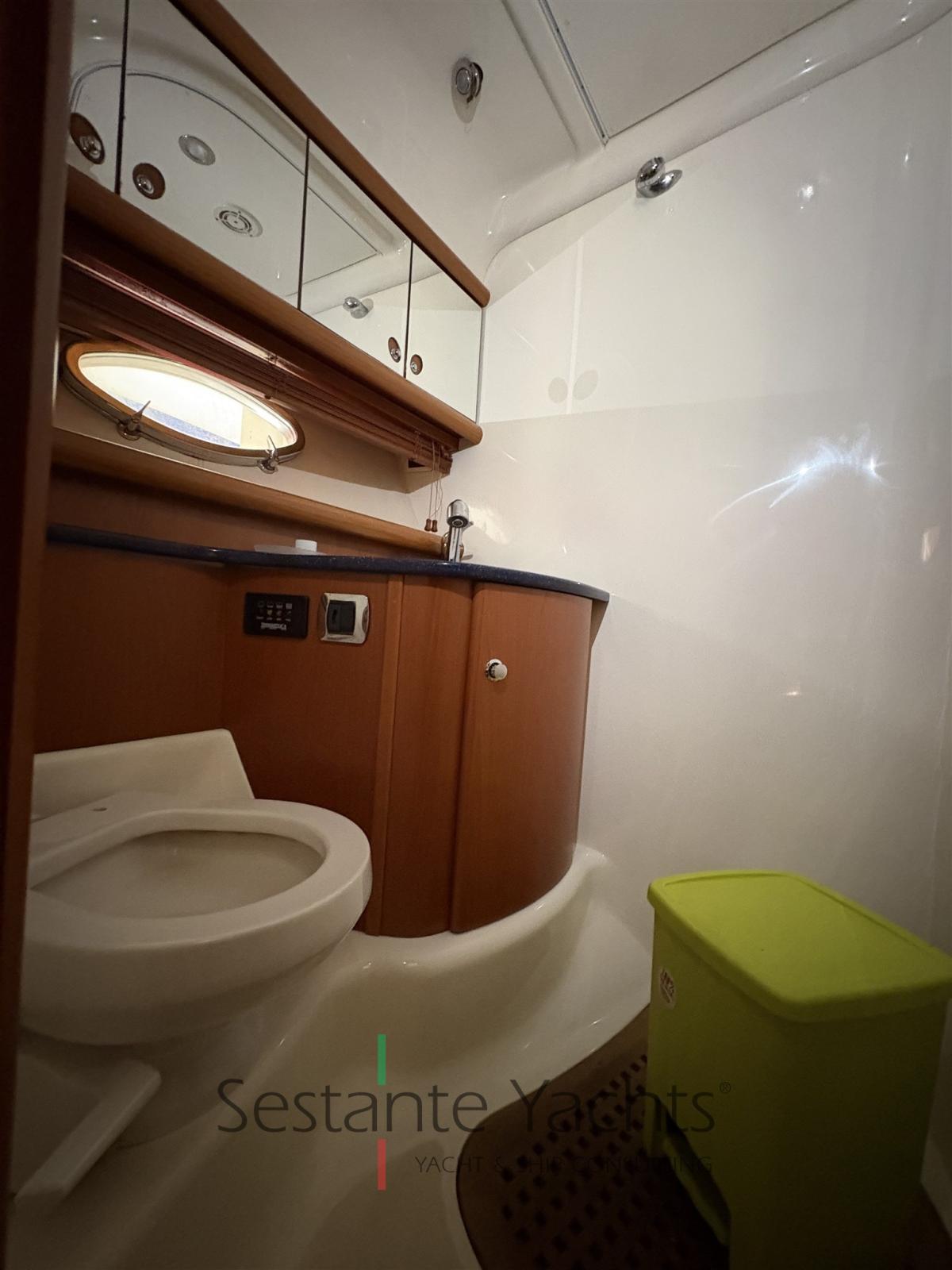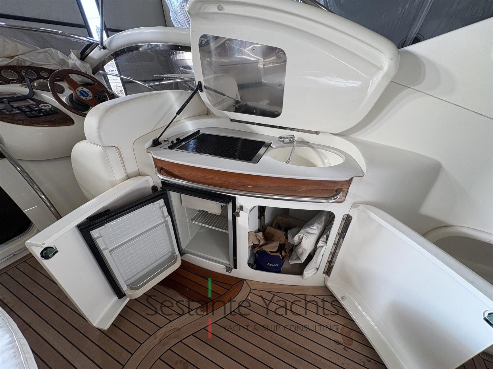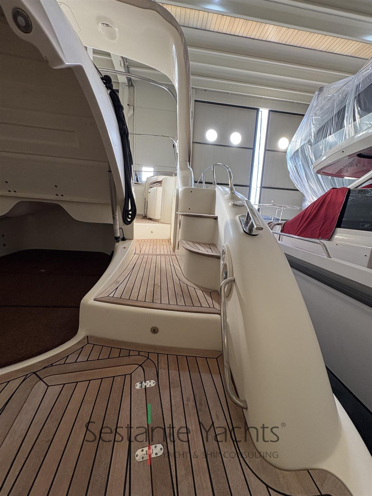 Eau sous pression, Douche de cockpit, Phare de poursuite, Flaps électriques, Lavabo dans le cockpit, Éclairage de courtoisie, Passerelle (Besenzoni), Pompe de cale automatique, Pompe de cale manuelle, Porte latérale, Cockpit en teck, Prise de quai, Onduleur, Rollbar, Guindeau électrique, Echelle de bain, Selles pour Annexe, table de cockpit, Corne, T-Top.