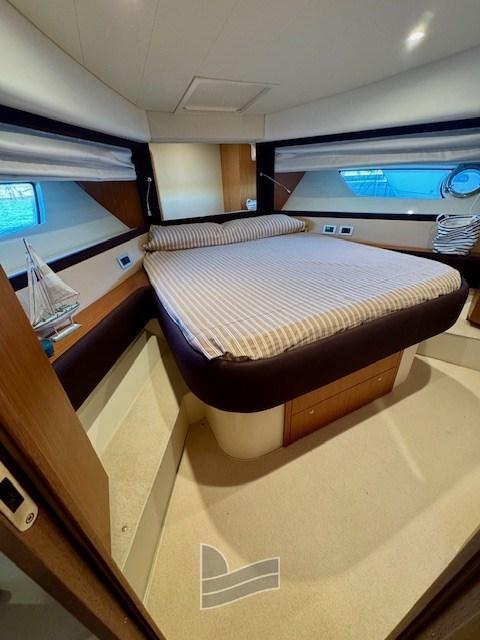 La cabine principale dispose d’une salle de bain privée et d’une grande armoire. L’inclusion des deux grandes fenêtres à vue ouverte avec hublots ouvrants est une étape importante dans l’optimisation de l’espace et assimile le 530 à des bateaux considérablement plus grands.