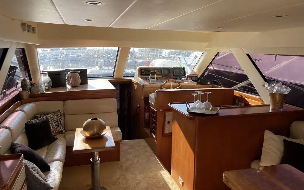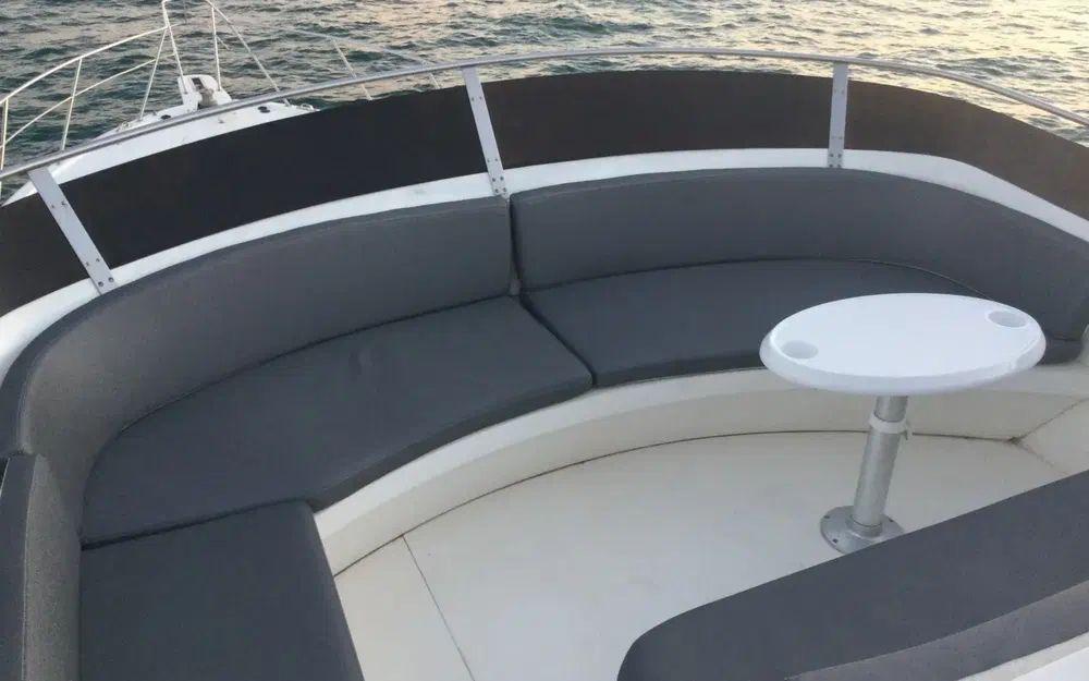 Le yacht est également doté de protections de qualité : taud de fermeture arrière, taud de pare-brise, taud de table de cockpit, taud de console, taud de flybridge, bimini top, et taud de soleil.