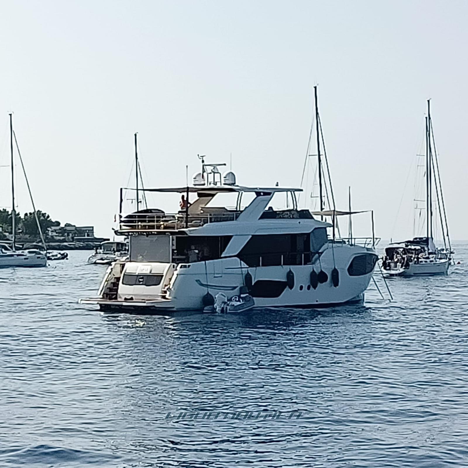 Alarme gaz, Alarme moteur, Alarme de pompe de cale, Passavant en teck, Douche de cockpit, Double barre à roue, Phares fixes arrière, Phare de poursuite, Flaps hydrauliques, Hard top, Indicateurs de flaps, Lavage de chaine, Éclairage de courtoisie, Spots sous-marins, Passerelle, Plateforme arrière, Porte latérale, Porte latérale, Cockpit en teck, Prise de quai, Connexion eau sous pression à quai, Guindeau Hydraulique, Echelle de bain, Stabilisateurs, table de cockpit, Corne, Pont en teck.