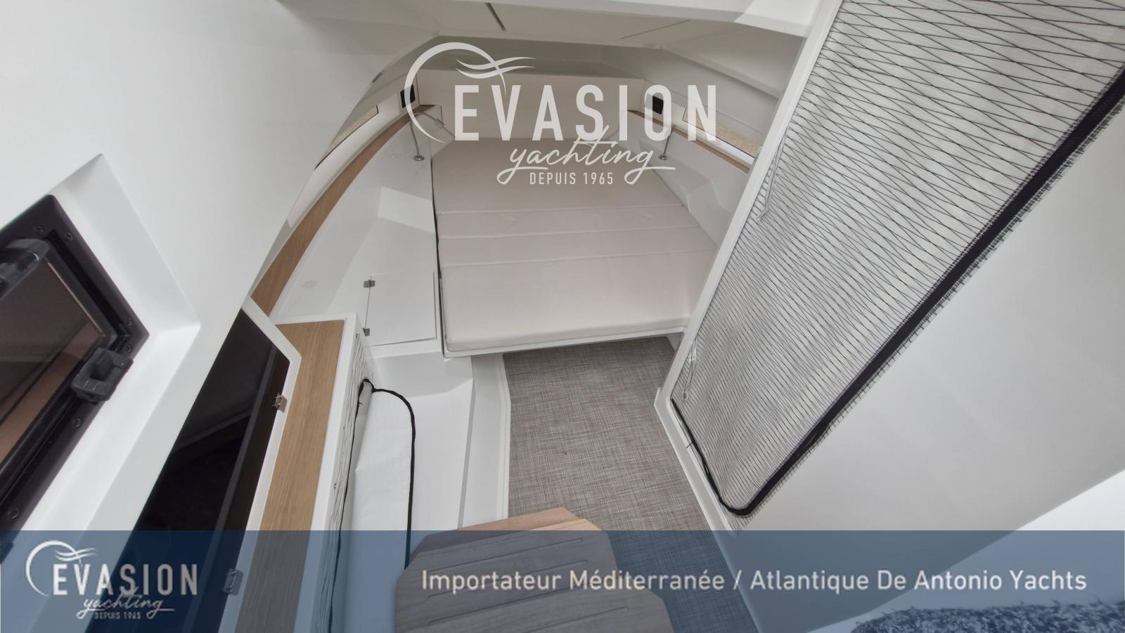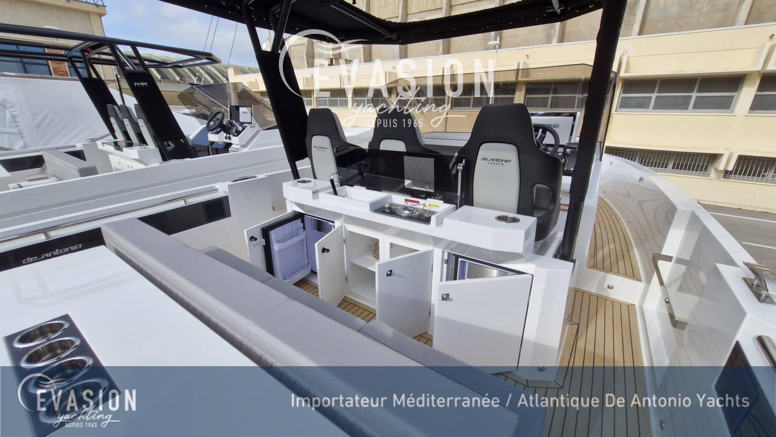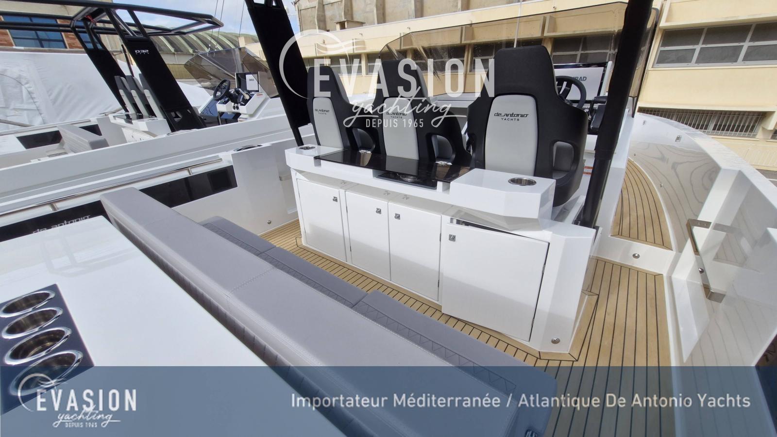 Evasion Yachting, importateur pour une grande partie de la Méditerranée et l'Atlantique dispose d'un D32 millésime 2026 du chantier Espagnol De Antonio Yachts. Motorisé en 2x300CV hors-bord, avec propulsuer et ZIpwake, ce bateau est visible et livrable après le salon de Cannes 2025, Tarif livré clefs en main, avec options, prêt à naviguer.