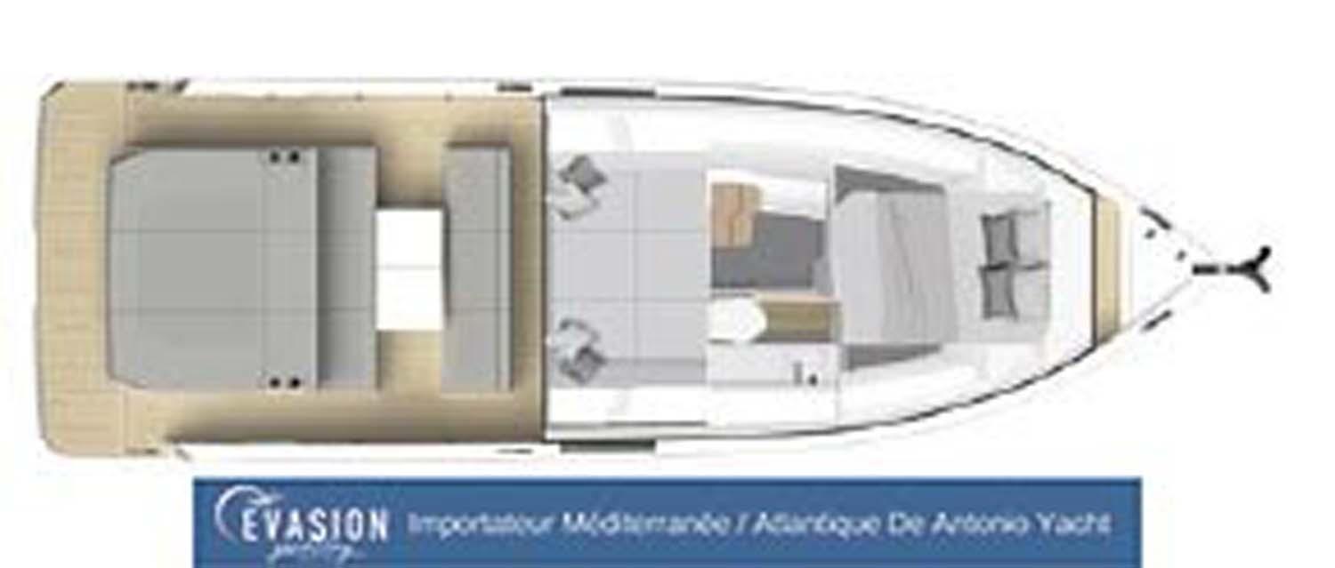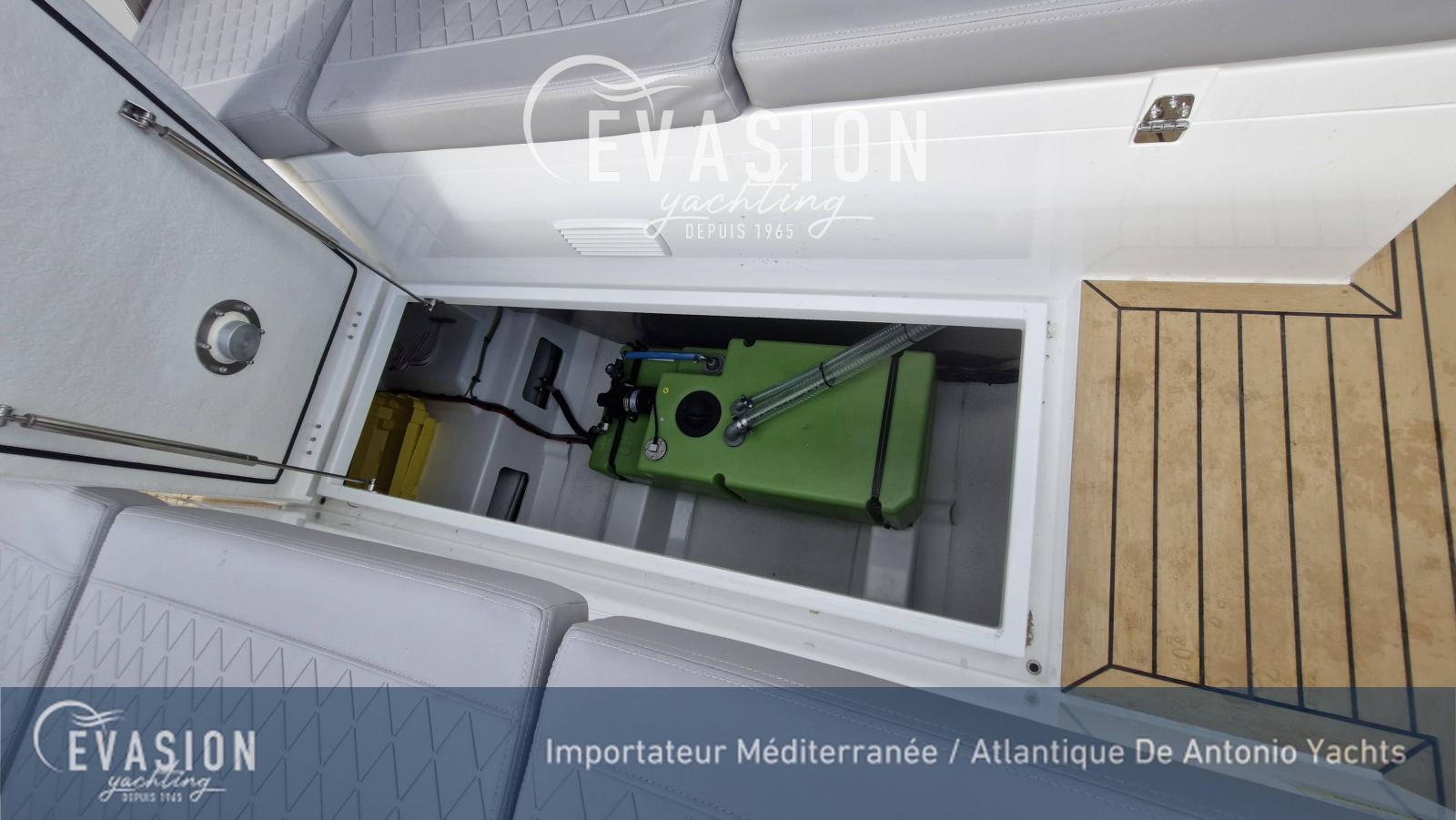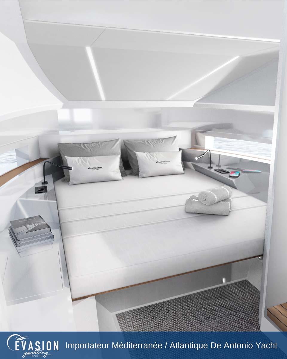 Evasion Yachting, importateur pour une grande partie de la Méditerranée et l'Atlantique dispose d'un D32 millésime 2026 du chantier Espagnol De Antonio Yachts. Motorisé en 2x300CV hors-bord, avec propulsuer et ZIpwake, ce bateau est visible et livrable après le salon de Cannes 2025, Tarif livré clefs en main, avec options, prêt à naviguer.