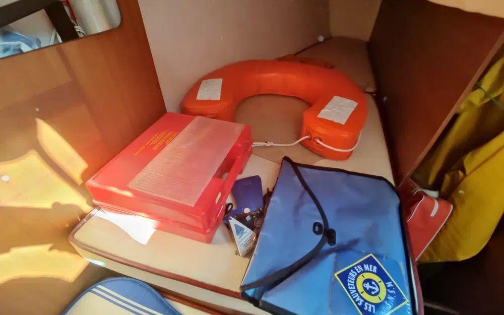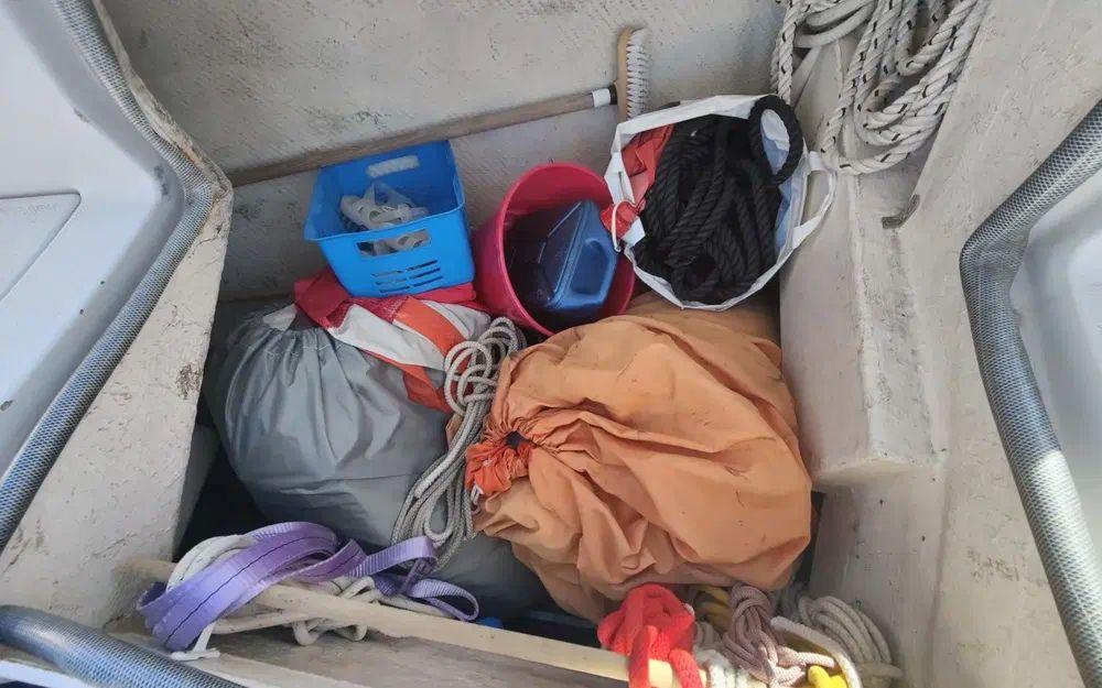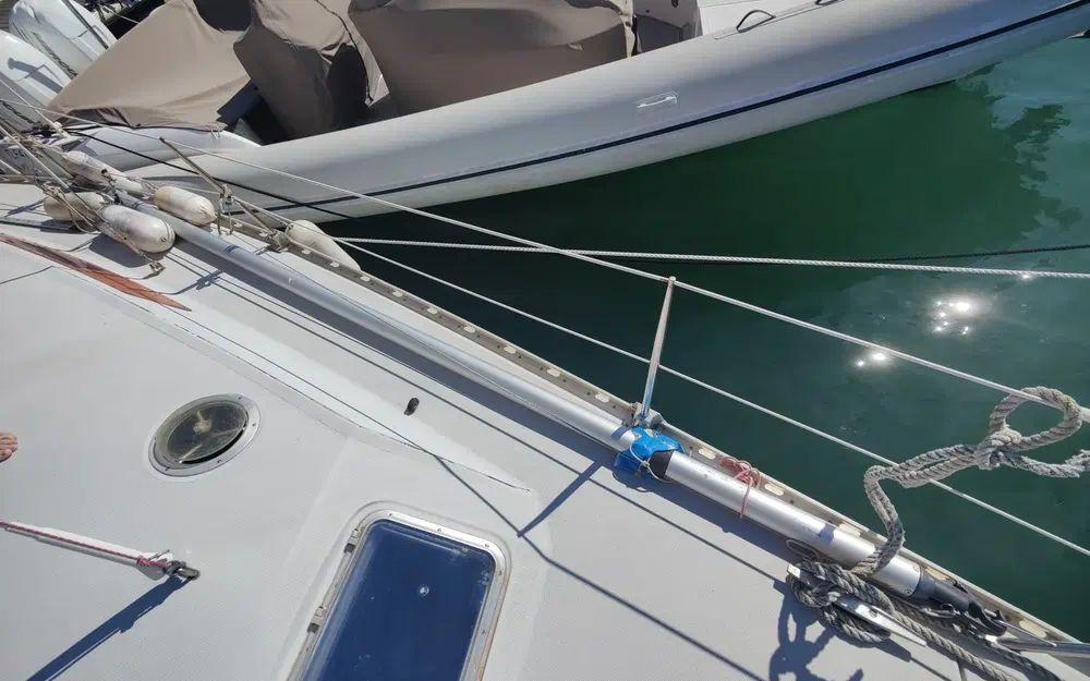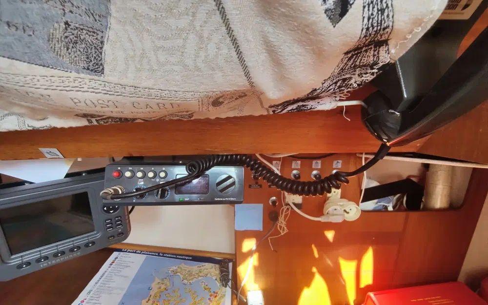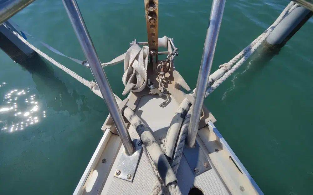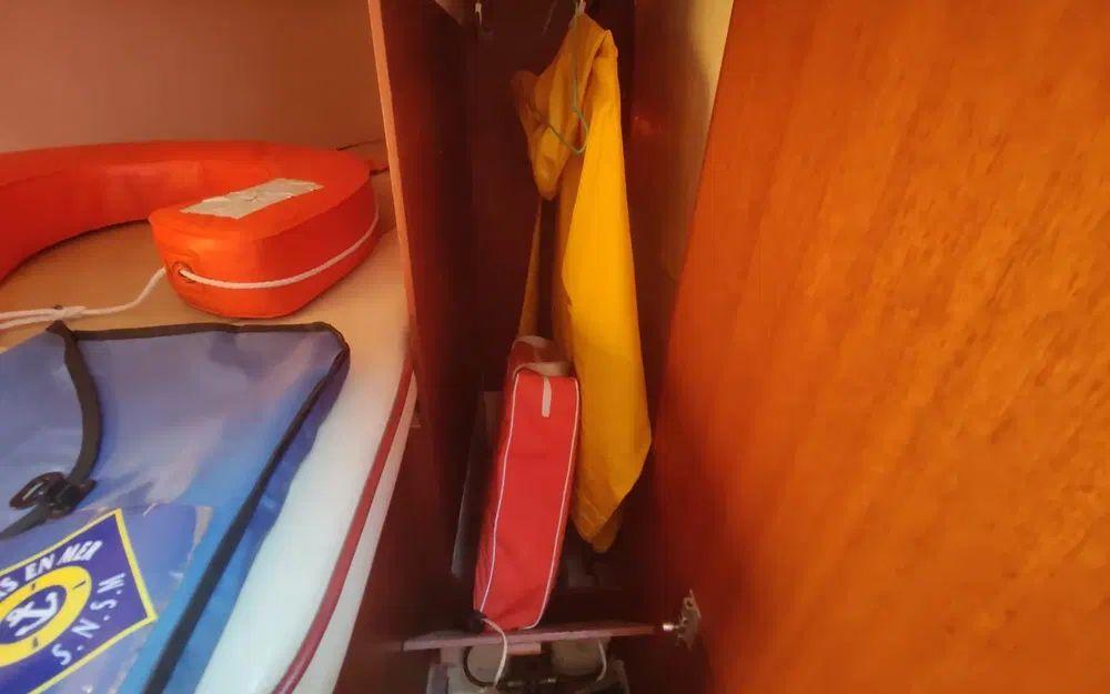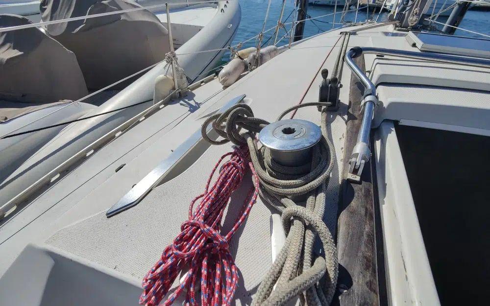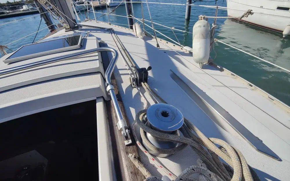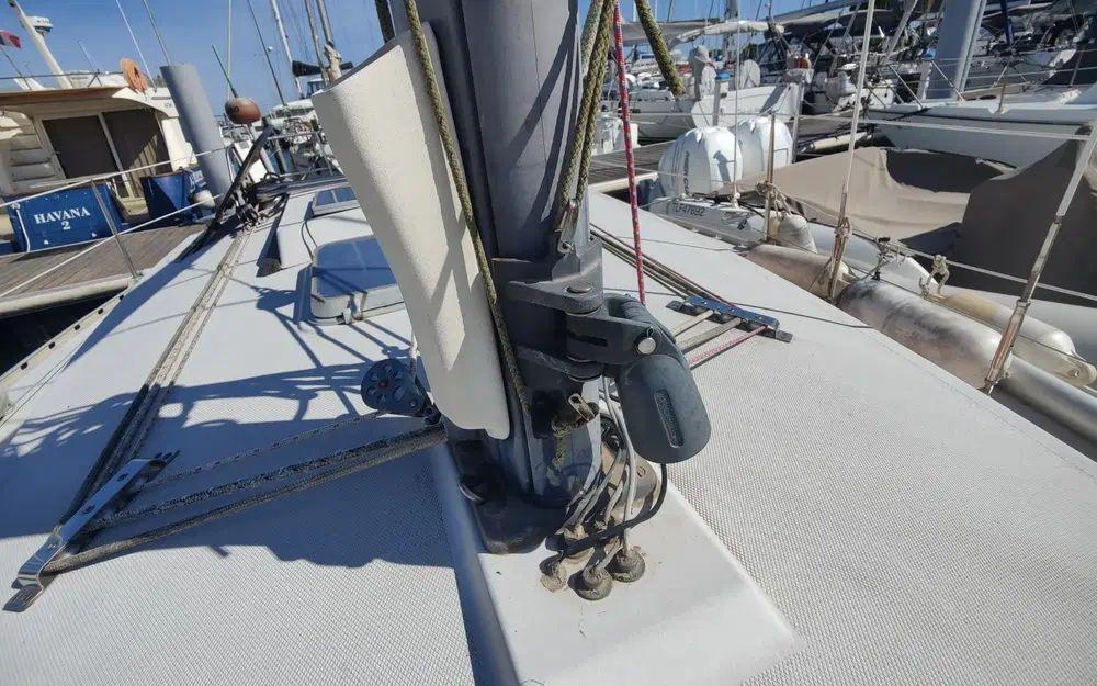 Pour la navigation : Enrouleur de génois manuel, guindeau manuel, lazy bag, taud de voile, spi, tangon, manivelles de winches, rail d’écoute de grand-voile, VHF fixe