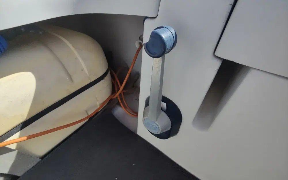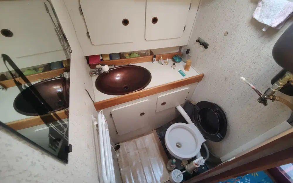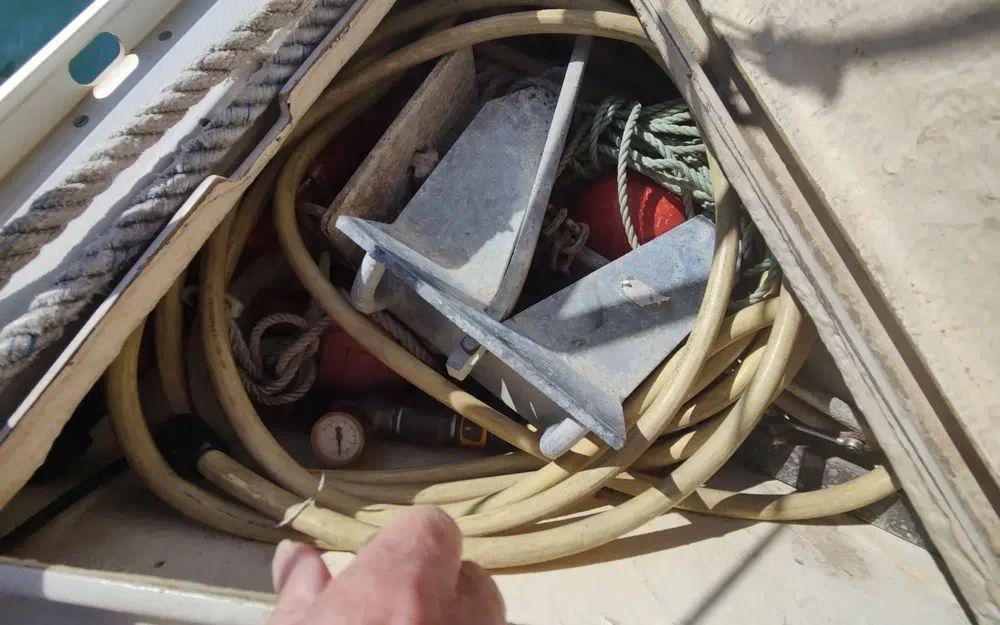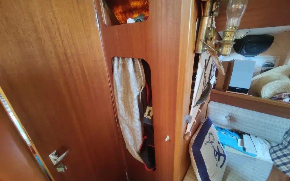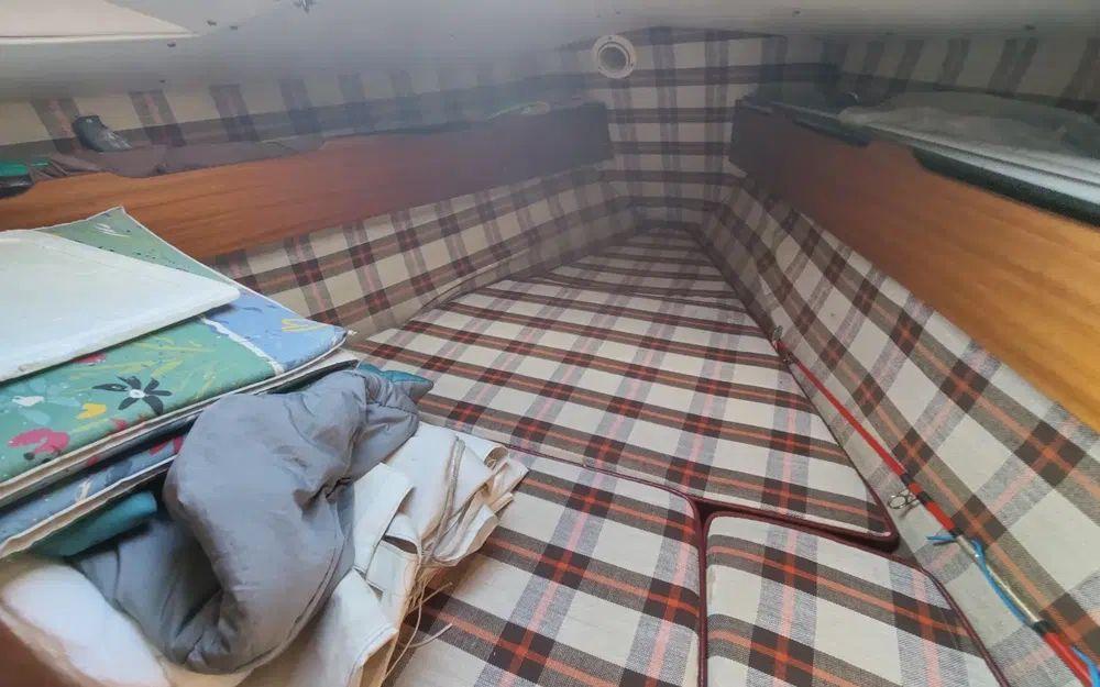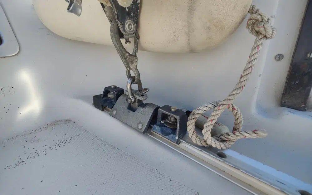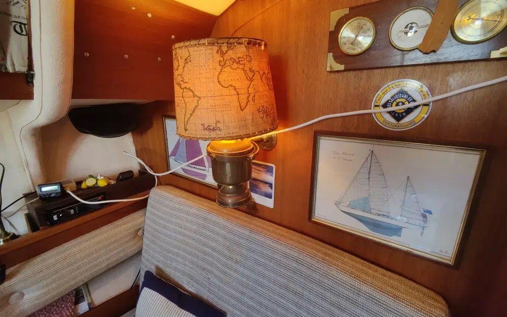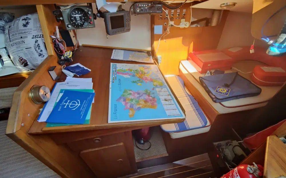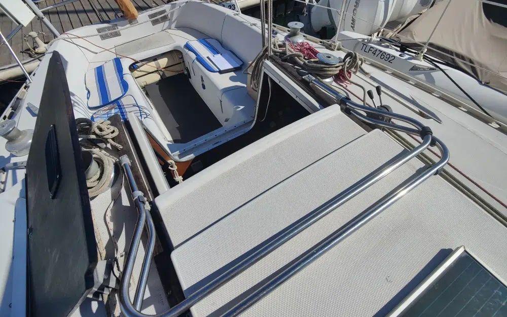 Pour la navigation : Enrouleur de génois manuel, guindeau manuel, lazy bag, taud de voile, spi, tangon, manivelles de winches, rail d’écoute de grand-voile, VHF fixe