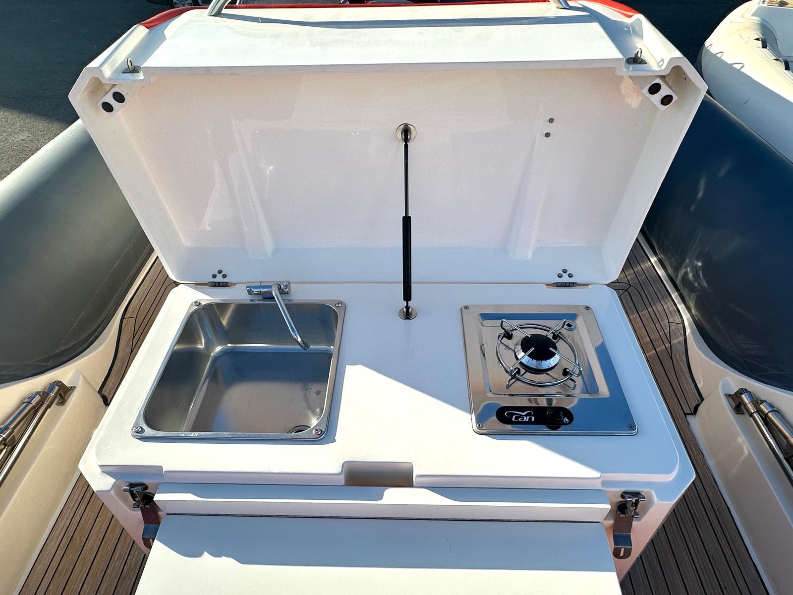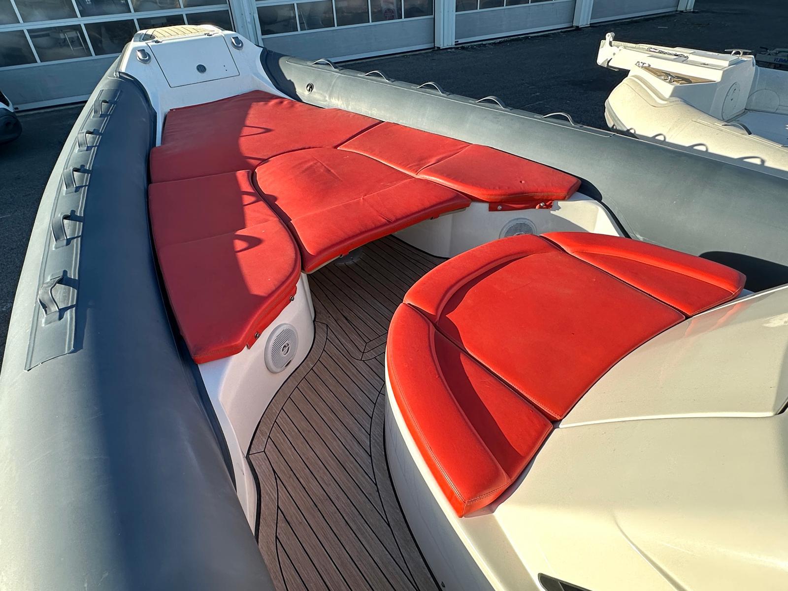 Belle ligne pour ce semi-rigide sportif de 9,42 m, qui offre également une intelligence de conception. Le pont de l'Adrenalina permet des déplacements aisés et sûrs, de la plate-forme de bain jusqu'à la proue.