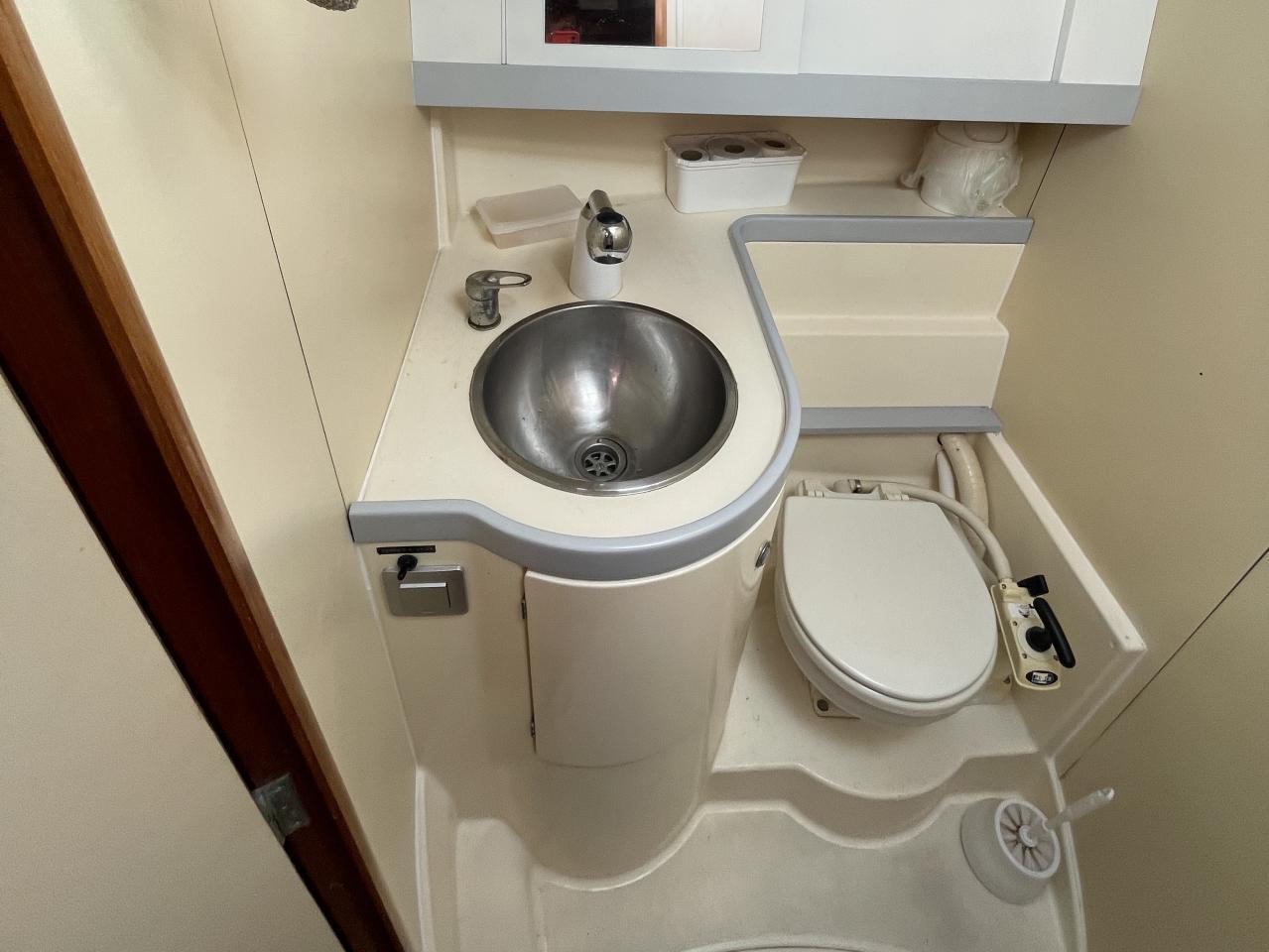 Une cabines avant propriétaire avec une salle d’eau privative équipée d’une douche, un lavabo et un WC