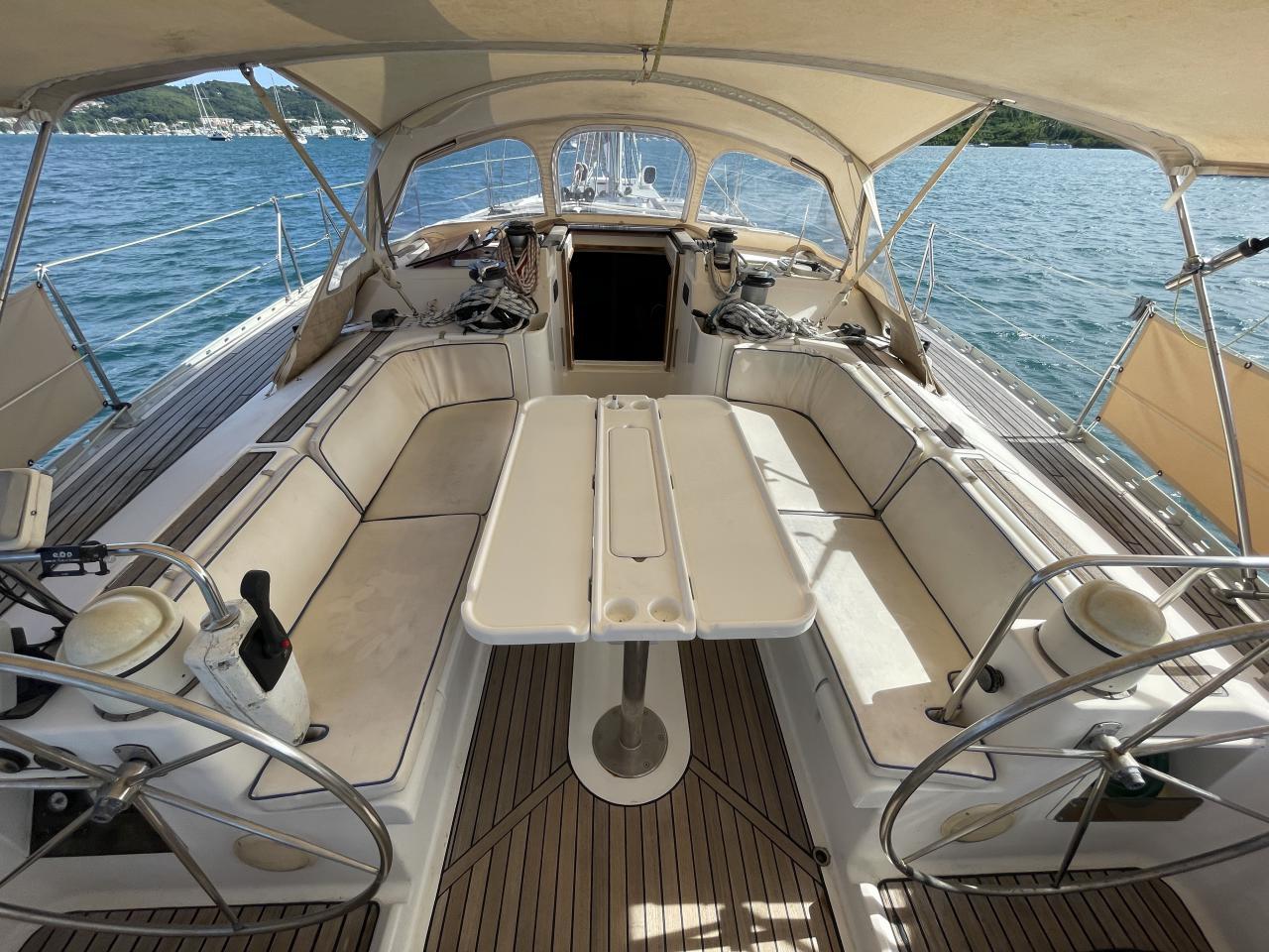 Deux cabines arrière Deux salles d’eau arrière avec douche, un lavabo et un WC Table du carré et banquette à bâbord pouvant accueillir confortablement six personnes