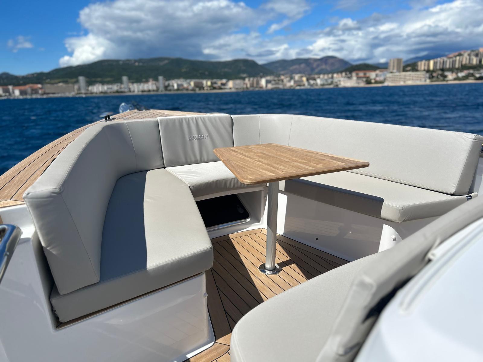 Son T-Top avec extension taud de soleil offre une protection optimale. Ses carrés avant et arrière modulables permettent une configuration flexible pour le confort de ses passagers. De larges bains de soleil assurent des espaces de détente spacieux, faisant de ce bateau un choix idéal pour des sorties à la journée.