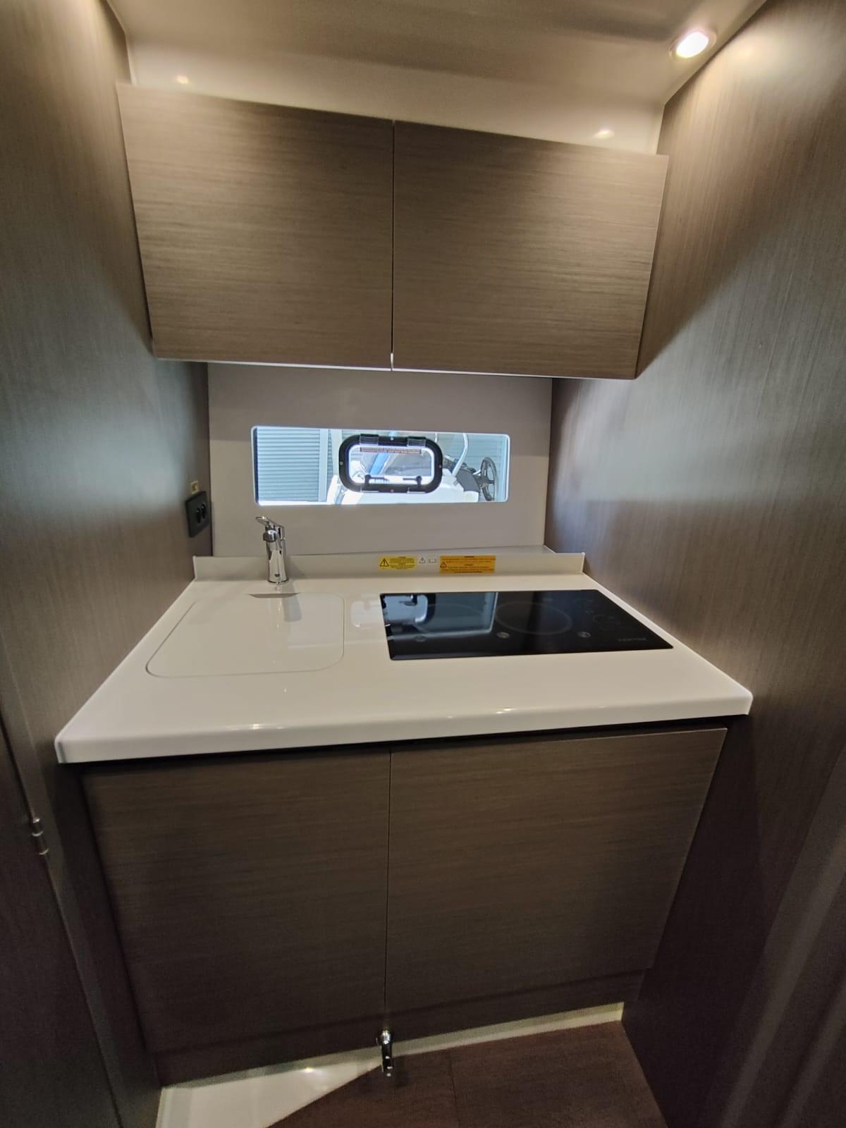 Alarme moteur, Alarme de pompe de cale, Ouverture du compartiment moteur électrique, Passavant en teck, Douche de cockpit, Flaps électriques, Hard top, Extincteur(s) fixe(s), Lavabo dans le cockpit, Éclairage de courtoisie, Spots sous-marins, Porte latérale, Cockpit en teck, Prise de quai, Connexion eau sous pression à quai, Guindeau électrique, Echelle de bain, Corne.