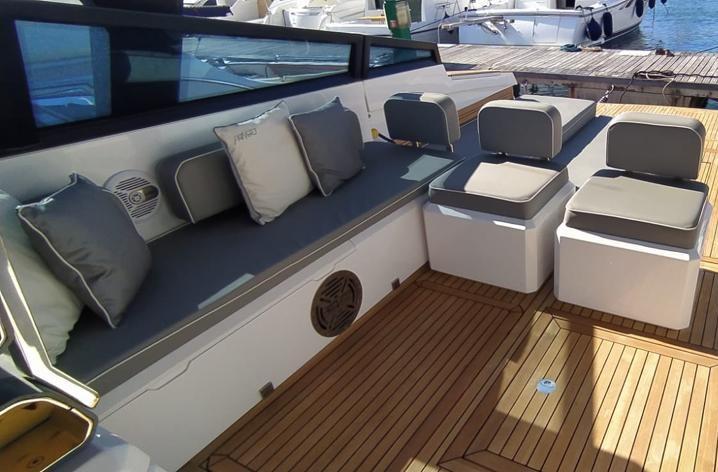 Alarme moteur, Alarme de pompe de cale, Ancre (Con estrazione elettro idraulica), Ouverture du compartiment moteur électrique, Auto Dynamic Trim Interceptor, Eau sous pression, Taquets pliants, Passavant en teck, Douche de cockpit, Flaps hydrauliques, Extincteur(s) fixe(s), Lavabo dans le cockpit, Éclairage de courtoisie, Spots sous-marins, Plateforme arrière (Trasformer di poppa + Estenzione murate), Pompe de cale automatique, Cockpit en teck, Prise de quai, Connexion eau sous pression à quai, Guindeau Hydraulique, table de cockpit (A scomparsa nel pozzetto), Table pliante de salon, T-Top (Con ptolunga oscurante).