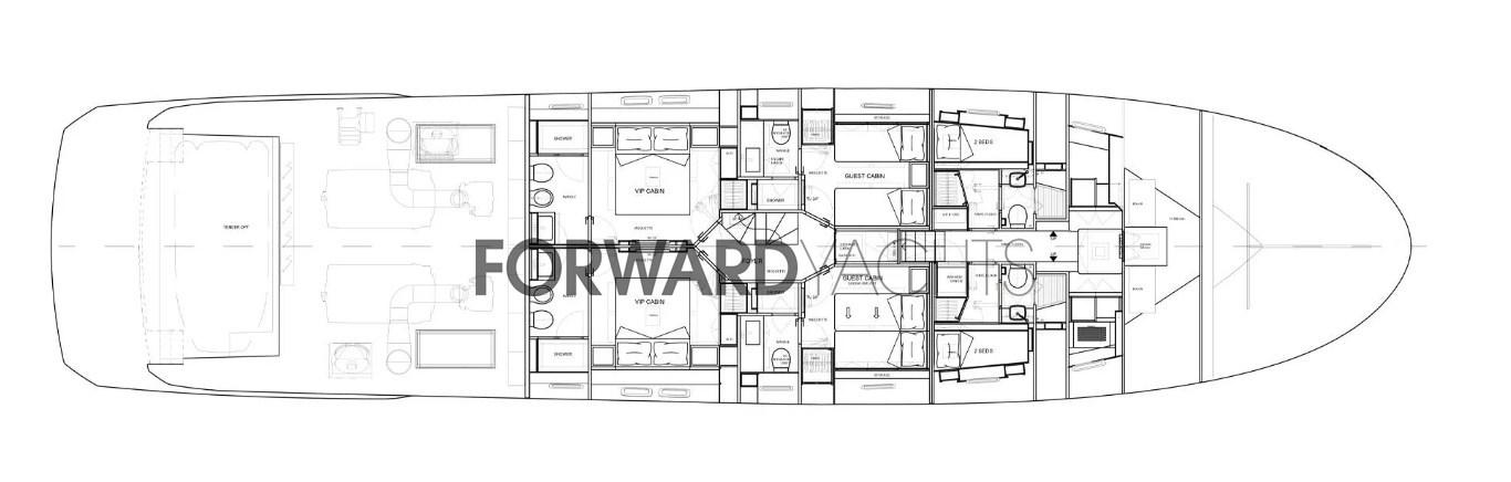 Espace nuit : 5 cabines (1 cabine principale sur le pont principal) + 3 cabines équipage.