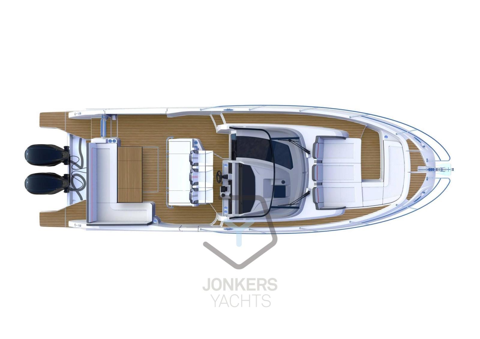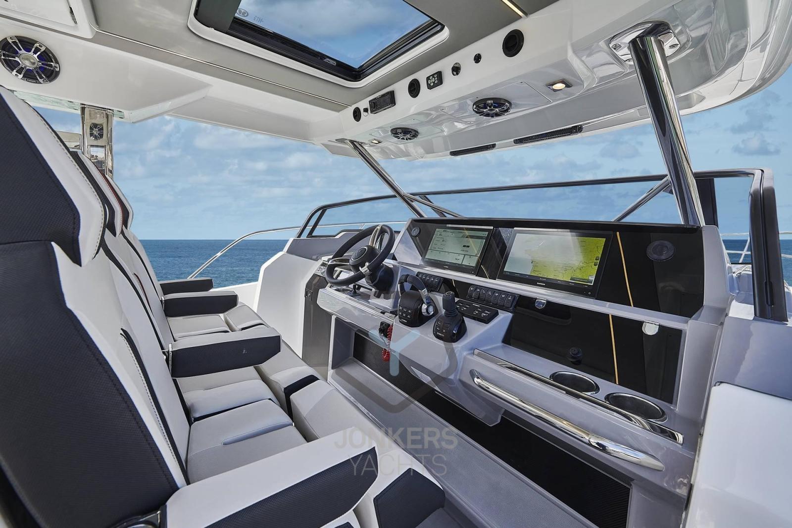 Une longueur maximale de 11,90 m et une largeur maximale de 3,58 m offrent des espaces de vie bien définis et une ergonomie parfaite dans une nouvelle approche du hors-bord à moteur.