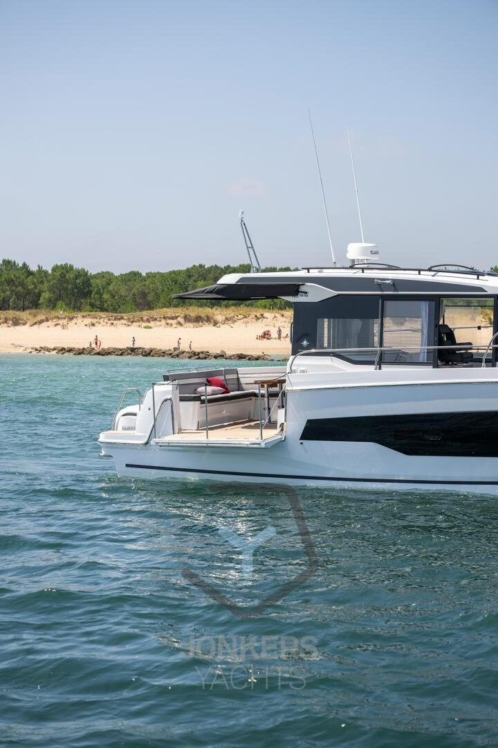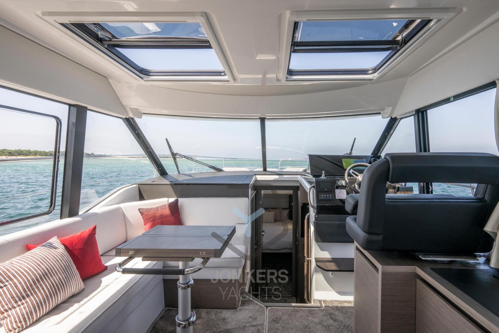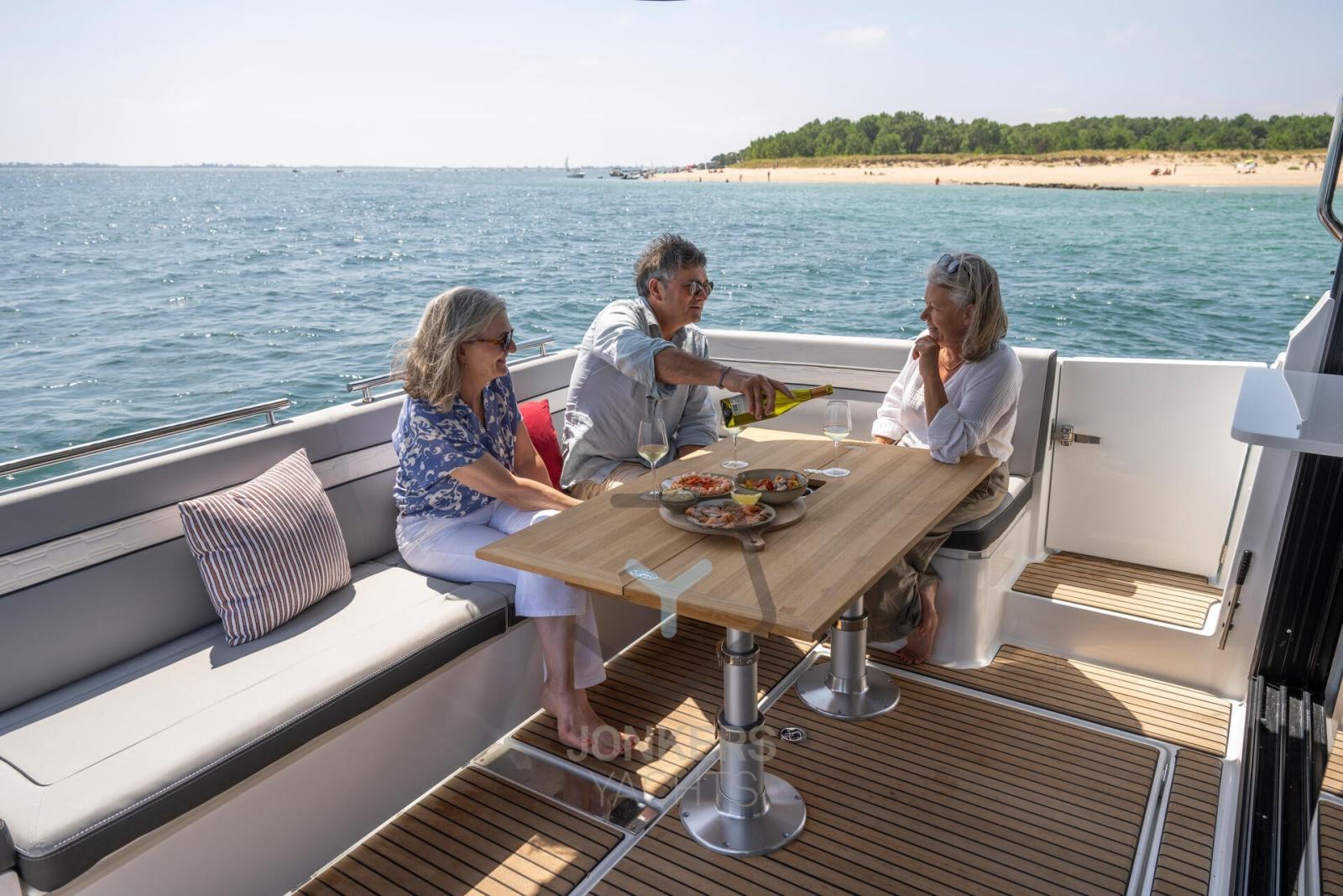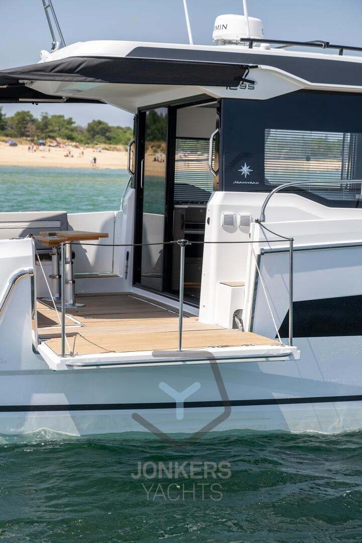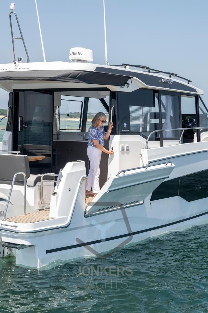 Ce Merry Fisher 1295 Fly dispose de plusieurs espaces de vie conçus spécifiquement pour se détendre en famille et entre amis. Beaucoup de temps pour nager et des moments avec les pieds dans l’eau depuis le cockpit arrière, avec le pont électrique sur le côté tribord. A bâbord, une grande porte latérale facilite l’accès pour tous à bord.