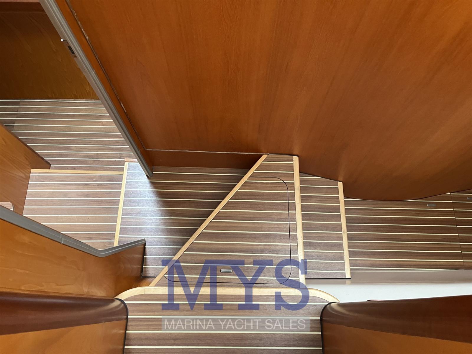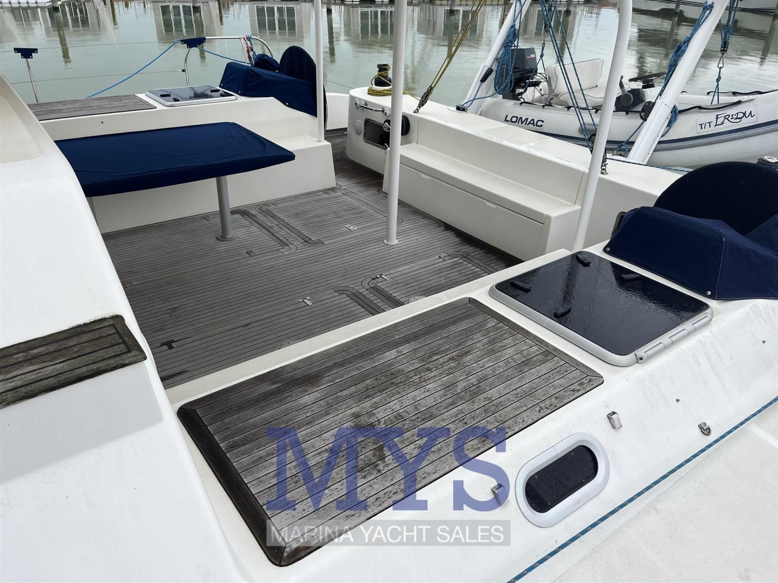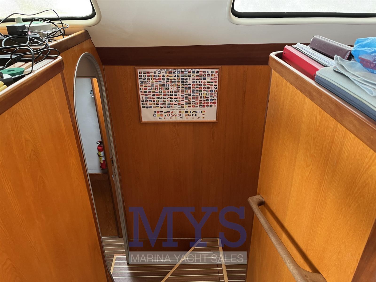Eau sous pression, 2 Chargeur de batterie, Douche de cockpit, Double barre à roue, Propulseur d'étrave (scafo sinistro), Bossoirs pour annexe (Strutturali), Compresseur de plongée (Per bombole sub - gavone di prua), Éclairage de courtoisie, Moteur d'annexe (Yamaha 30 hp), Passerelle, Pompe de cale manuelle, Porte latérale, Cockpit en teck, Prise de quai, Connexion eau sous pression à quai, Guindeau électrique, Gréement monotoron, Echelle de bain, table de cockpit, Annexe, Corne, 4 Winch électrique.