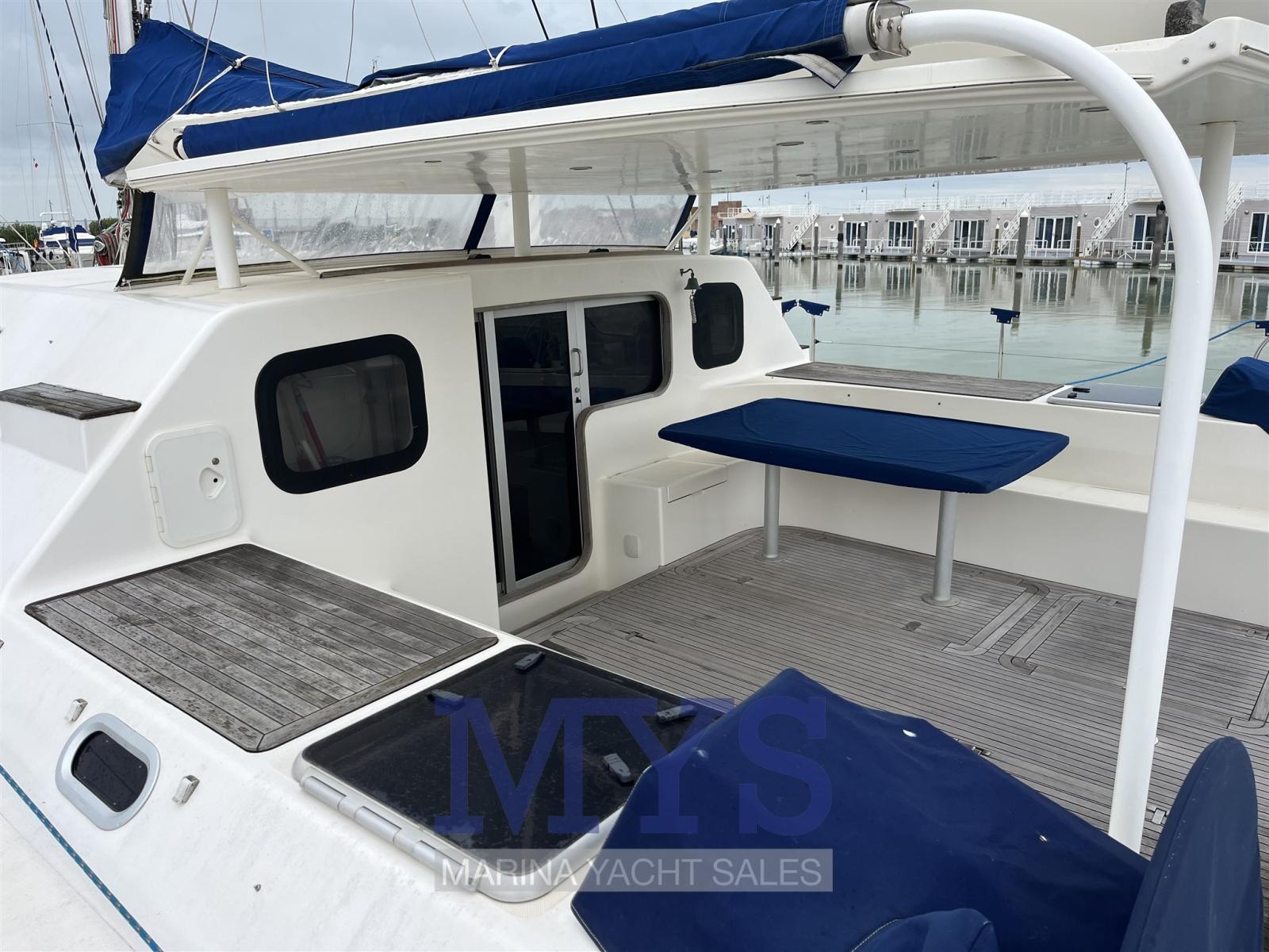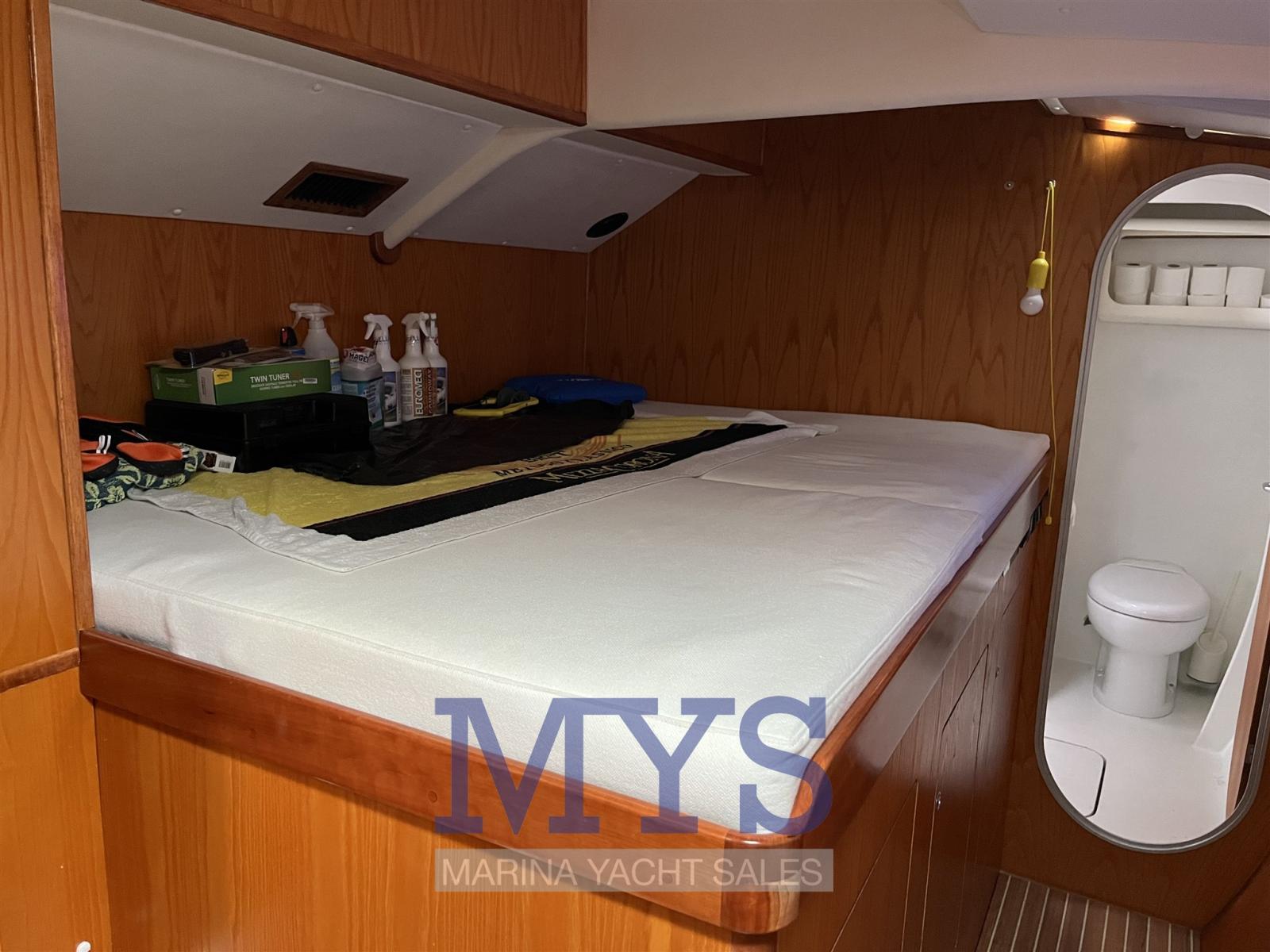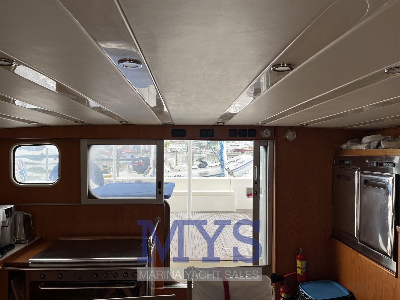 Eau sous pression, 2 Chargeur de batterie, Douche de cockpit, Double barre à roue, Propulseur d'étrave (scafo sinistro), Bossoirs pour annexe (Strutturali), Compresseur de plongée (Per bombole sub - gavone di prua), Éclairage de courtoisie, Moteur d'annexe (Yamaha 30 hp), Passerelle, Pompe de cale manuelle, Porte latérale, Cockpit en teck, Prise de quai, Connexion eau sous pression à quai, Guindeau électrique, Gréement monotoron, Echelle de bain, table de cockpit, Annexe, Corne, 4 Winch électrique.