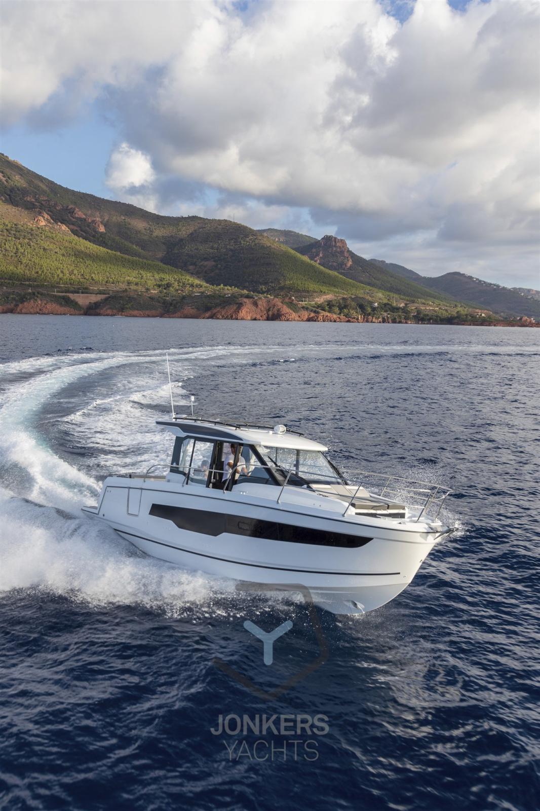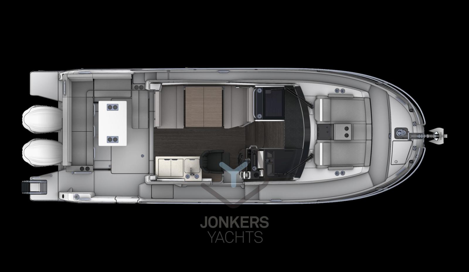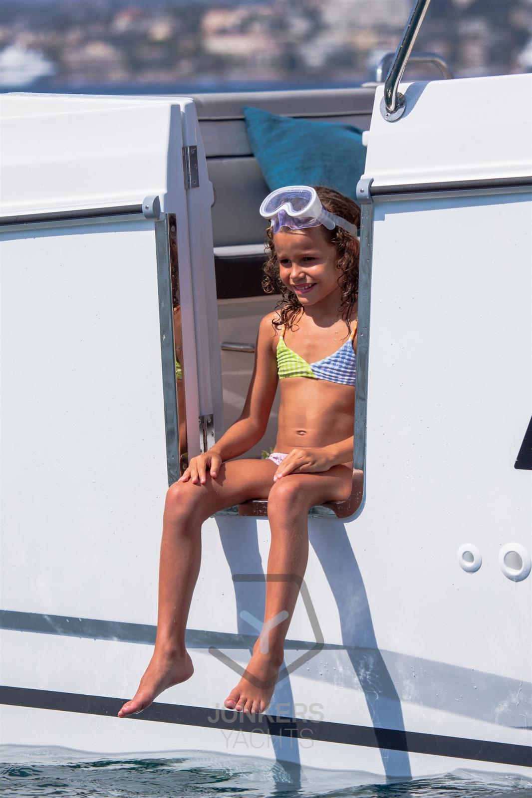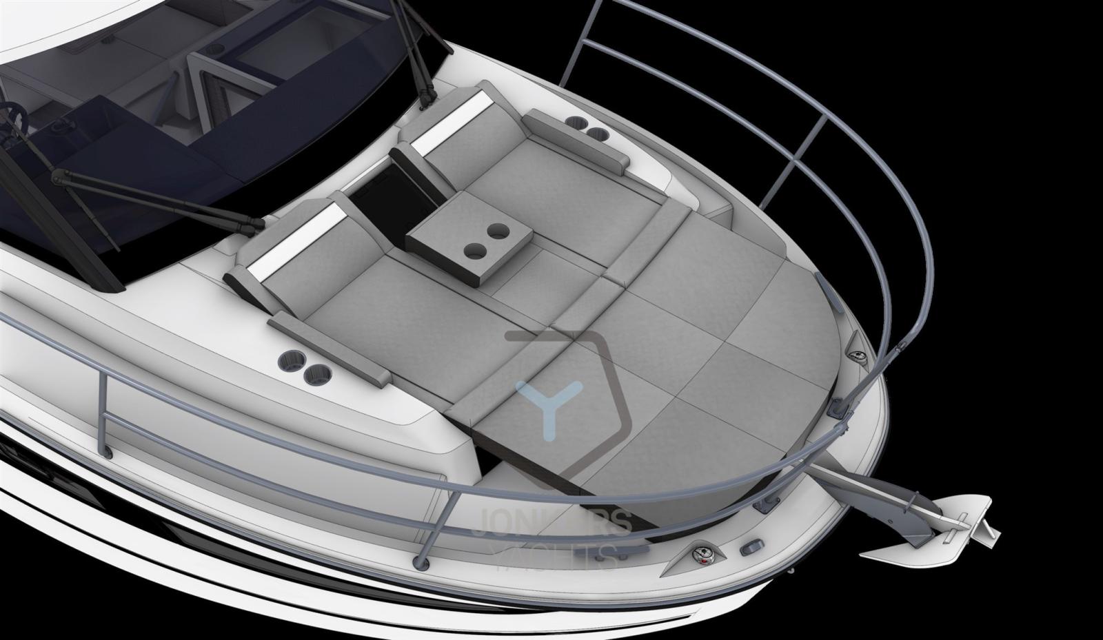 Les grandes fenêtres de la coque et le toit du roof s’intègrent parfaitement dans la silhouette puissante et sportive. La nouvelle coque permet de planer à partir de 20 nœuds, une vitesse facilement atteinte avec ses deux moteurs, 2 x 250 CV à vitesse maximale, apportant confort et maniabilité.