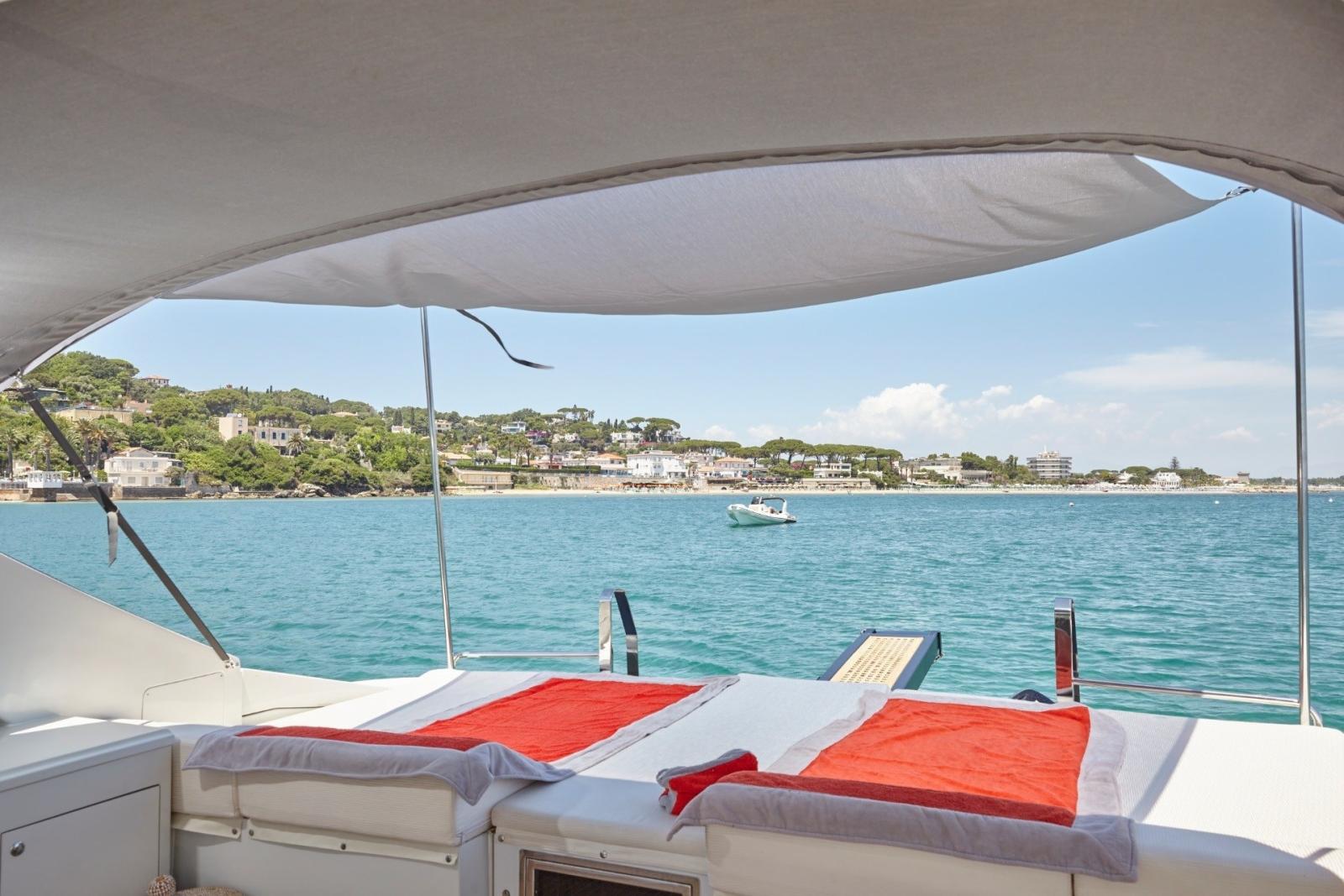 Alarme moteur, 5 Batteries (del 2023), Douche de cockpit, Flaps hydrauliques, Hard top, Extincteur(s) fixe(s), Spots sous-marins, Passerelle, Plateforme arrière, Cockpit en teck, Prise de quai, Guindeau électrique, Echelle de bain, table de cockpit.