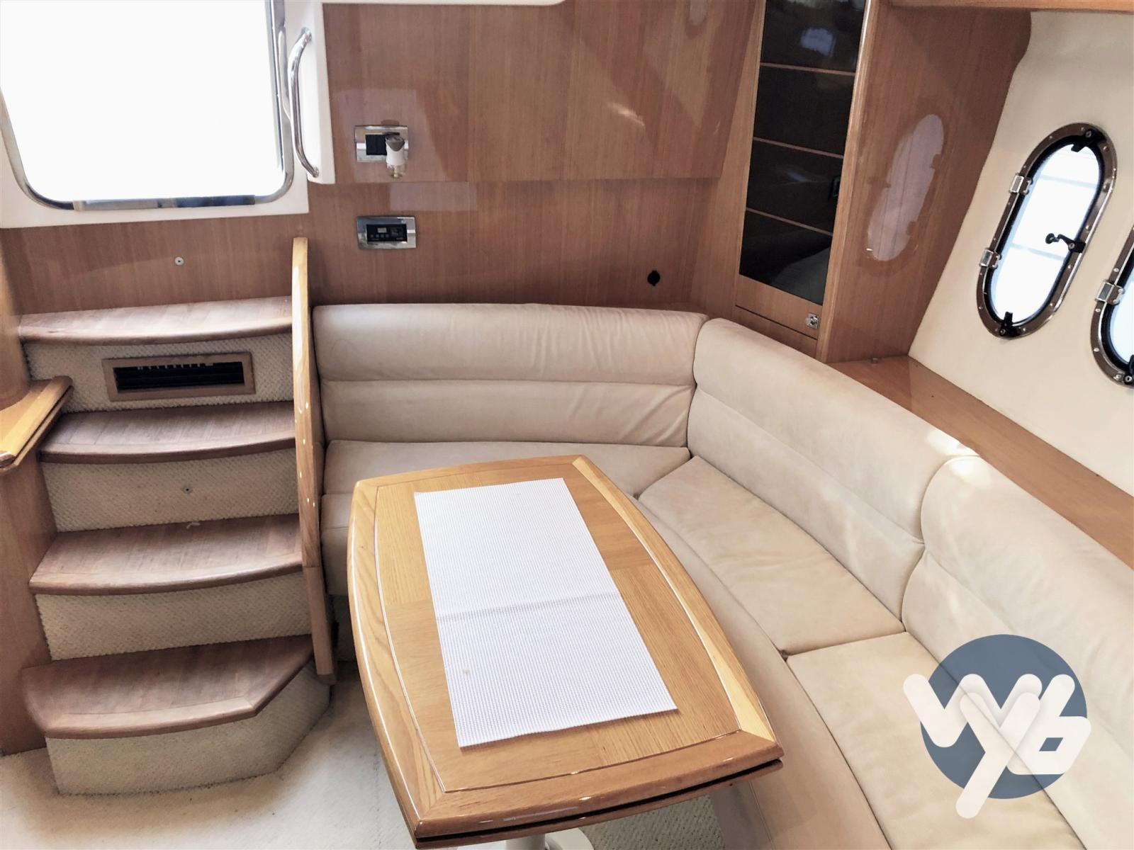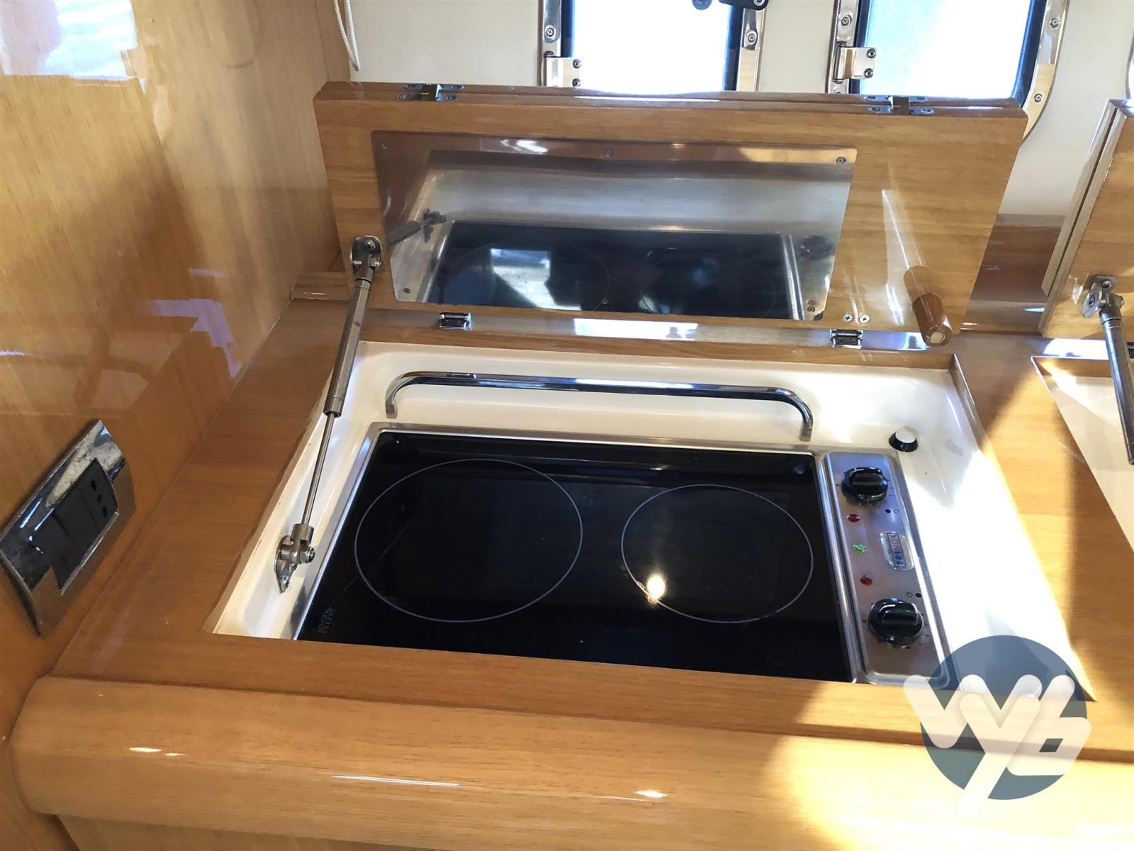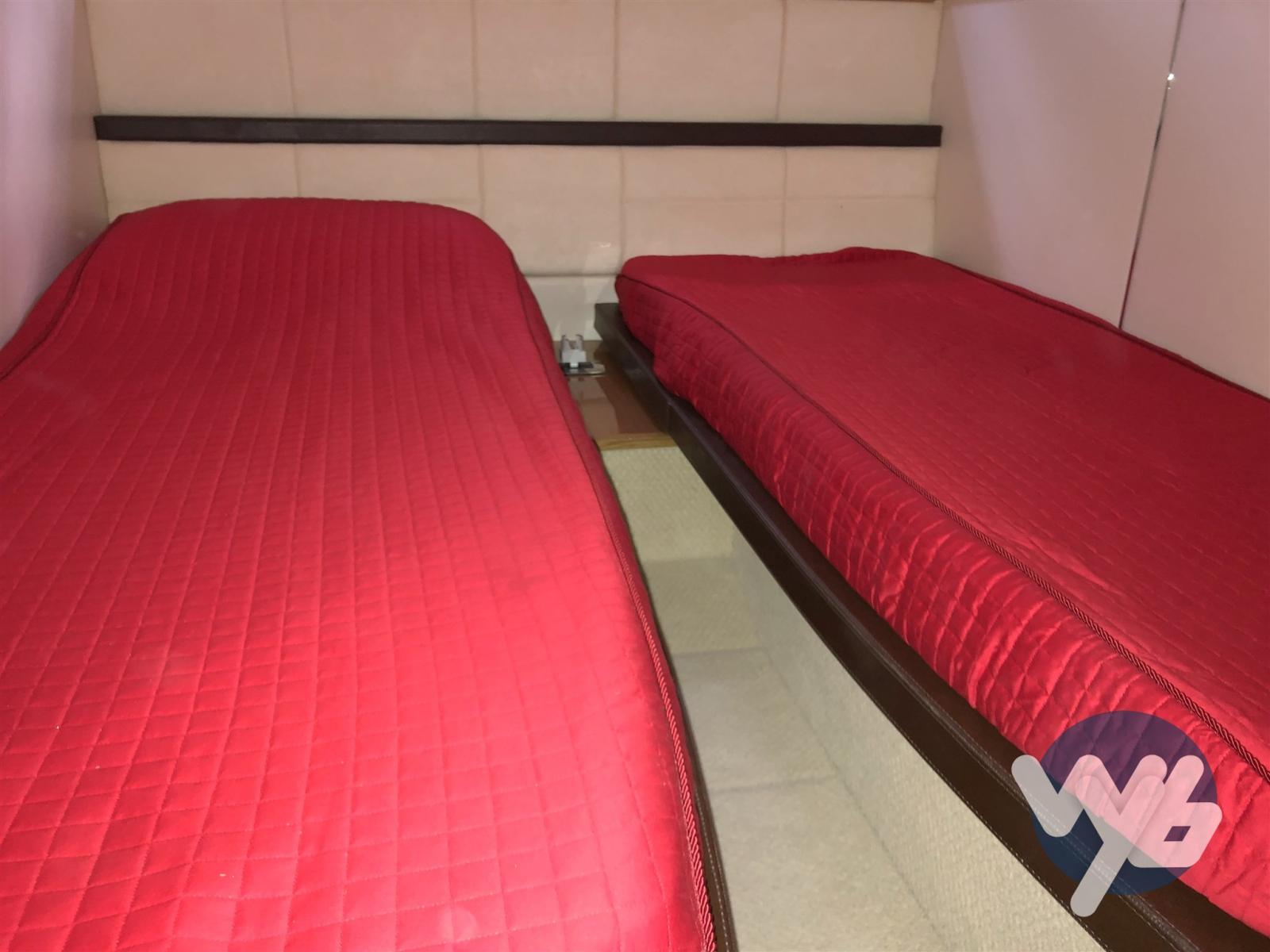 Toit rigide en excellent état. Cabine double à l’avant, lits plats cabine invités, deux salles de bains. Hangar hydraulique à l’arrière, propulseur d’étrave. Électronique complète. Nouveaux coussins..