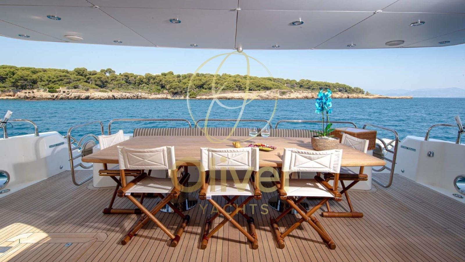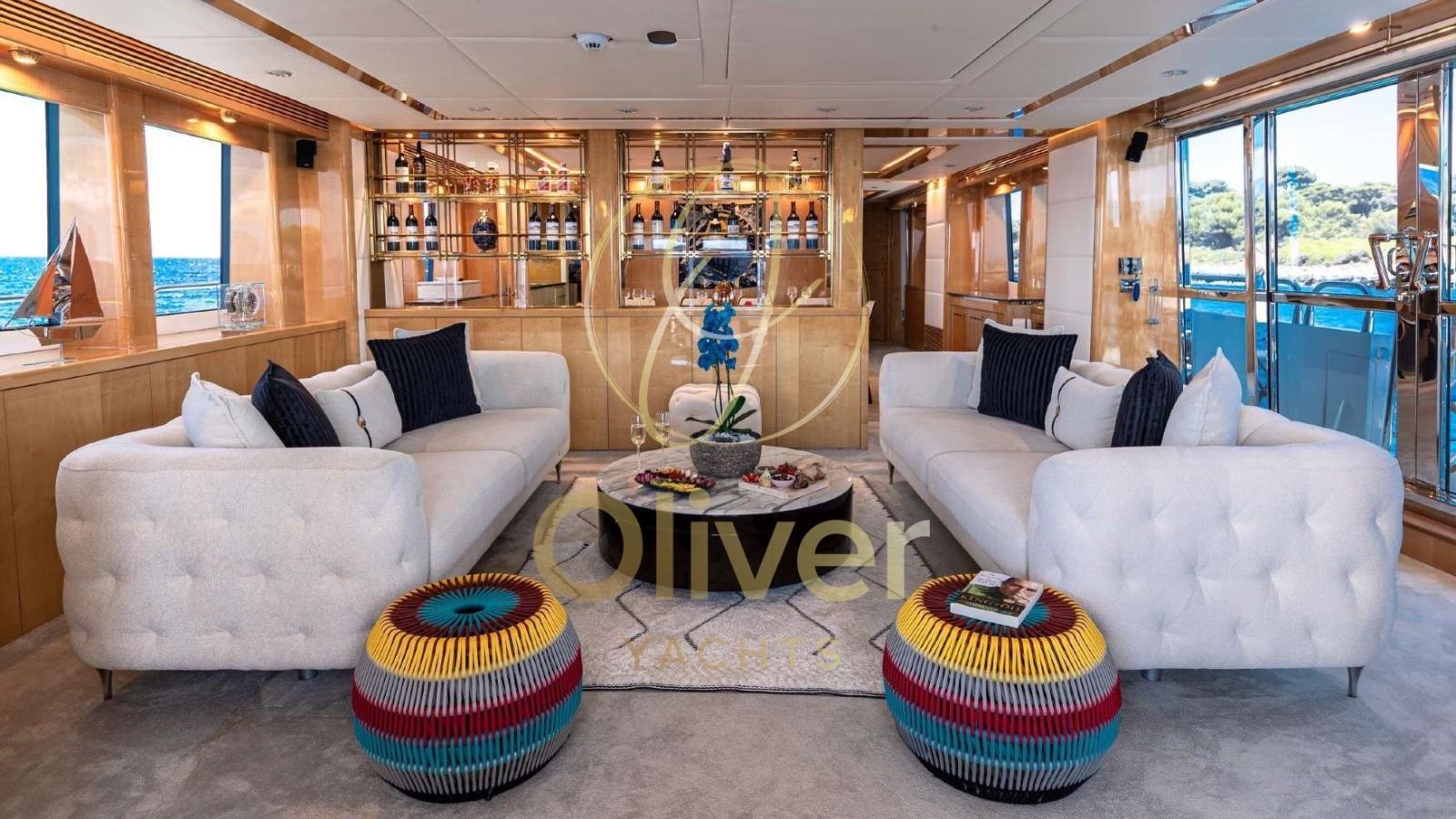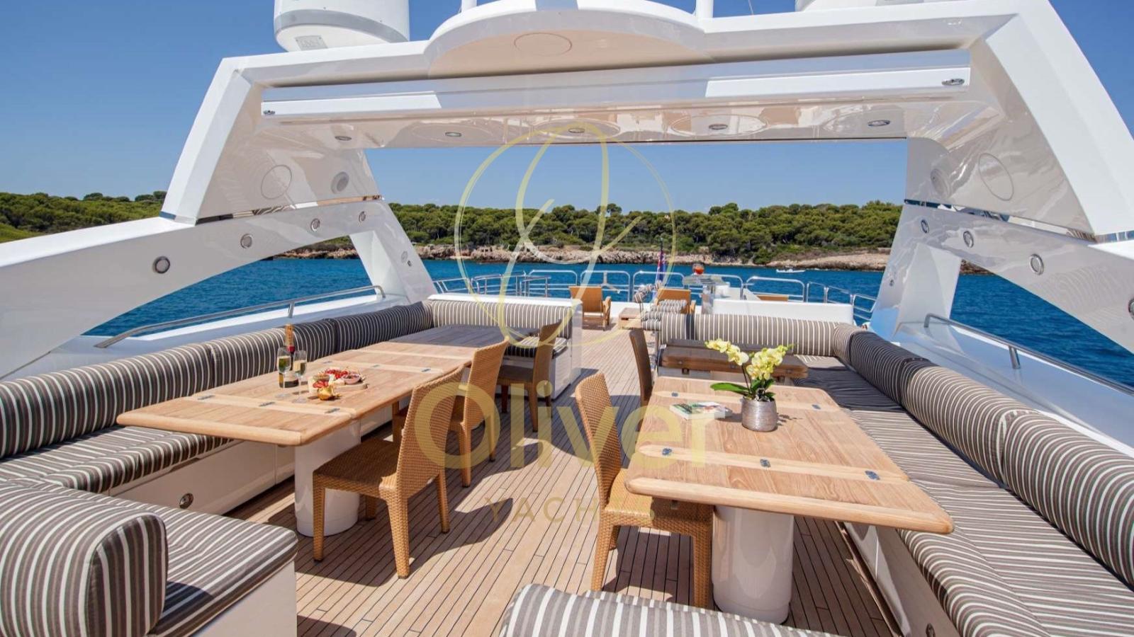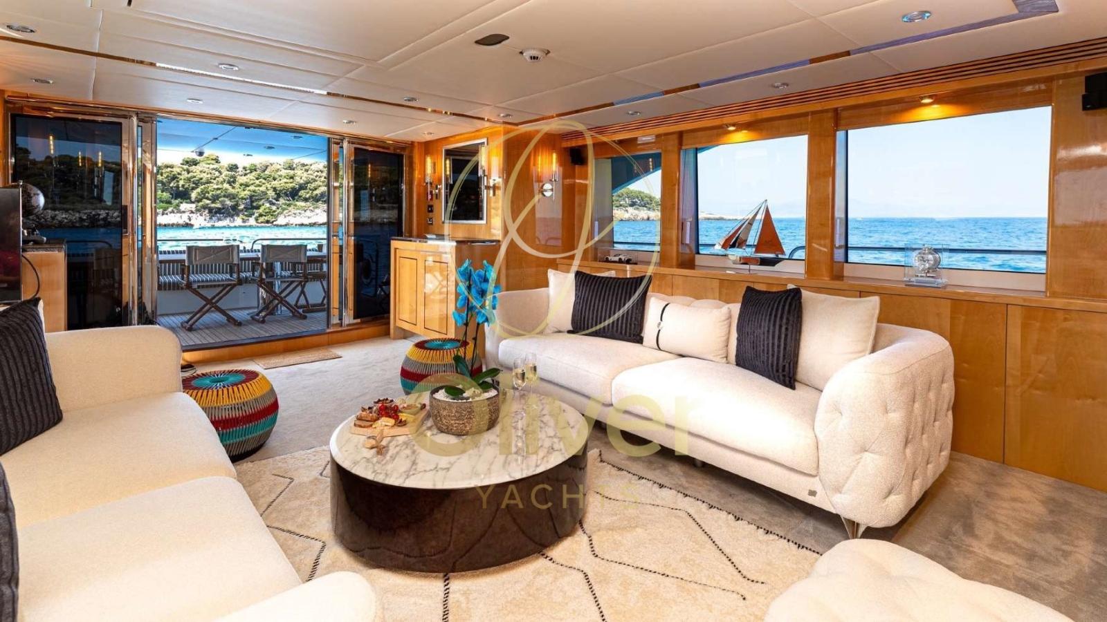 Les clients peuvent profiter d’un impressionnant flybridge avec un toit rétractable, un bar équipé et des zones de bronzage. Le pont principal offre des espaces pour les repas en plein air, tandis que les espaces intérieurs sont meublés avec des matériaux de haute qualité et une esthétique contemporaine. L’aménagement vous permet d’accueillir jusqu’à 8 personnes dans 4 cabines avec salle de bain, dont une suite propriétaire sur le pont principal.