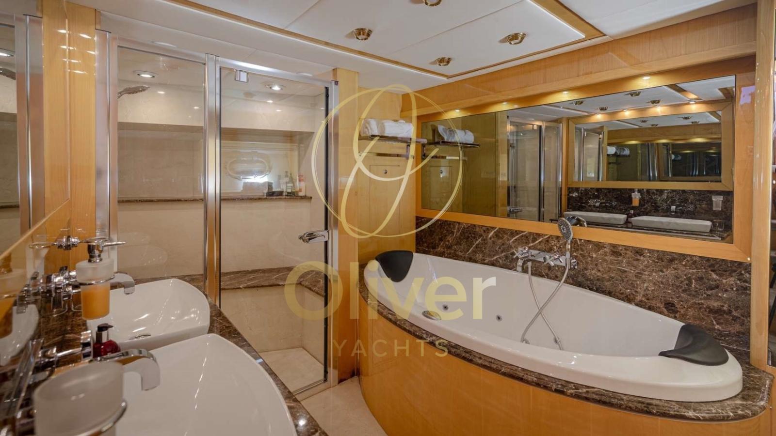La suite du propriétaire, située sur le pont principal, est une véritable oasis de luxe. Il est équipé d’un lit king-size, d’armoires spacieuses et d’une salle de bains privative avec des finitions raffinées. Sur le pont inférieur, il y a une cabine VIP pleine largeur et deux cabines doubles, toutes avec salle de bain attenante, pour assurer l’intimité et le confort des clients.