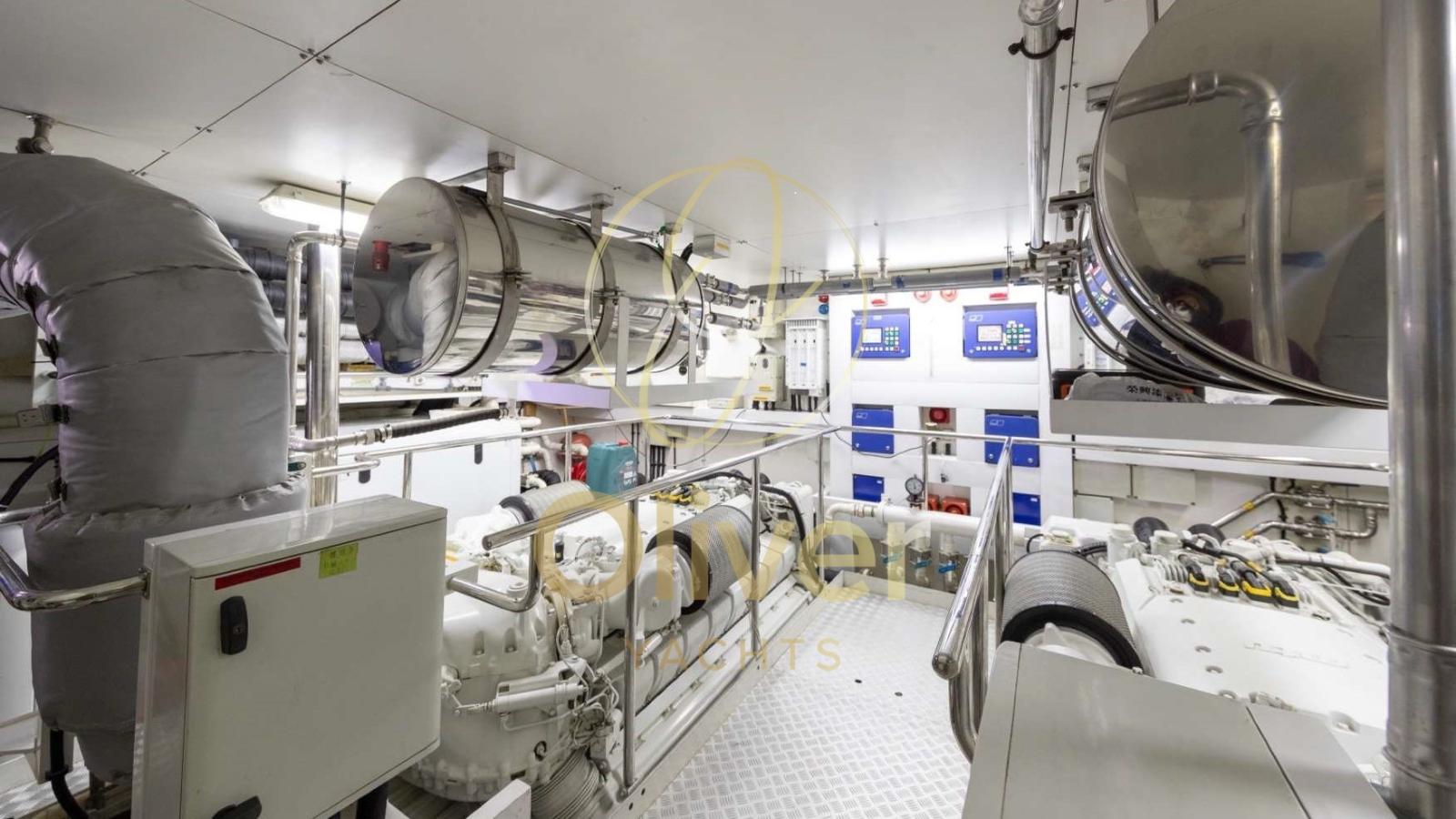 Équipé de deux moteurs MTU 12V 2000 M93, il est capable d’atteindre une vitesse maximale de 26 nœuds, avec une vitesse de croisière de 18 nœuds, ce qui le rend idéal pour une navigation rapide et confortable. Avec une capacité de carburant de 19 500 litres et un réservoir d’eau douce de 4 000 litres, le yacht est conçu pour les croisières à moyenne et longue distance.